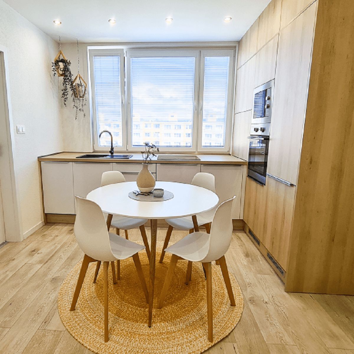 Masă de dining ELCAN NEW Material: MDF/lemn Culoare: alb/fag Dimensiuni (diametru x h): 80x75 cm Design modern Livrată nemontată.