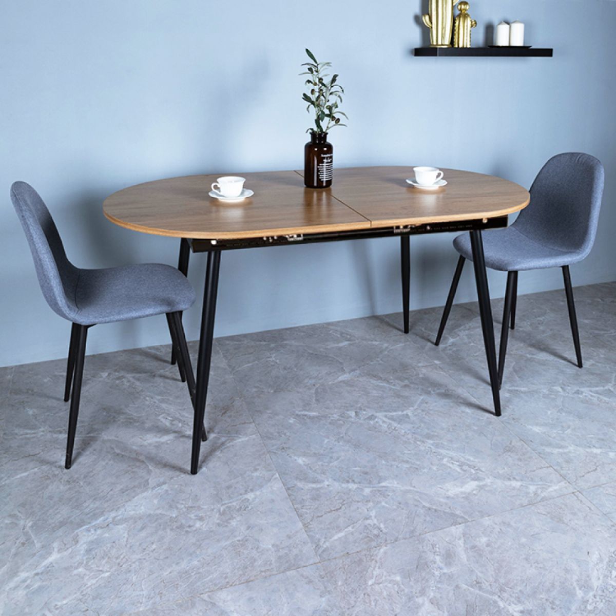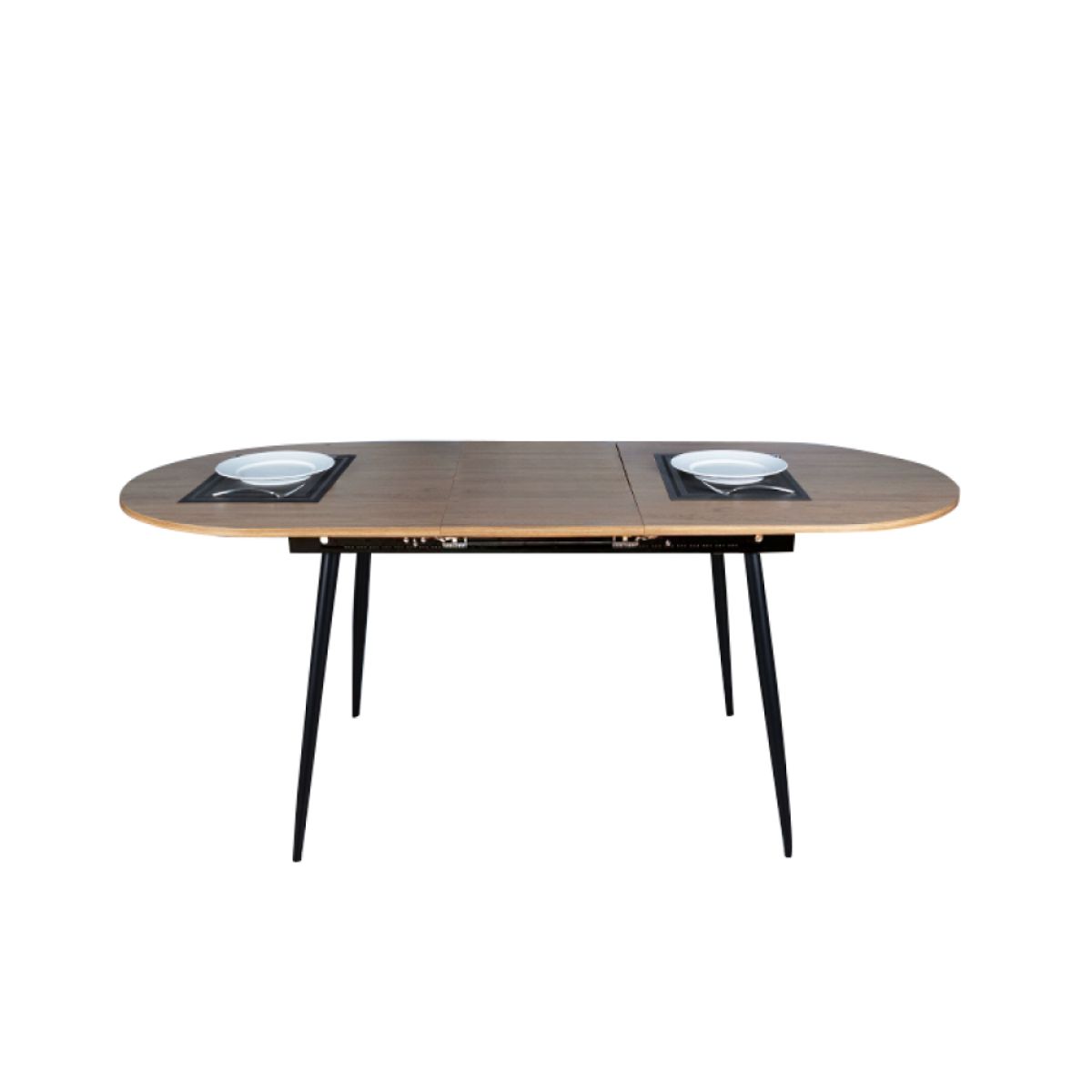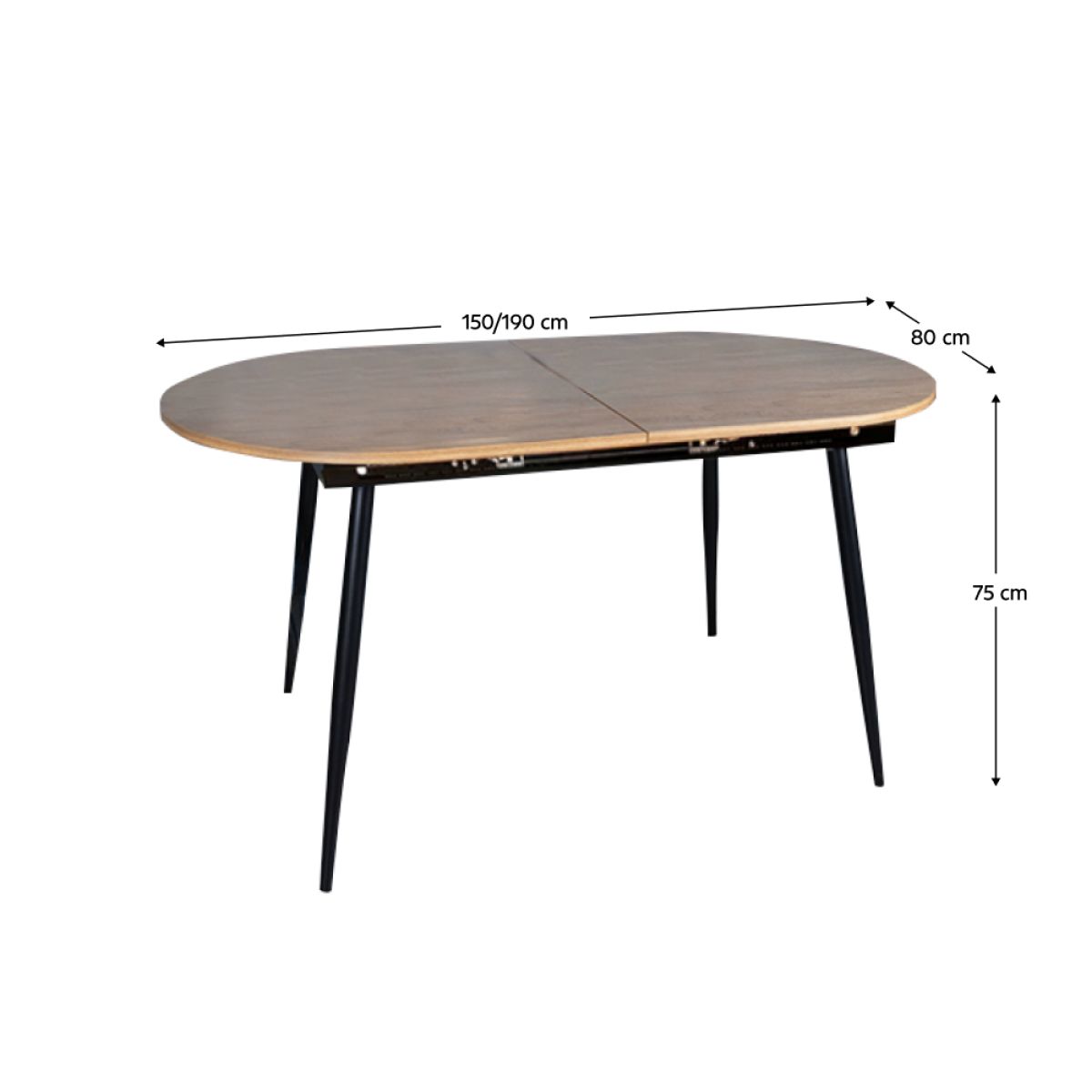 Material cadru: metal Culoare cadru: neagră Blatul mesei: MDF laminat Culoare: stejar Dimensiuni (LxAxÎ): 150-190x80x75 cm Grosimea materialului plăcii superioare: 1,8 cm Extensibilă Simplă Design clasic Picioare metalice Uşor de întreţinut Cu glisoare pentru protecţia podelei Potrivită pentru 6-8 persoane Capacitate de încărcare: 50 kg Livrată dezasamblată