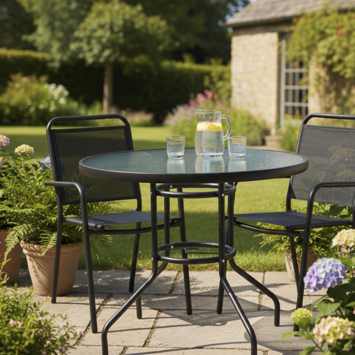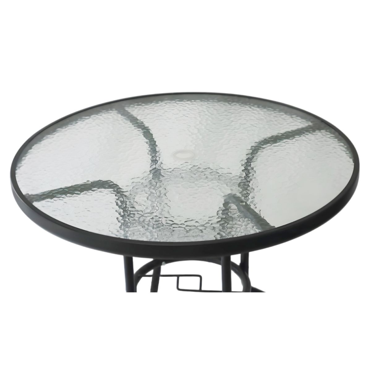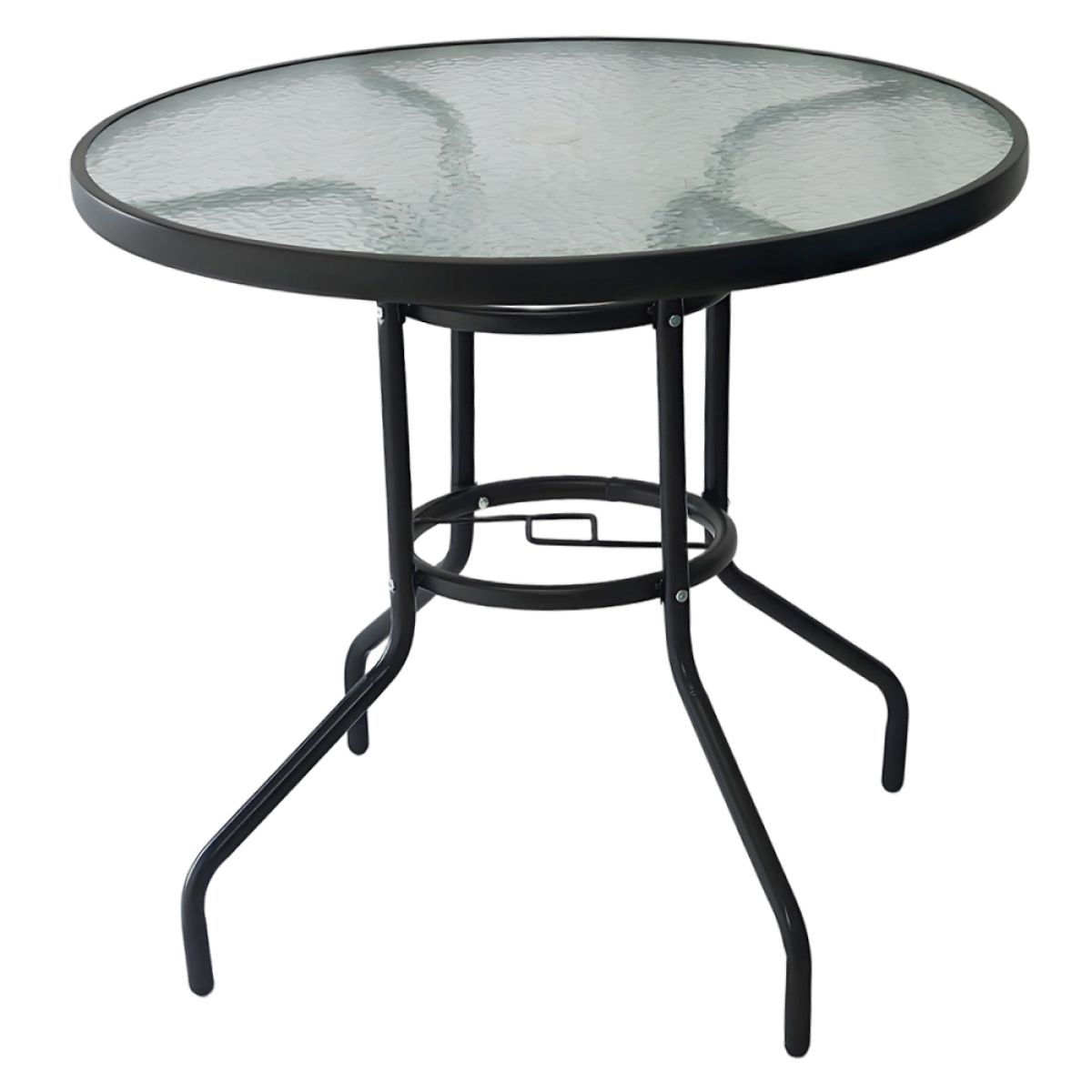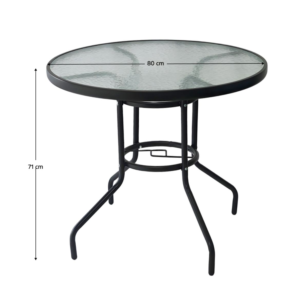 Masă grădină BORGEN NEW TYP 2 potrivită pentru setul de grădină, Material: sticlă securizată/oţel Culoare: negru Dimensiuni (lxAxh): 80x80x71 cm Cu orificiu pentru umbrela de soare Rotundă Portanţă: 50 kg Livrat dezasamblat