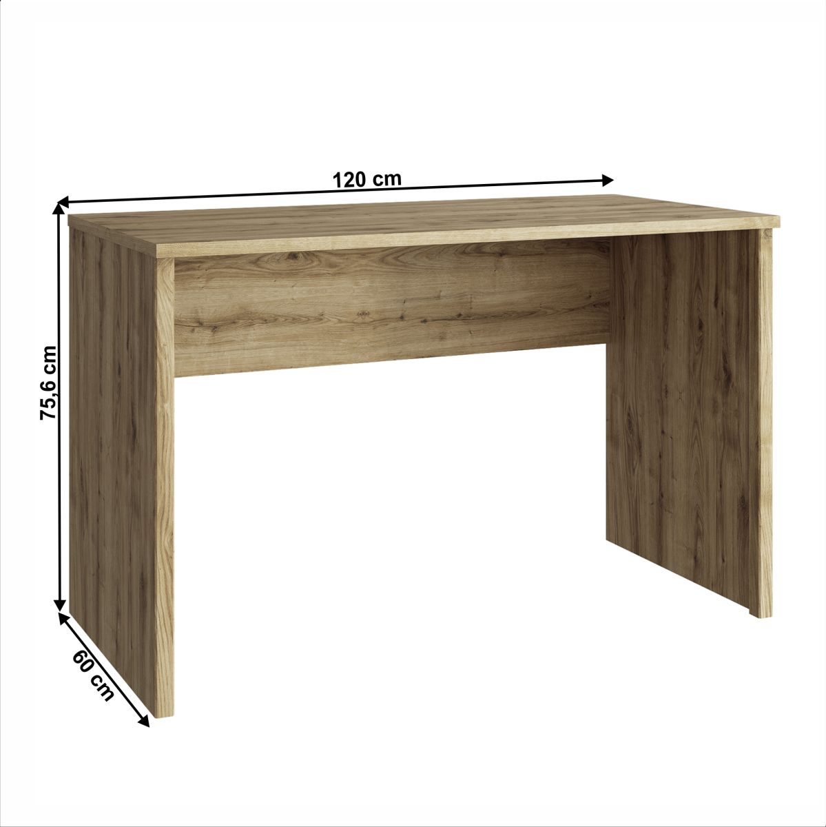 "Masă PC DORSI 120 Material: DTD laminat/MDF Culoarea: stejar navarra Dimensiuni (LxAxÎ): 120x60x75,6 cm Grosimea materialului: 1,6 cm Mânere din plastic Culoarea mânerului: neagră Design modern Livrat în formă dezasamblată"
