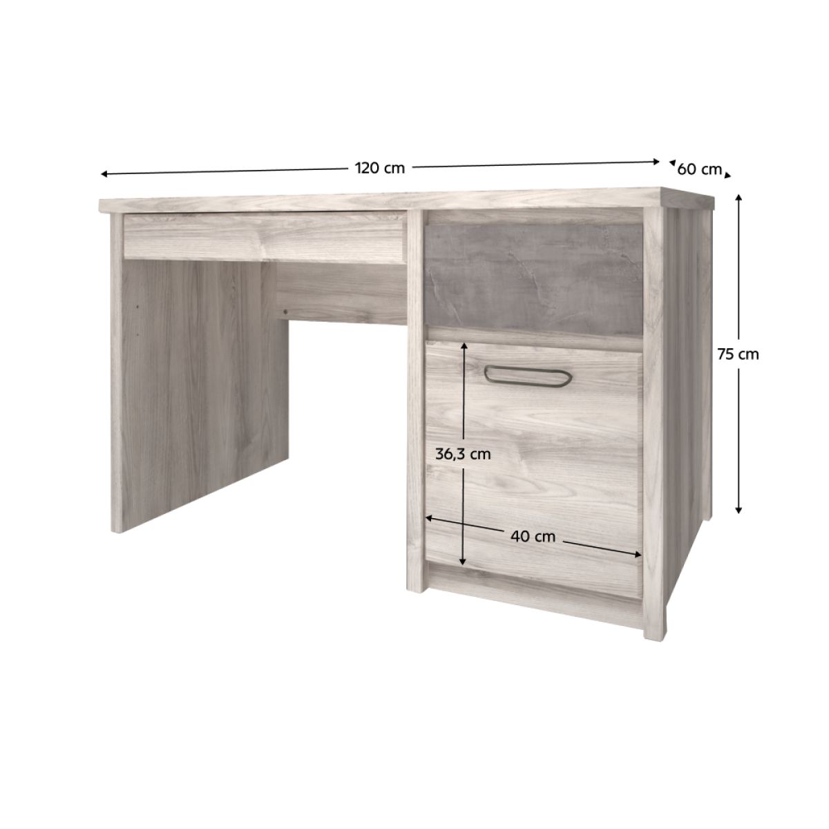 Material: PAL melaminat Culoare: castan Nairobi / onix Dimensiuni (LxAxÎ): 120x75x60 cm Grosime material: 1,6-3,2 cm Mânere metalice Culoare mânere: neagră Cu sertar Capacitate sertar: 3 kg Dulap cu uşă Cu suport glisant pentru tastatură Universală Picioare din plastic Design modern Livrată dezasamblată