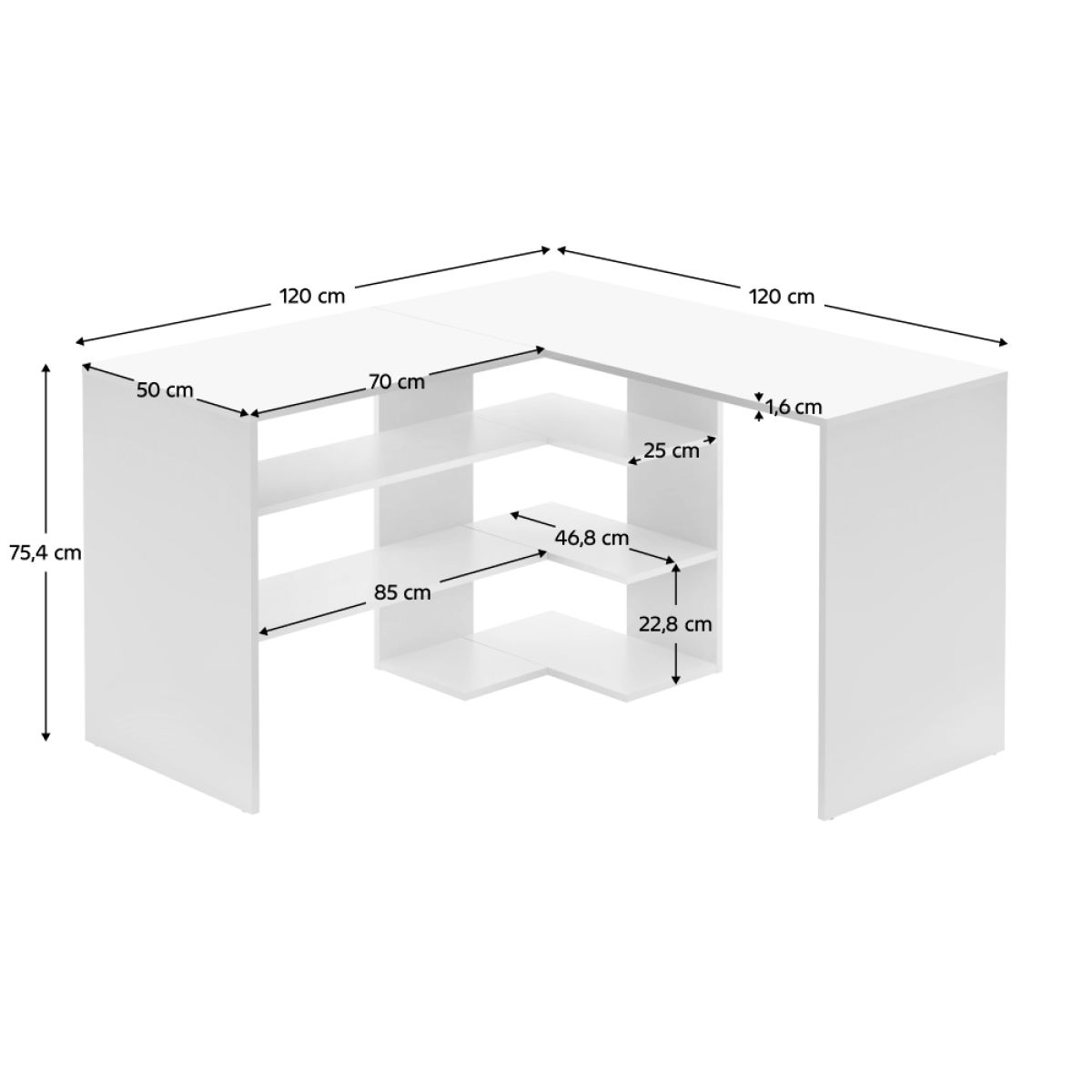 Material: DTD laminat Culoare: albă Dimensiuni (Lxlxh): 120x120x75,4 cm Grosimea materialului: 1,6 cm Colţ Spaţiu de depozitare deschis Cu poliţe Înălţime între rafturi: 22,8 cm Portanţa poliţei: 5 kg Portanţa mesei: 35 kg Picioare din plastic - glisoare Produs slovac de calitate Livrat dezasamblat