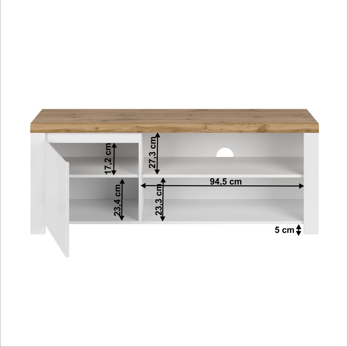 Material: DTD laminat/ canturi ABS/ MDF Culoare: alb foarte lucios/ stejar wotan Dimensiuni (LxAxÎ): 156x41,5x61 cm Înălţimea spaţiului inferior de la podea: 5 cm Grosimea materialului: 1,6 până la 2,2 cm Un dulap cu uşă În dulap, rafturi Înălţimea primului raft: 17,2 cm Înălţimea celui de-al doilea raft: 23,4 cm Spaţiu de depozitare deschis cu raft Dimensiuni spaţiu deschis inferior (LxÎ): 94,5x23,3 cm Înălţimea spaţiului deschis: 27,3 cm Orificiu de ieşire a cablului Uşă din MDF Livrată dezasamblată