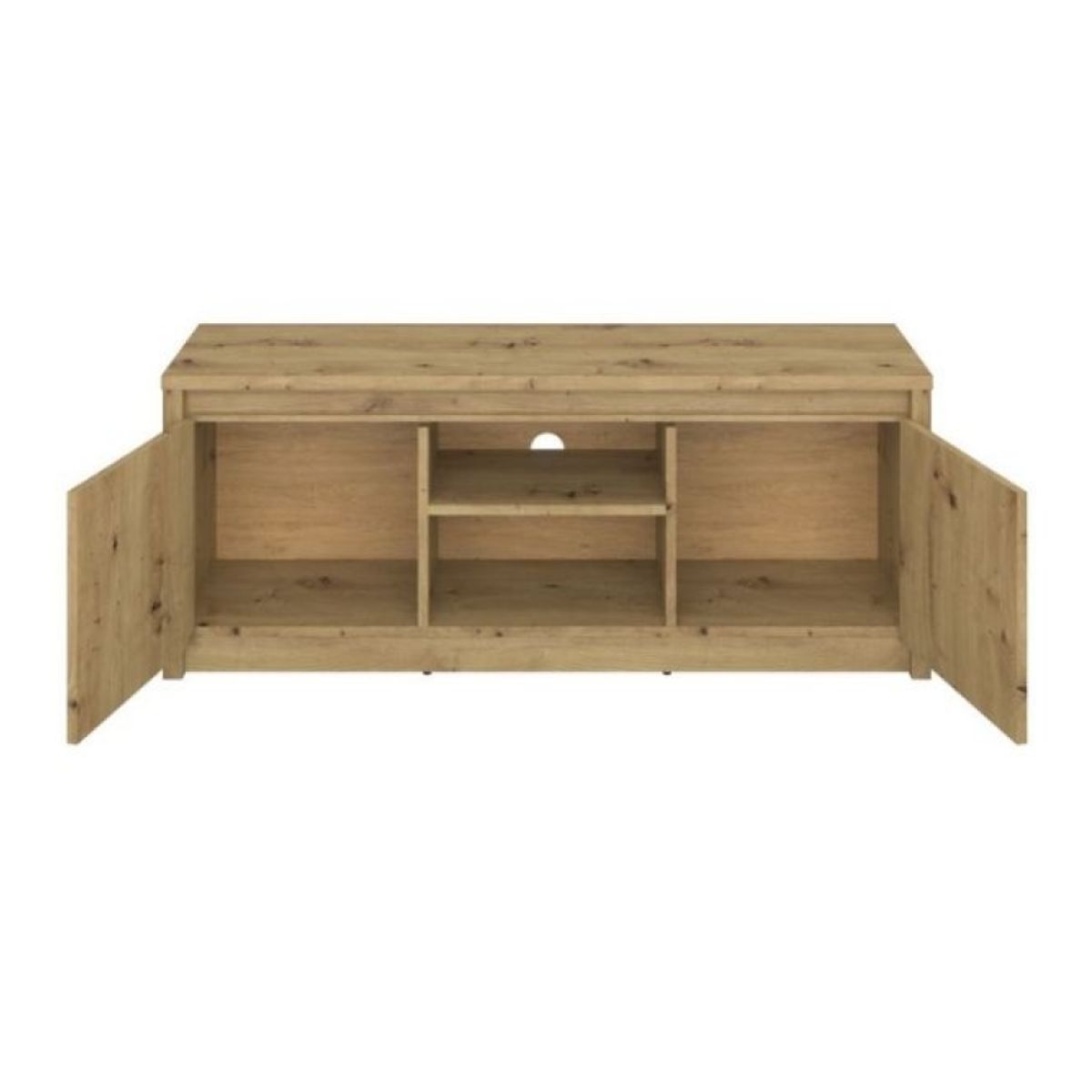 Material: PAL melaminat / margini ABS Culoare: stejar Artisan Dimensiuni (LxAxÎ): 125,4x36,2x50 cm Grosimea materialului: 1,6-3,2 cm Mânere din plastic Culoarea mânerelor: neagră Spaţiu de depozitare deschis cu raft Două dulapuri Picioare din plastic Orificiu pentru cabluri Design modern Livrată dezasamblată