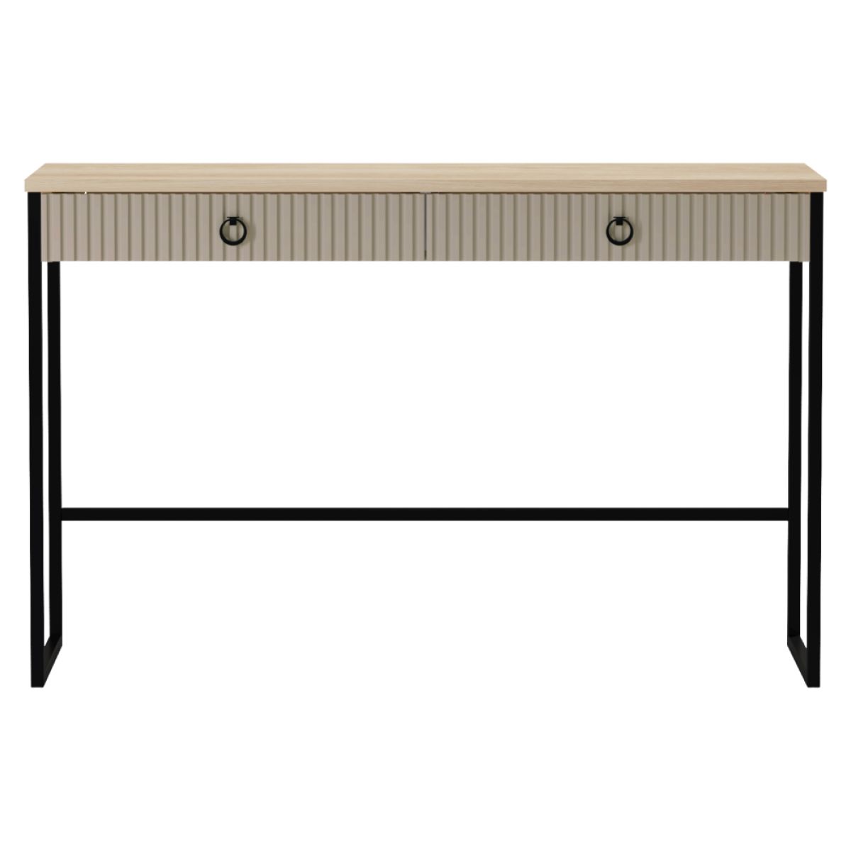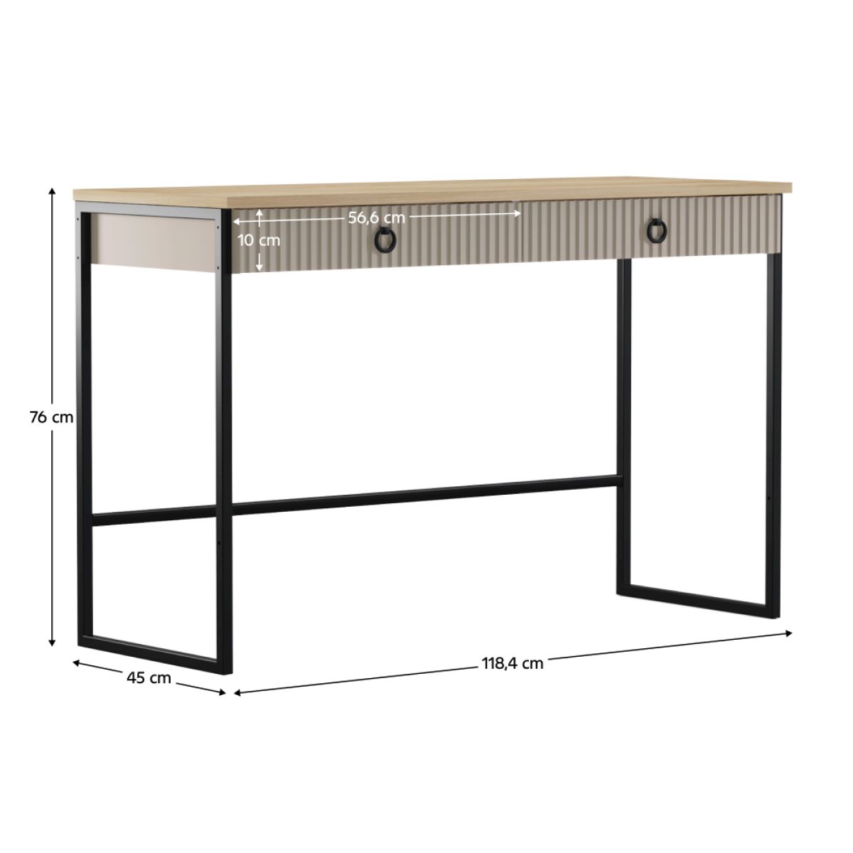 Material: MDF laminat DTD/înfoliat Culoare: gri-maroniu Taupe/stejar silverjack Dimensiuni (lxAxh): 118,4x45x76 cm Grosimea materialului DTD: 1,6-1,8 cm Grosimea materialului MDF: 1,9 cm Două sertare Portanţă placă superioară: 10 kg Portanţă sertar: 3 kg Cu mânere Material mâner: metal Culoare mâner: negru mat Pe picioare Înălţimea picioarelor: 12 cm Material picior: plastic Culoare picior: negru mat Uşi decorative frezate Design modern Recomandăm fixarea pe perete Livrat dezasamblat
