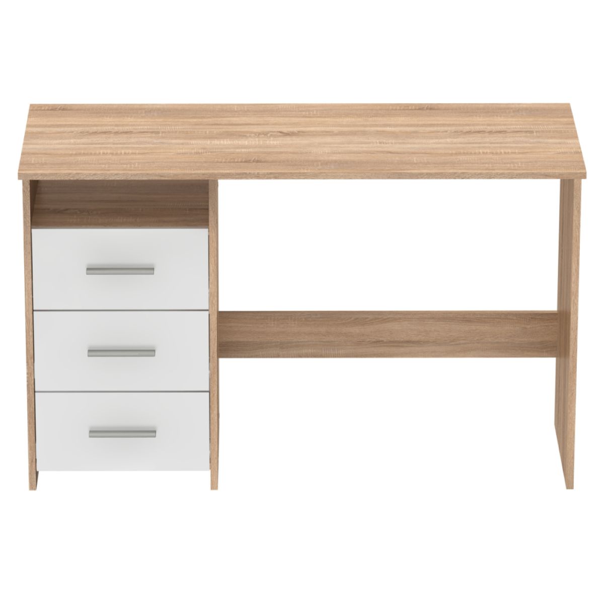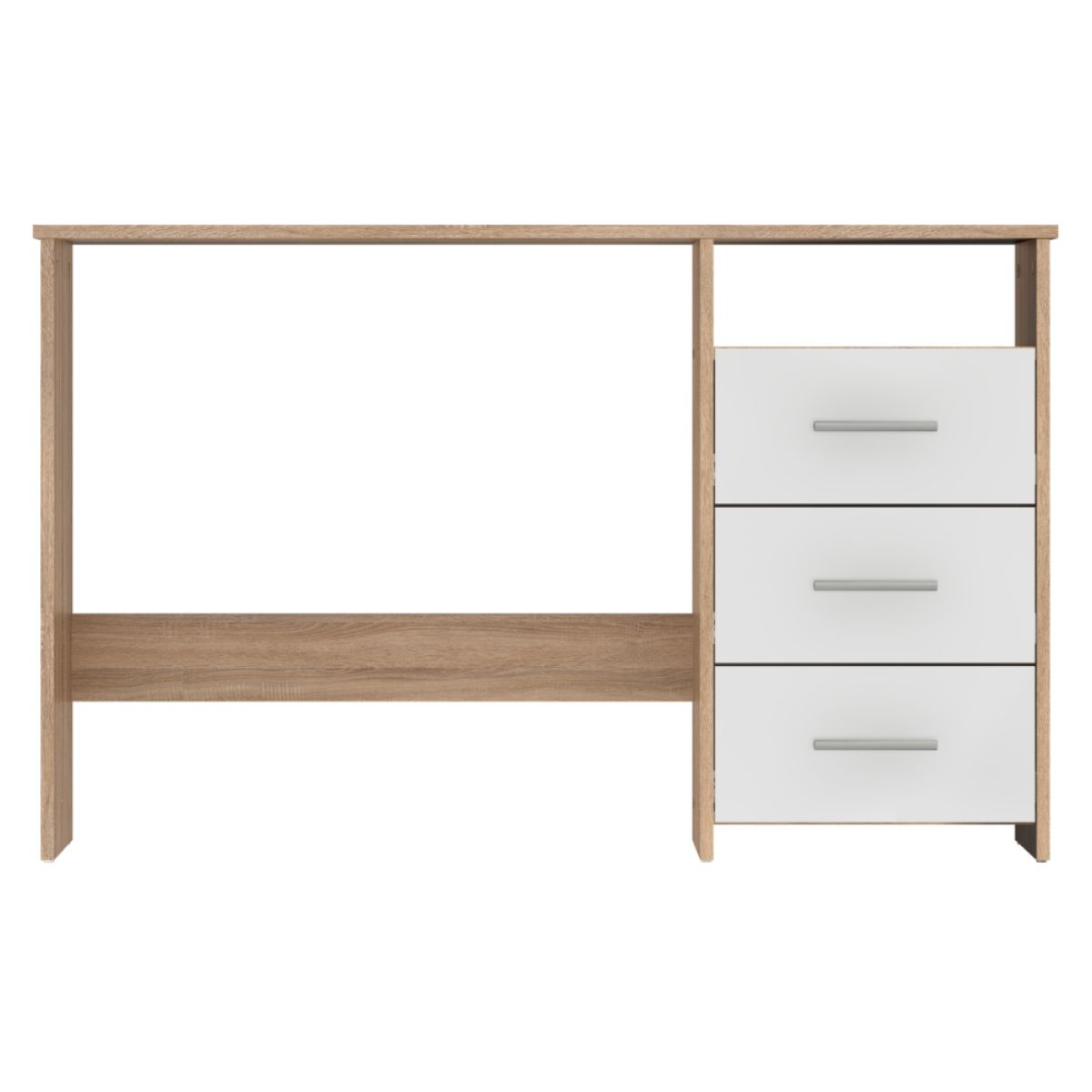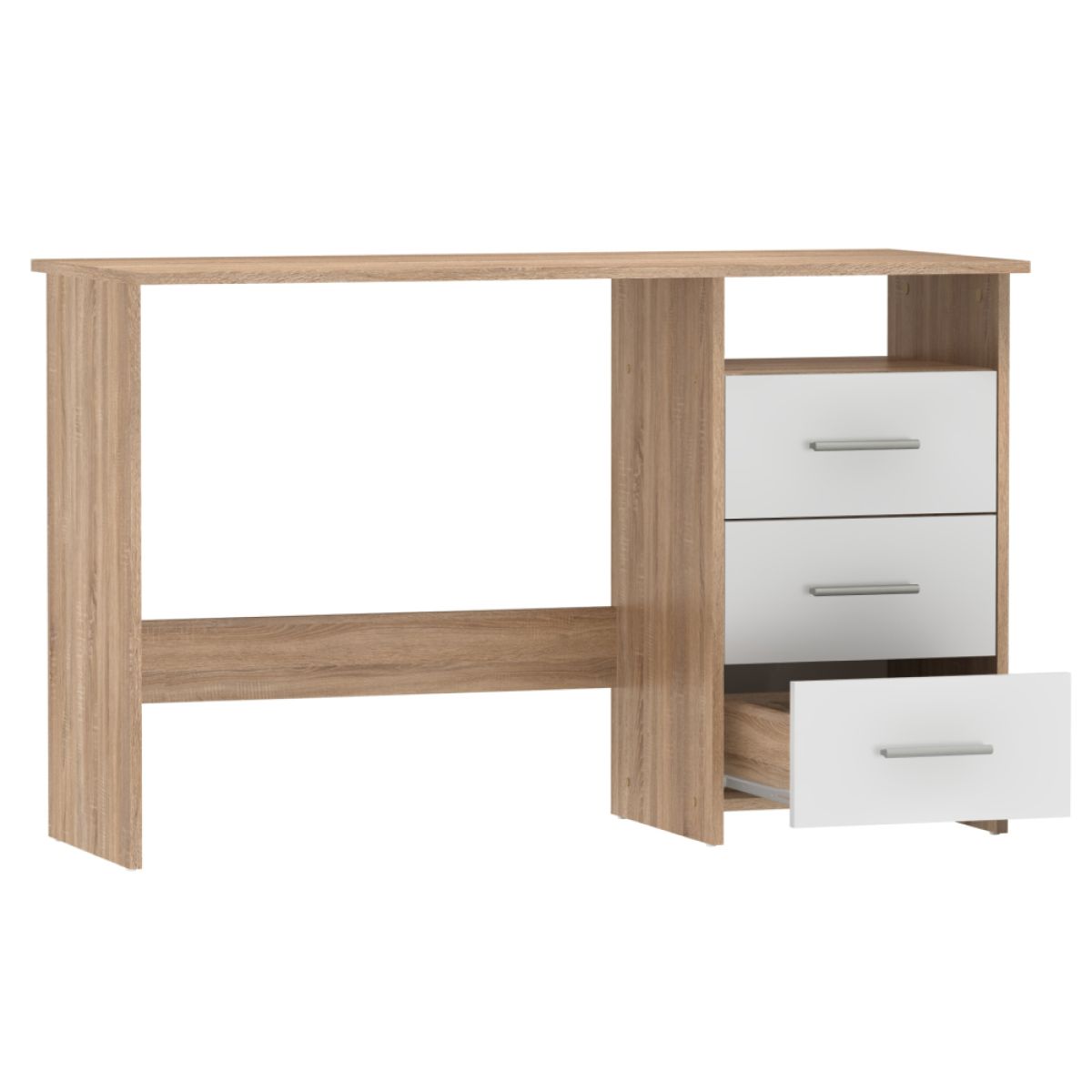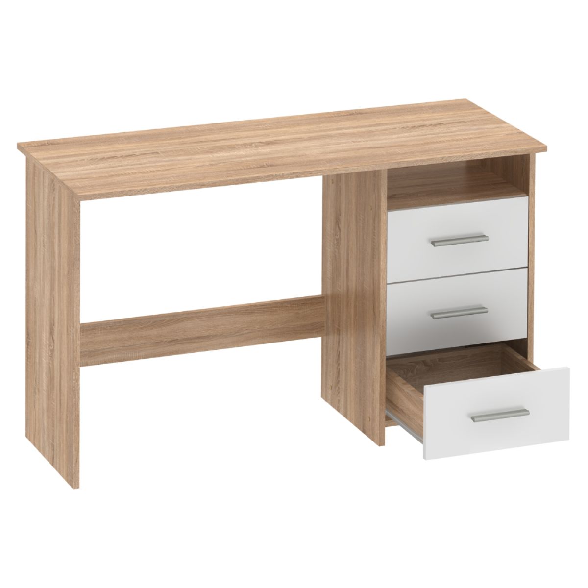Material: PAL înfoliat Culoare: stejar sonomă/alb Dimensiunile mesei (LxAxH): 123x50x76,5 cm Dimensiunile sertarelui (LxH): 39,5x18,7 cm Dimensiunile spaţiului deschis (LxH): 39,5x13 cm Grosimea materialului: 15 mm Model universal S/D 3 sertare Raft deschis Se livrează demontat
