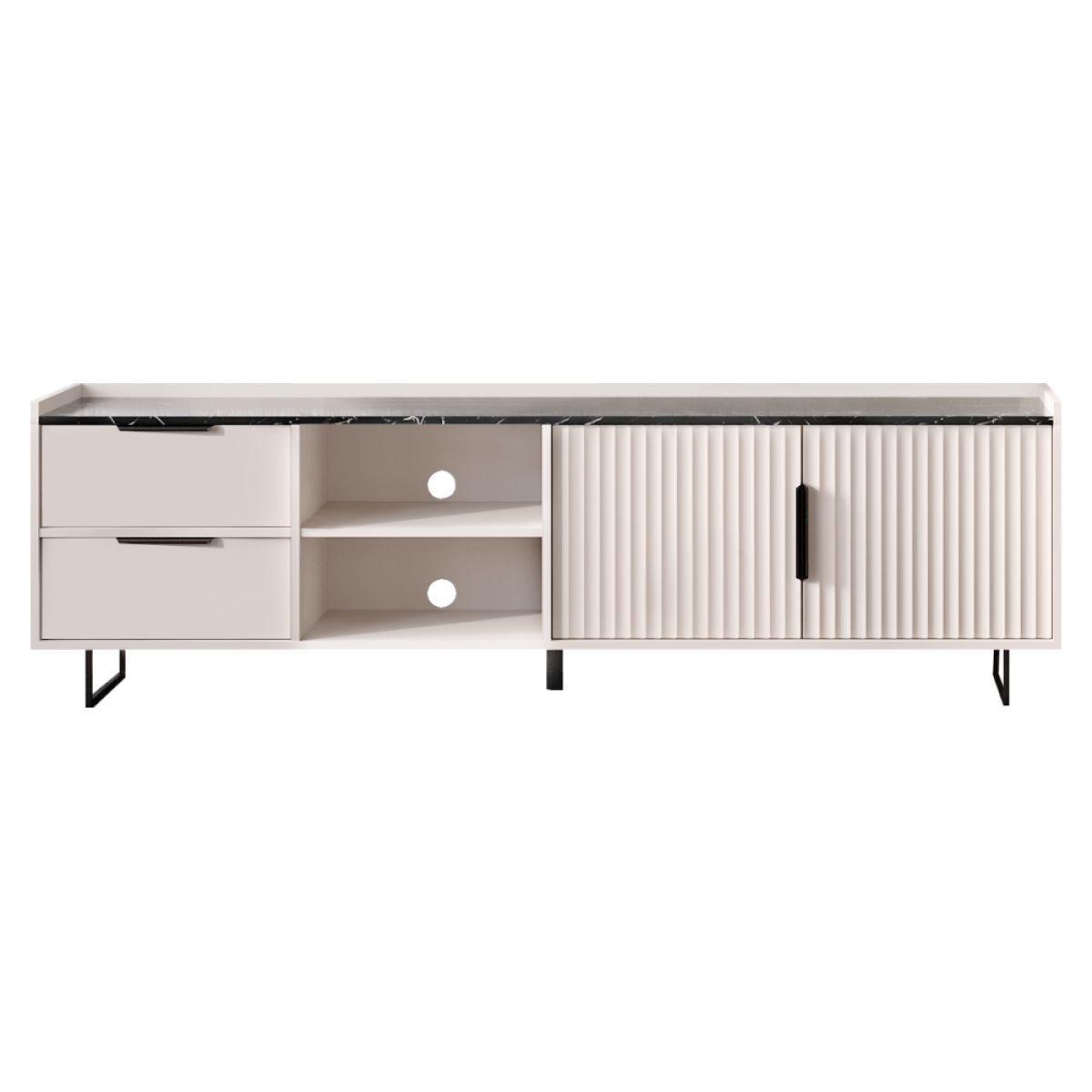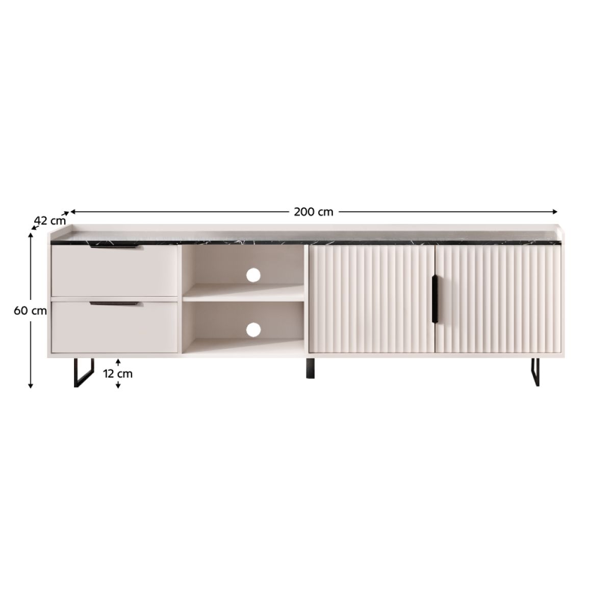 Material: DTD laminat/MDF înfoliat Culoare: caşmir/marmură neagră Dimensiuni (lxAxh): 200x42x60 cm Grosime material: 1,6 cm Cu două uşi Două sertare Spaţiu de depozitare deschis Portanţă poliţă: 4 kg Portanţă sertar: 2 kg Portanţa plăcii superioare: 15 kg Cu mânere Material mânere: metal Culoarea mânerelor: neagră Pe picioare Material picioare: metal Culoare picioare: neagră Înălţime picioare: 12 cm Picior central de sprijin Uşă decorativă Margini: hârtie acoperită cu polimeri termoreactivi Grosime DTD partea din spate/fund sertar: 0,3 cm Culoare partea din spate/fund sertar: alb şină cu bilă extensibilă complet Balamale Orificiu de trecere a cablului Design modern Recomandăm fixarea de perete Livrat dezasamblat