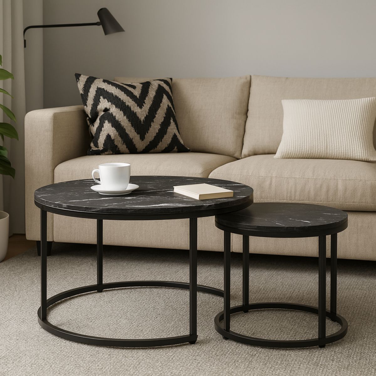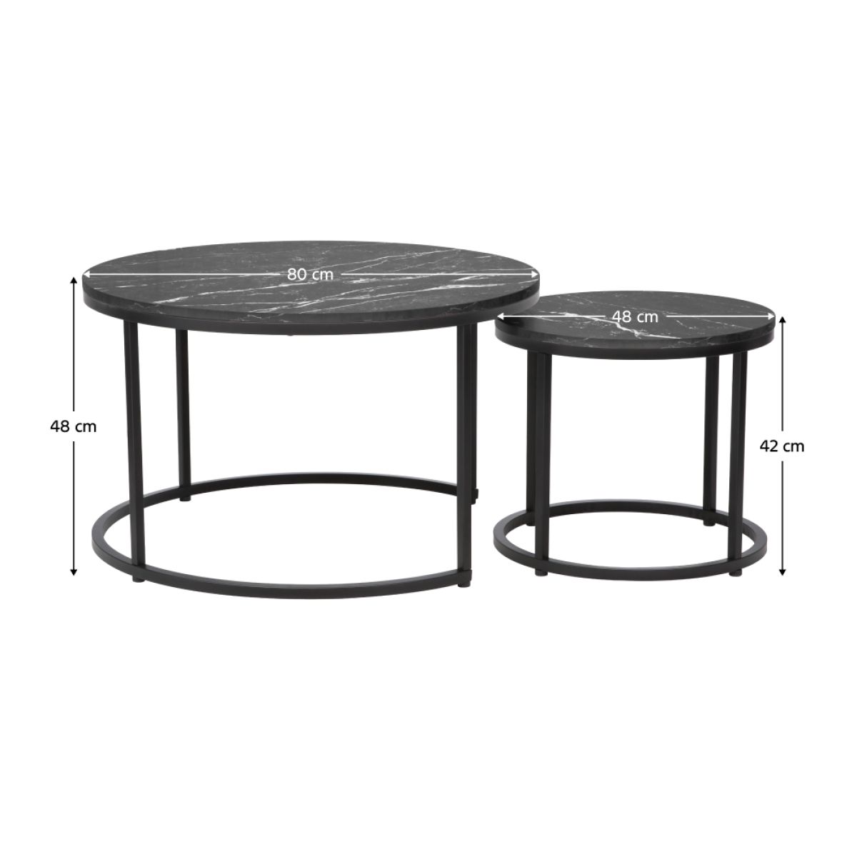 Material: DTD laminat/metal Culoare: negru/gri închis Masă mai mare (diametru x h): 80x48 cm Masă mai mică (diametru x h): 48x42 cm Grosime material: 1,5 cm Portanţă: 40 kg Set de două mese Posibilitate a împinge masa mai mică sub cea mai mare Rotund Modern Livrat dezasamblat