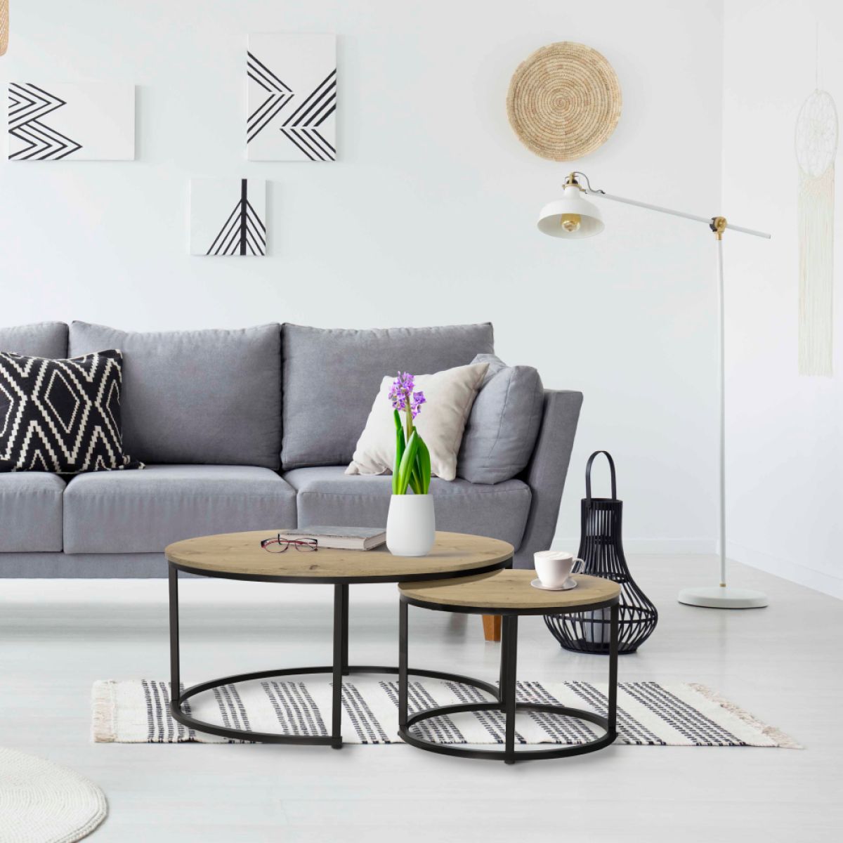 Material: DTD laminat/metal Culoare: negru/stejar Masă mai mare (diametru x h): 80x48 cm Masă mai mică (diametru x h): 48x42 cm Grosime material: 1,5 cm Portanţă: 40 kg Set de două mese Posibilitate a împinge masa mai mică sub cea mai mare Rotund Modern Livrat dezasamblat
