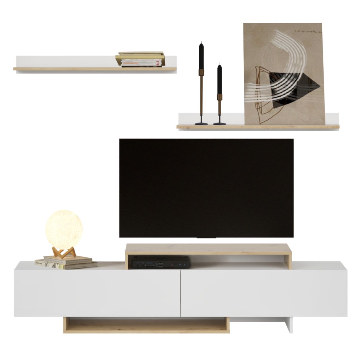 Material: DTD laminat Culoare: albă/stejar artisan Dimensiuni (lxAxh): 180x35x50 cm Grosime material DTD: 1,6 cm Măsuţă TV 2x poliţă suspendată Dimensiuni poliţă (lxAxh): 90x16,6x10 cm Portanţa poliţei suspendate: 3 kg Spaţiu de depozitare deschis 2x dulap basculant Portanţa a dulapului basculant: 7 kg Portanţă placă superioară: 10 kg Margine: hârtie acoperită cu polimeri termoreactivi Grosime DTD partea din spate: 0,3 cm Culoare partea din spate: albă Balamale Design modern Recomandăm ataşarea de perete Livrat dezasamblat