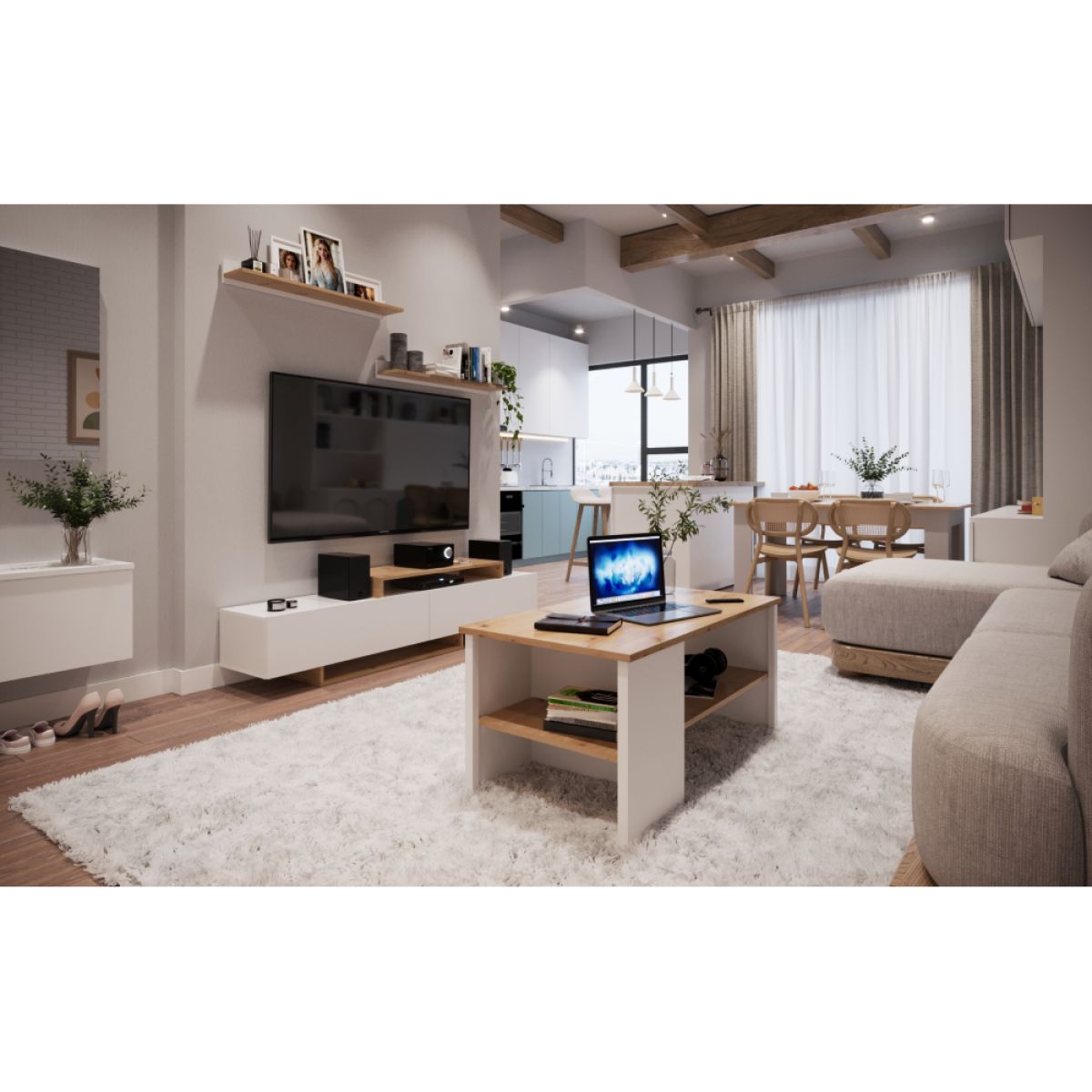 Mobilier de perete living, alb/stejar artisan, MILONA