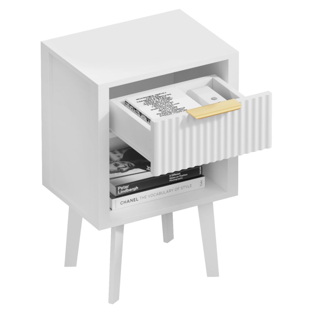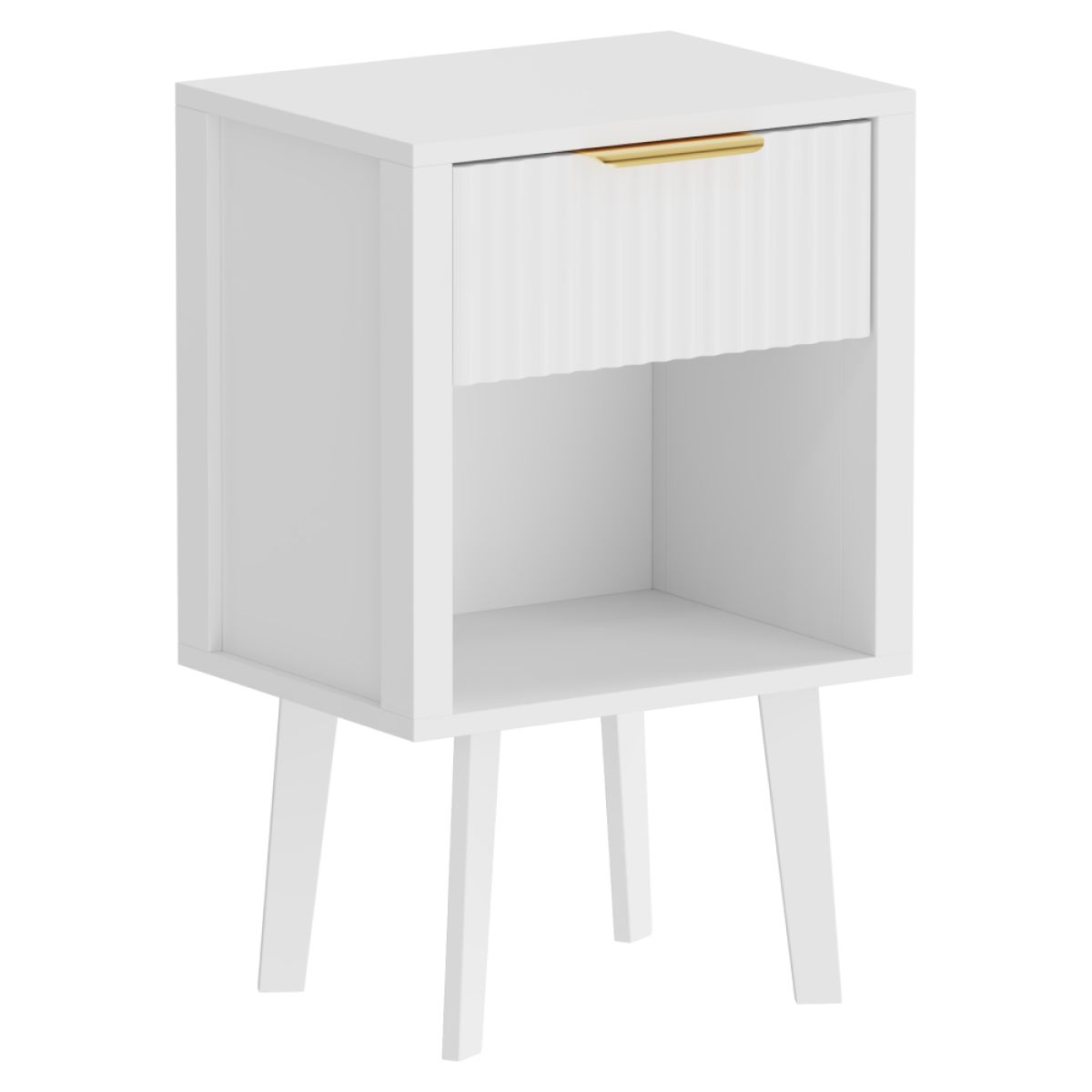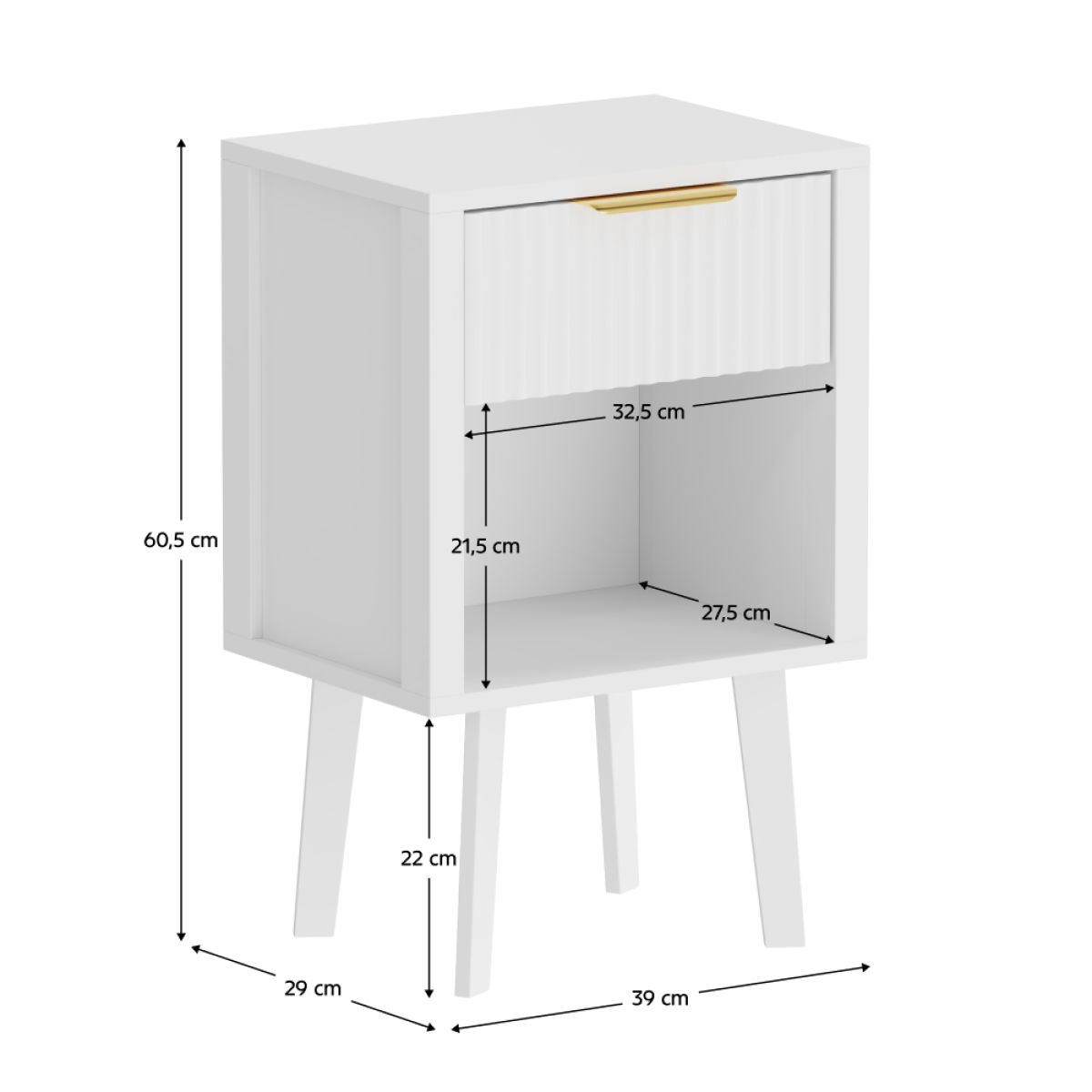 Material: DTD laminat Culoare: albă Dimensiuni (lxAxh): 39x29x60,5 cm Portanţă: 10 kg Compartiment de depozitare deschis Înălţimea compartimentului de depozitare deschis: 21,5 cm Capacitatea spaţiului de depozitare deschis: 10 kg Sertar Portanţă sertar: 5 kg Mânere din plastic Culoarea mânerului: auriu Pe picioare Înălţimea picioarelor: 22 kg Design modern Recomandăm ataşarea de perete Livrat dezasamblat
