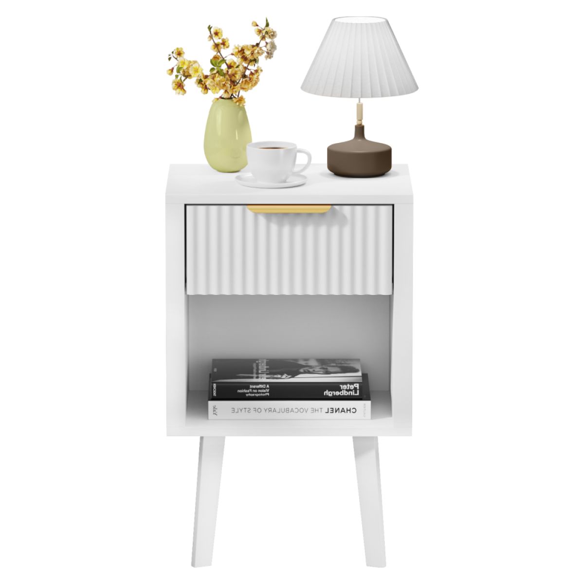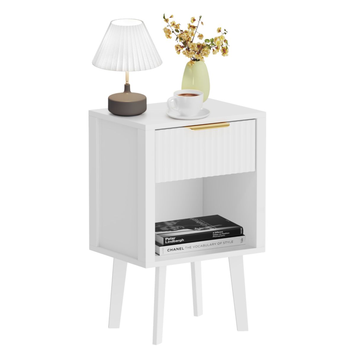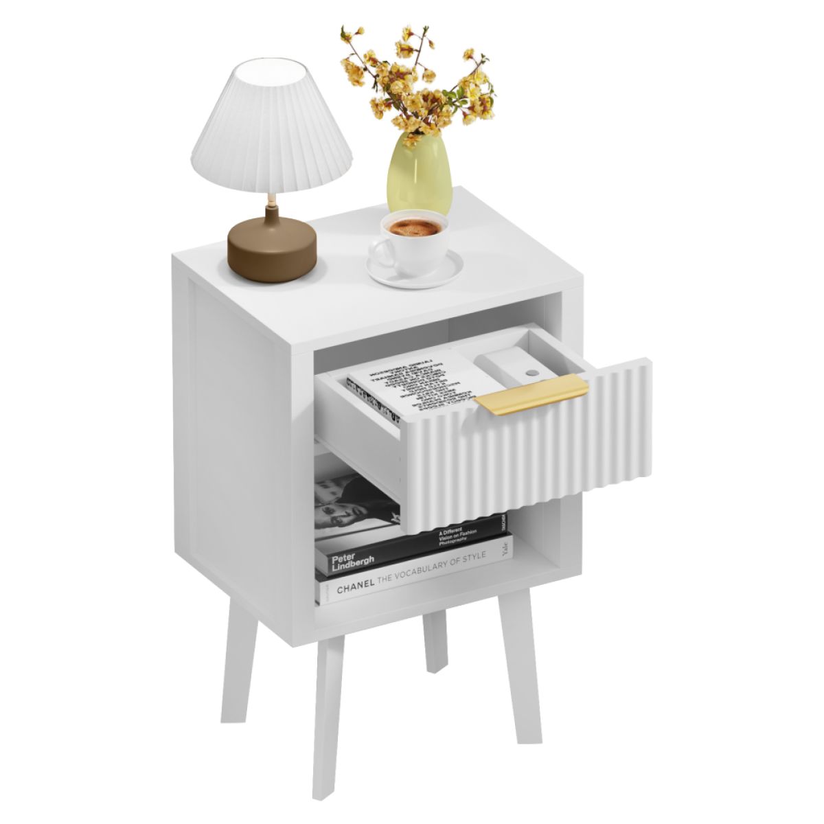 Material: DTD laminat Culoare: albă Dimensiuni (lxAxh): 39x29x60,5 cm Portanţă: 10 kg Compartiment de depozitare deschis Înălţimea compartimentului de depozitare deschis: 21,5 cm Capacitatea spaţiului de depozitare deschis: 10 kg Sertar Portanţă sertar: 5 kg Mânere din plastic Culoarea mânerului: auriu Pe picioare Înălţimea picioarelor: 22 kg Design modern Recomandăm ataşarea de perete Livrat dezasamblat