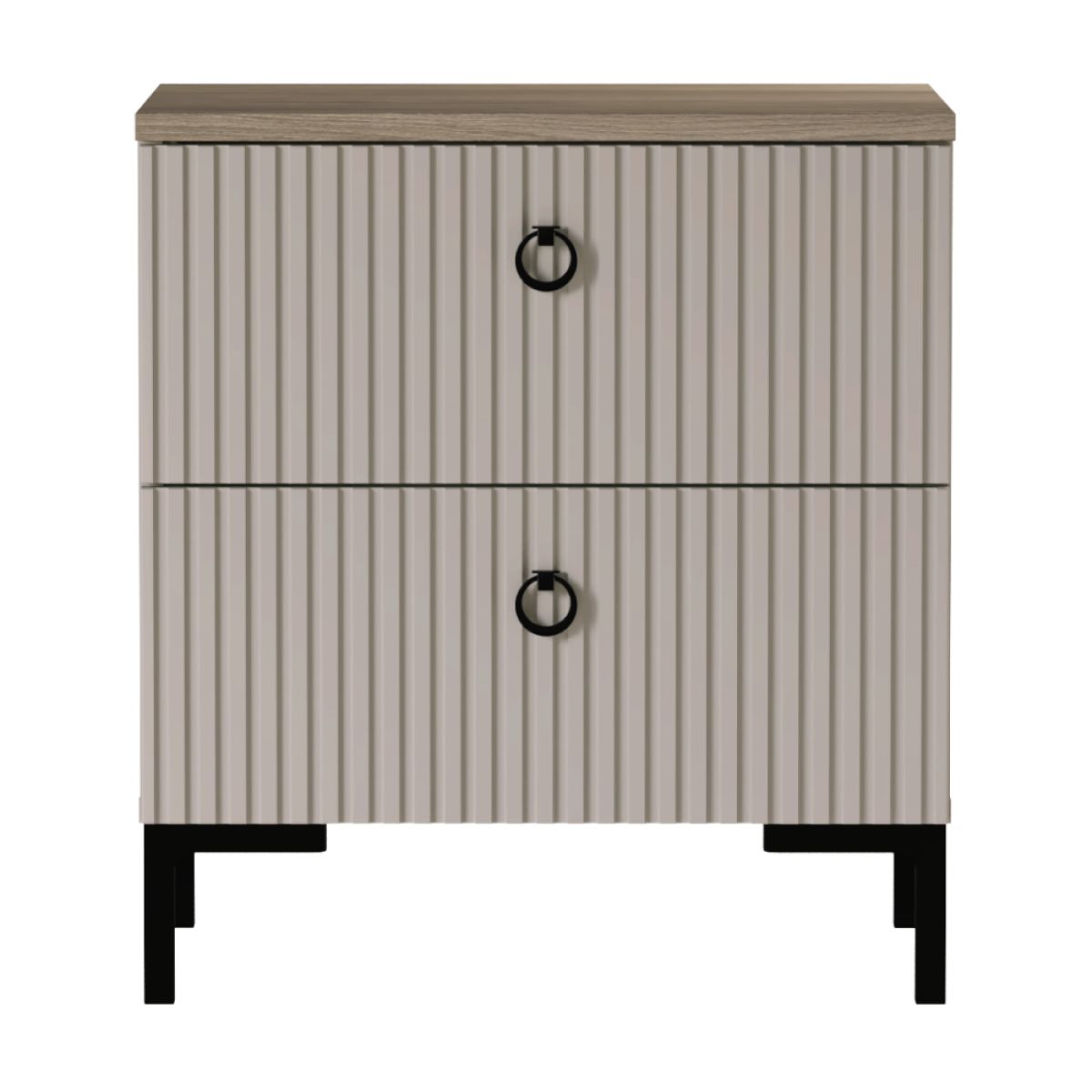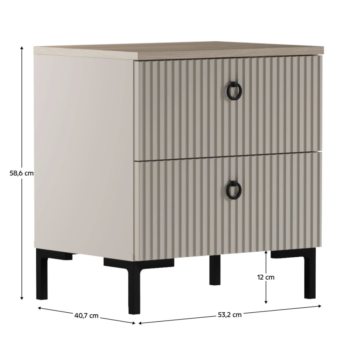 Material: MDF laminat DTD/înfoliat Culoare: gri-maroniu Taupe/stejar silverjack Dimensiuni (lxAxh): 53,2x40,7x58,6 cm Grosimea materialului DTD: 1,6-1,8 cm Grosimea materialului MDF: 1,9 cm Două sertare Portanţă placă superioară: 10 kg Portanţă sertar: 3 kg Cu mânere Material mâner: metal Culoare mâner: negru mat Pe picioare Înălţimea picioarelor: 12 cm Material picior: plastic Culoare picior: negru mat Uşi decorative frezate Design modern Recomandăm fixarea pe perete Livrat dezasamblat
