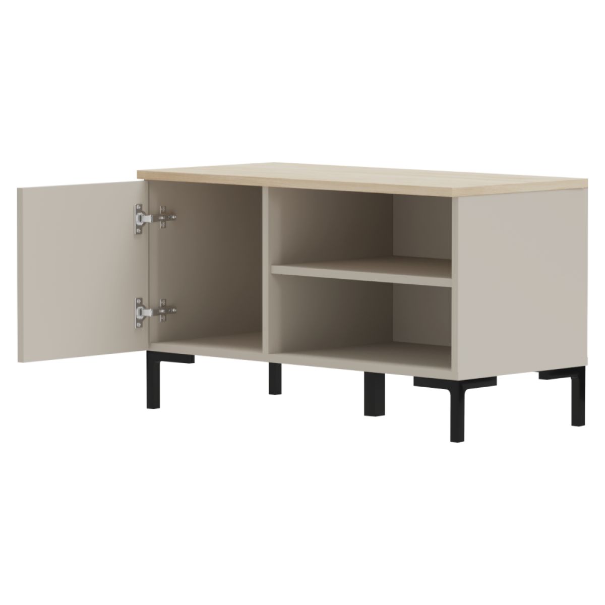 Material: MDF laminat DTD/înfoliat Culoare: gri-maroniu Taupe/stejar silverjack Dimensiuni (lxAxh): 85x40,7x49 cm Grosimea materialului DTD: 1,6-1,8 cm Grosimea materialului MDF: 1,9 cm Un dulap Spaţiu de depozitare deschis Poliţă Portanţa blatului superior: 80 kg Portanţa poliţei: 5 kg Cu mânere Material mâner: metal Culoare mâner: negru mat Pe picioare Înălţimea piciorului: 12 cm Material picior: plastic Culoare picior: negru mat Uşi decorative frezate Design modern Recomandăm fixarea pe perete Livrat dezasamblat
