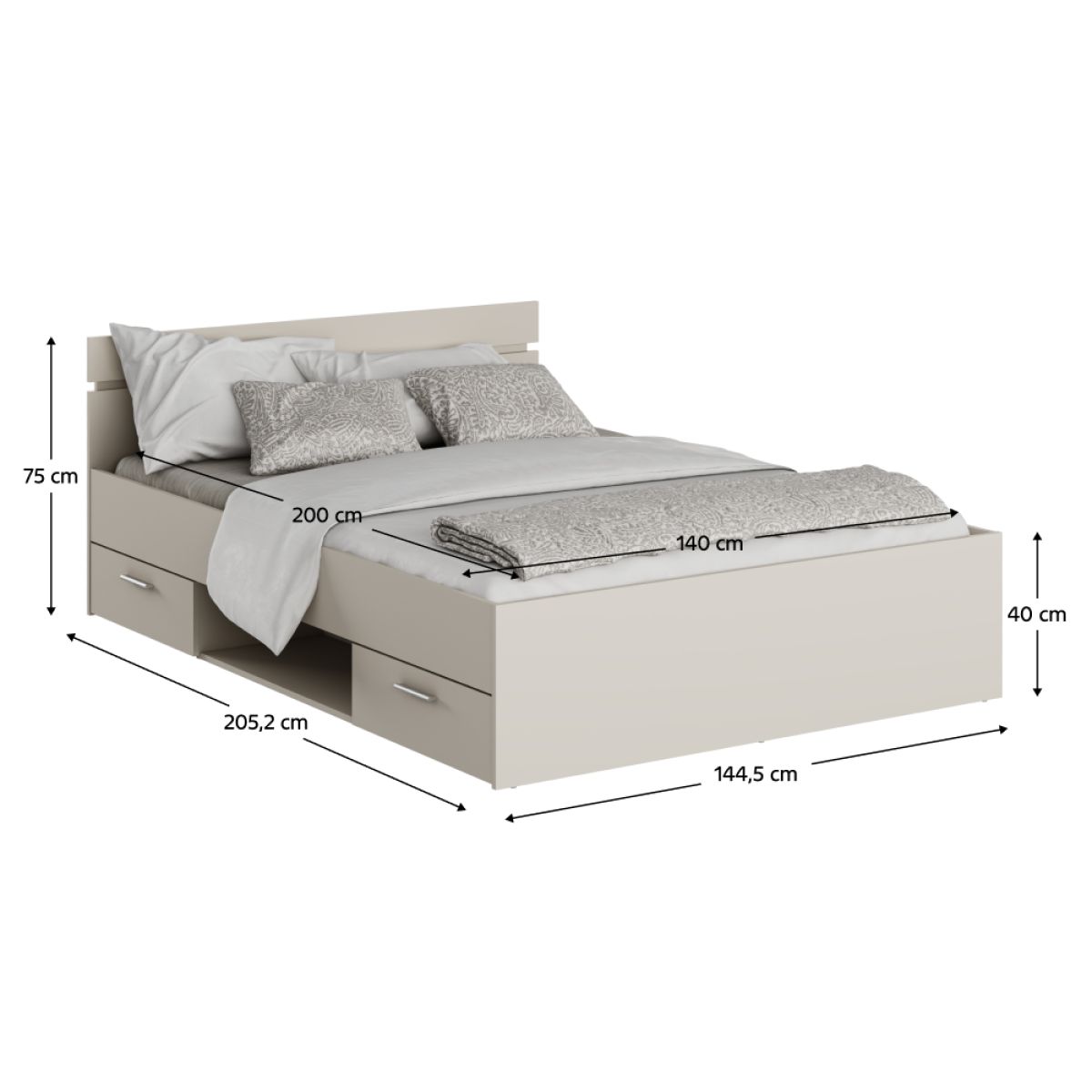 Material: DTD laminat Culoare: cashmere Dimensiuni (LxAxH): 144,5x205,2x75 cm Suprafaţa utilă de dormit (Lxl): 140x200 cm Înălţimea până somieră: 26 cm Înălţimea de dormit: 40 cm Capacitate: 2x100 kg Înălţimea saltelei: 15 cm Ambele sertare au aceeaşi dimensiune Cu sertar Cu spaţiu pentru depozitare Posibilitatea de a cumpăra somieră într-un cadru fix Posibilitatea de a cumpăra saltea Livrat nemontat
