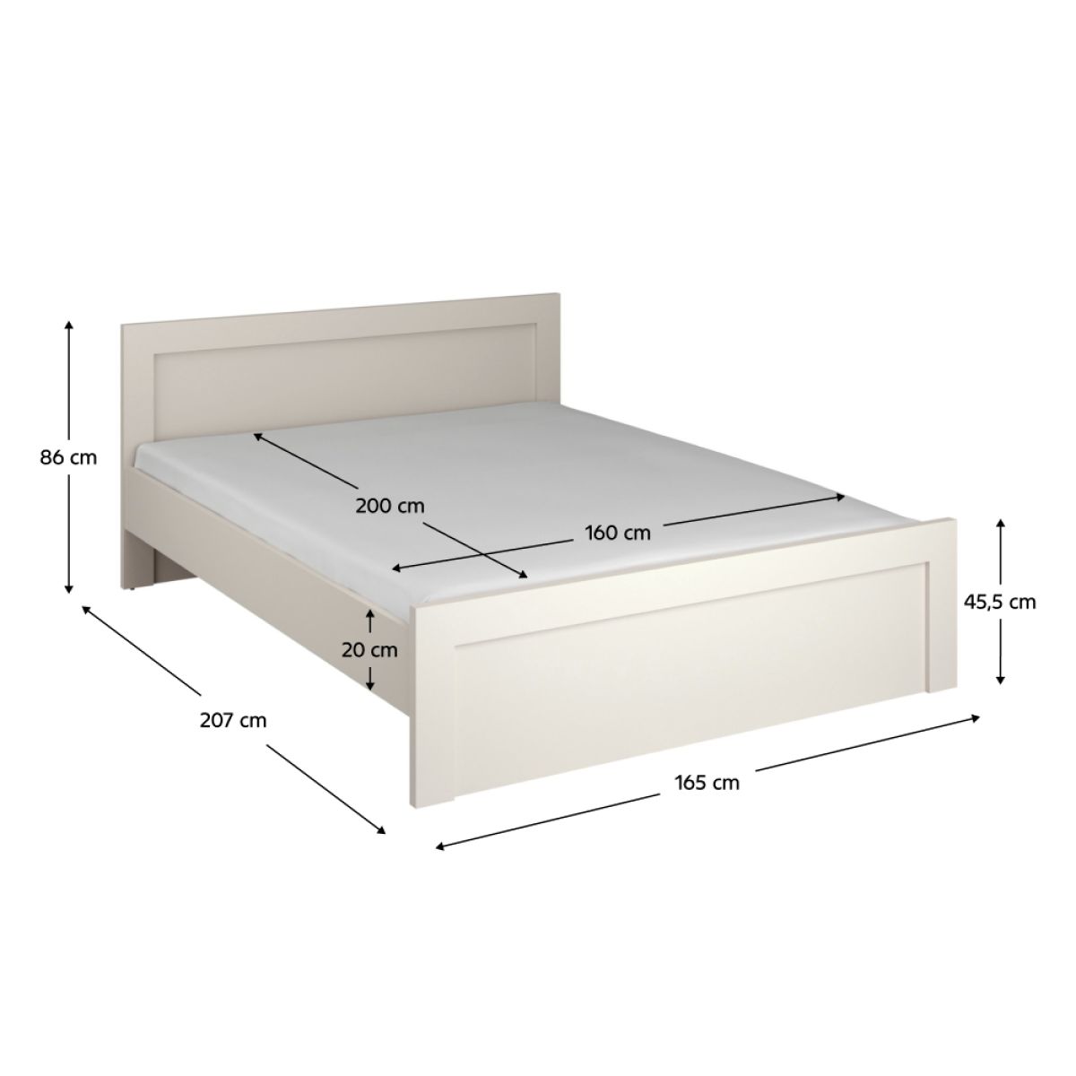 Material: DTD laminat Culoare: caşmir Dimensiuni (lxAxh): 165x207x86 cm Grosimea materialului DTD: 1,6-3,2 cm Suprafaţa pentru dormit (lxL): 160x200 cm Portanţă pe persoană: 90 kg Înălţime până la somieră: 32 cm Livrat fără somieră şi saltea Opţiune de achiziţionare a unei somiere şi a unei saltele roluită din oferta noastră Încastrarea saltelei: 8 cm Înălţimea minimă recomandată a saltelei: 10 kg Design modern Livrat dezasamblat