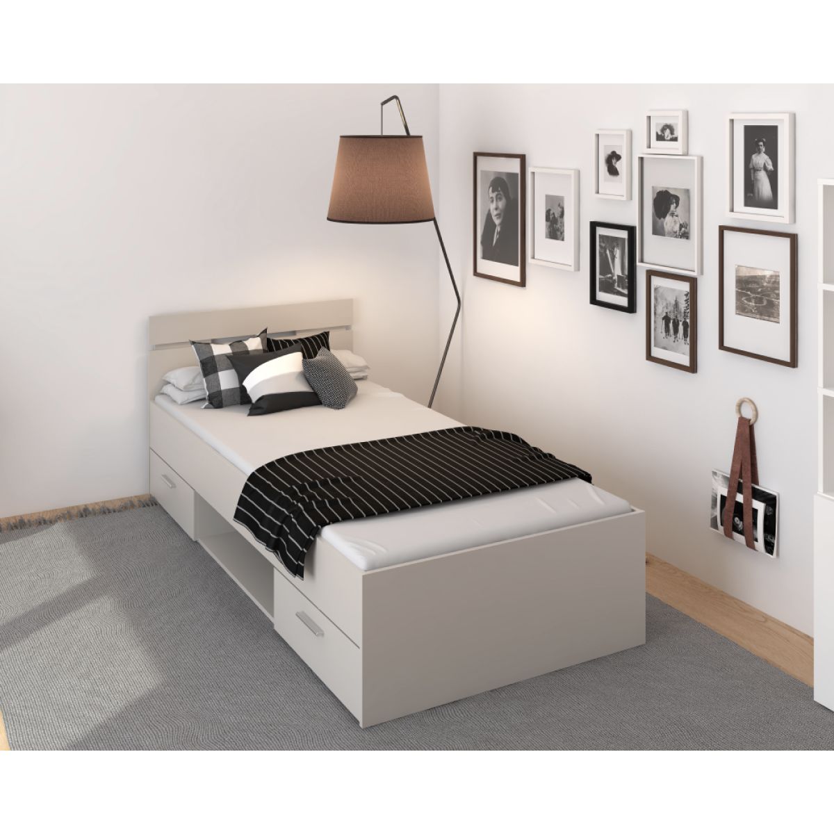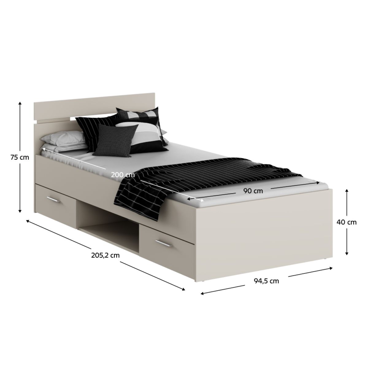Material: DTD laminat Dimensiuni (lxÎxL): 94,5x75x205,2 cm Culoare: cashmere Zona de dormit (lxL): 90x200 cm Greutate maximă suportată: 100 kg Înălţimea saltelei: 15 cm Înălţimea de dormit: 40 cm Două sertare Puteţi monta sertarele pe partea dreaptă sau stângă Cu stocare Opţiunea de a cumpăra un grătar într-un cadru fix Opţiunea de a cumpăra o saltea Furnizat nemontat