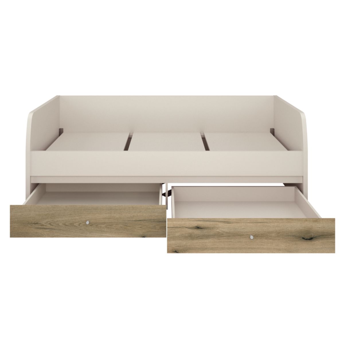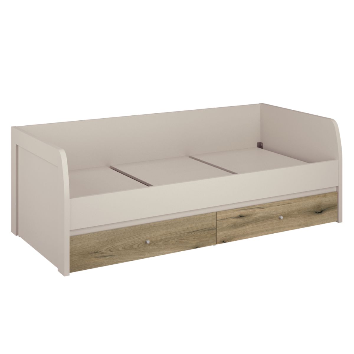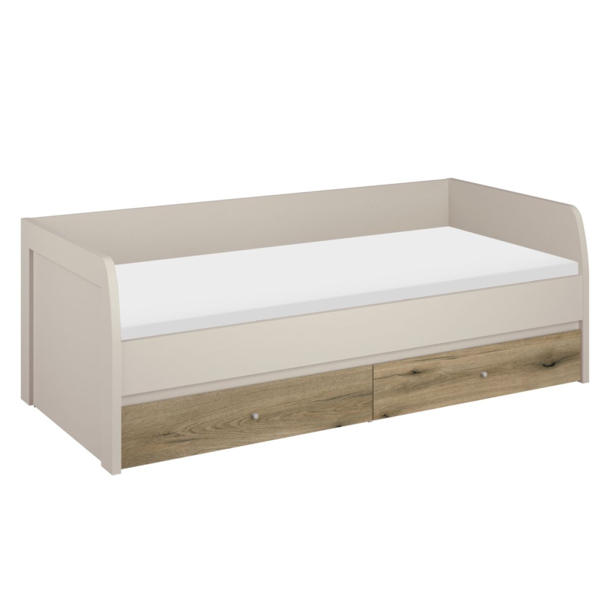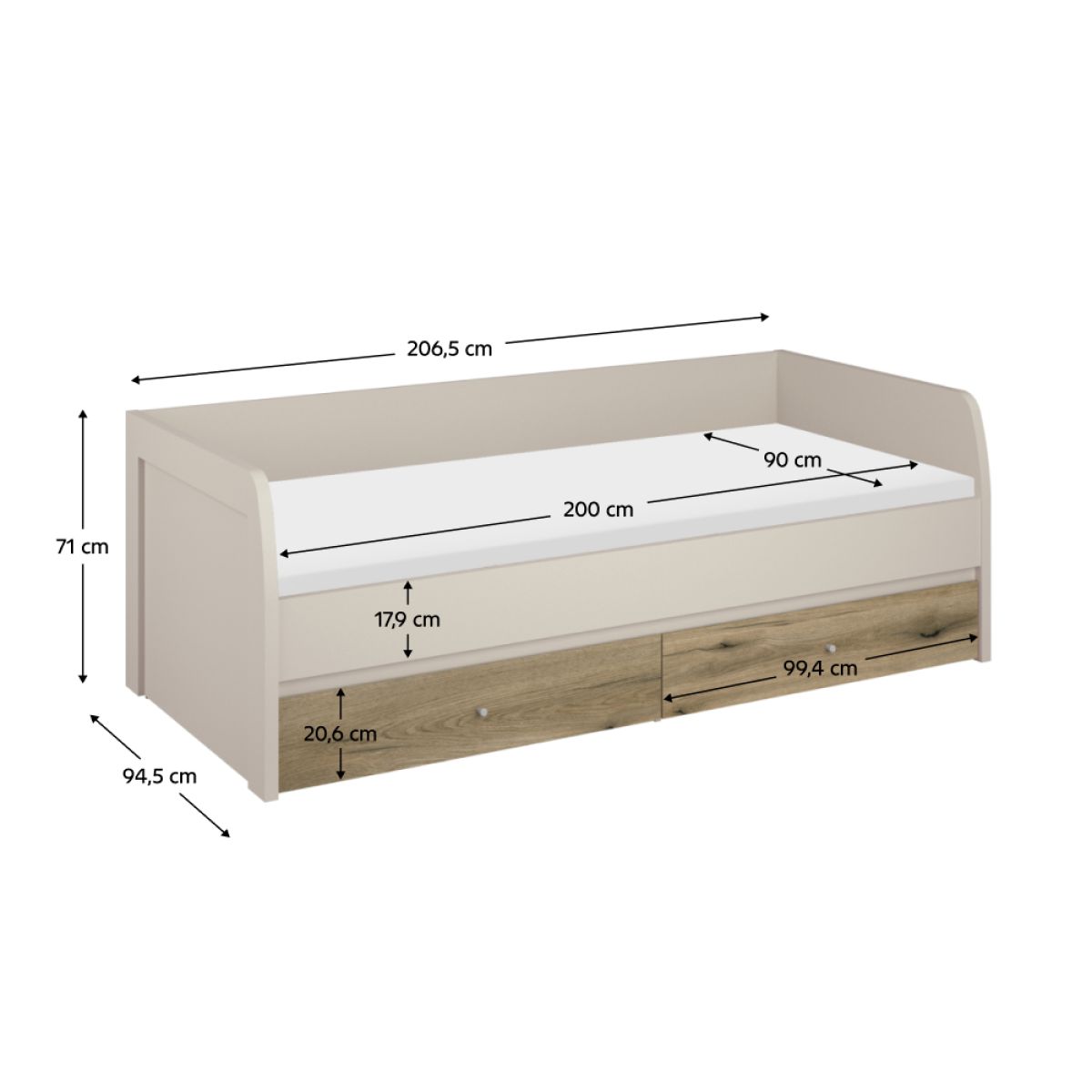 Material: DTD laminat Culoare: caşmir/stejar evoke Dimensiuni (lxAxh): 94,5x206,5x71 cm Grosimea materialului DTD: 1,6-3,2 cm Suprafaţa pentru dormit (lxL): 90x200 cm Portanţa pe persoană: 90 kg Înălţime până la somieră: 27,6 kg Livrat cu 3 plăci de somieră Livrat fără saltea Posibilitatea de a cumpăra o saltea din oferta noastră Încastrarea saltelei: 16,5 cm Înălţimea minimă recomandată a saltelei: 18 cm Cu spaţiu de depozitare Două sertare Portanţă sertar: 5 kg Design modern Livrate dezasamblate