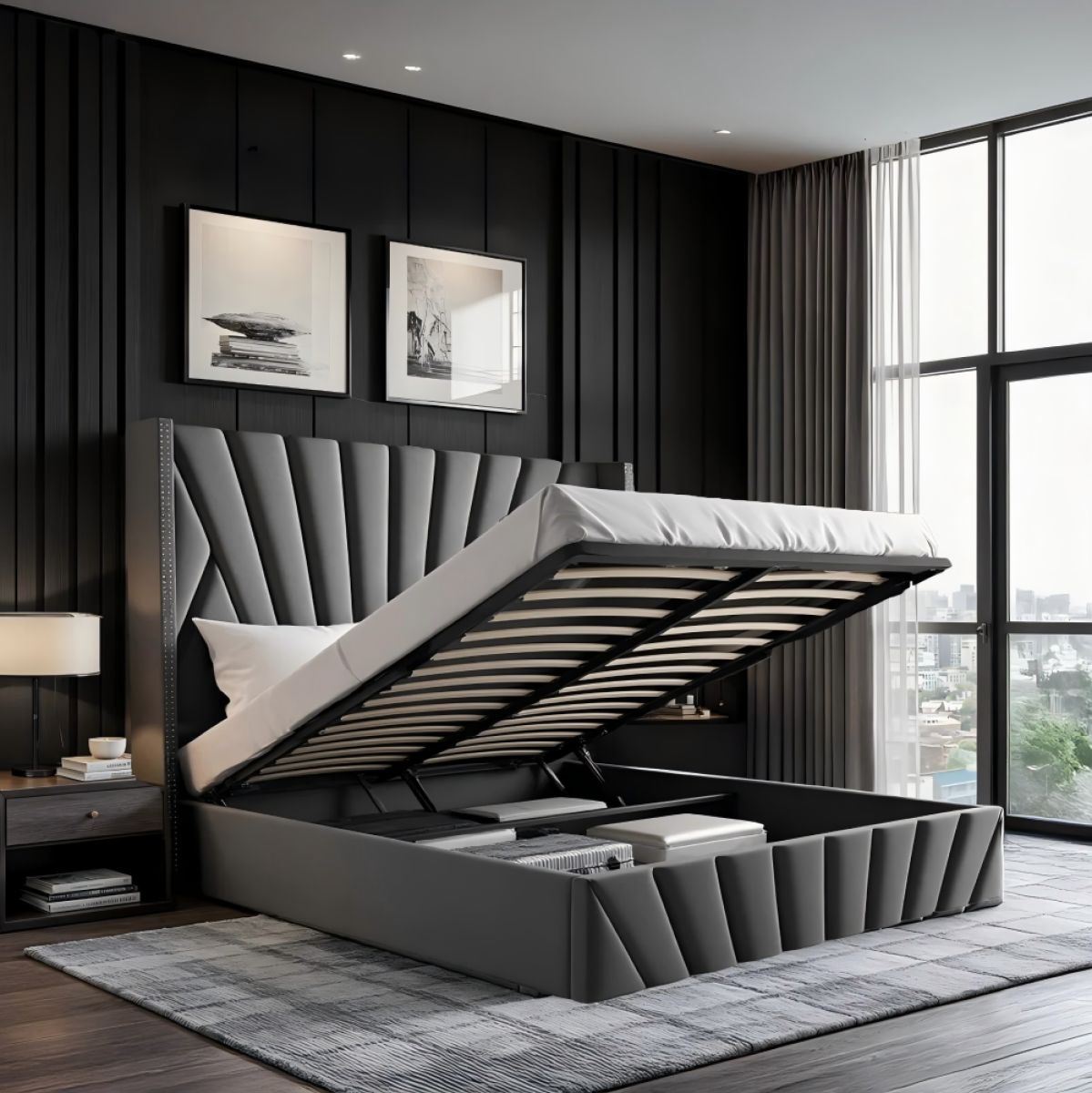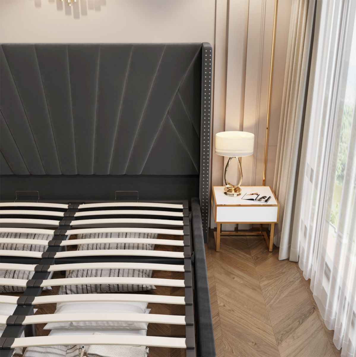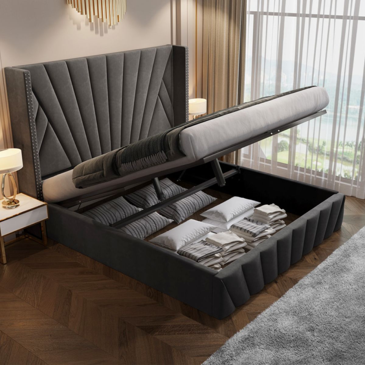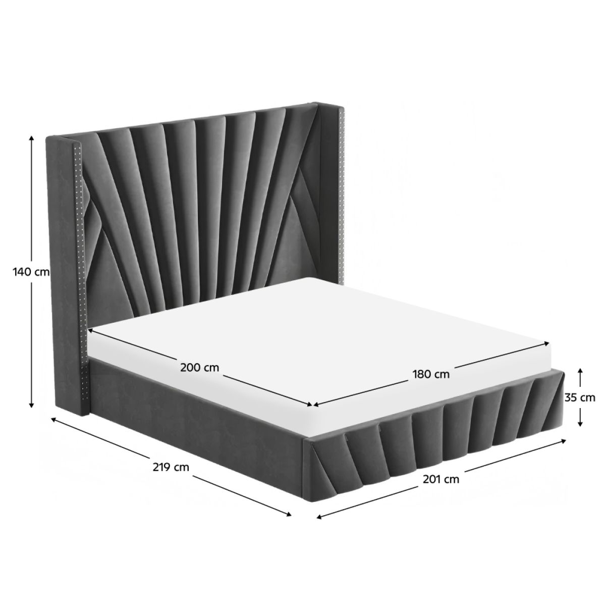 Material: ţesătură Velvet/MDF/placaj/metal Rezistenţa ţesăturii la frecare conform testului Martindale: 25 000 - 30 000 de cicluri de frecare Culoare: gri închis Dimensiuni (lxAxh): 201x219x140 cm, Suprafaţa de dormit (lxL): 180x200 cm Înălţimea până la grătar: 33 cm Portanţa pe locul de dormit: 110 kg Cu frontală înaltă Înălţimea lateralei: 35 cm Înălţime frontală spate: 140 cm frontală matlasată Cu spaţiu de depozitare Livrat cu grătar batant cu lamele Spaţiu între lamele: 5,5 cm Pistoane pe gaz Livrat fără saltea Opţiunea de a cumpăra o saltea suplimentară din oferta noastră Înălţimea recomandată a saltelei: 20 cm Încastrarea saltelei: 2 cm Design modern Livrat dezasamblat