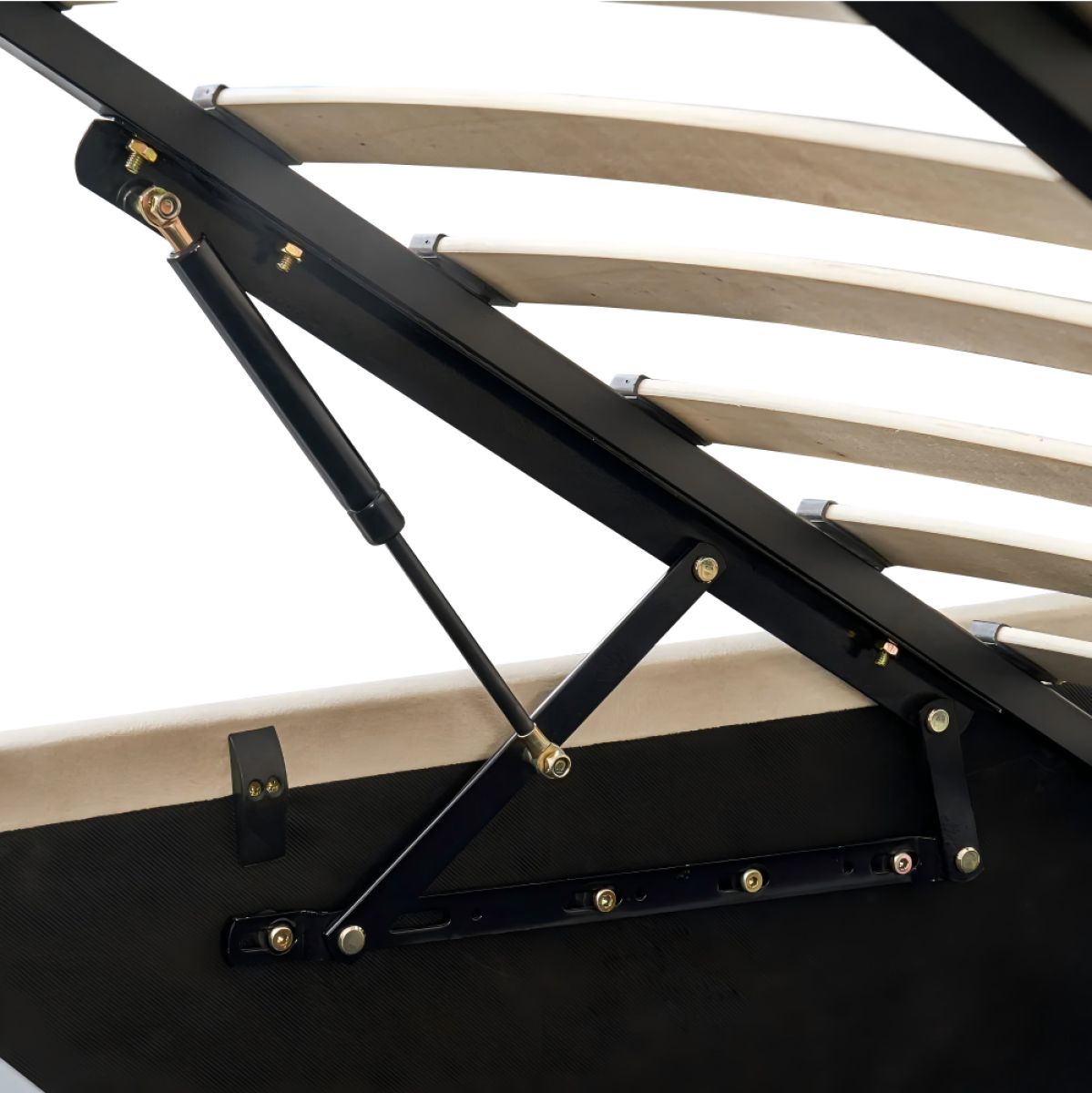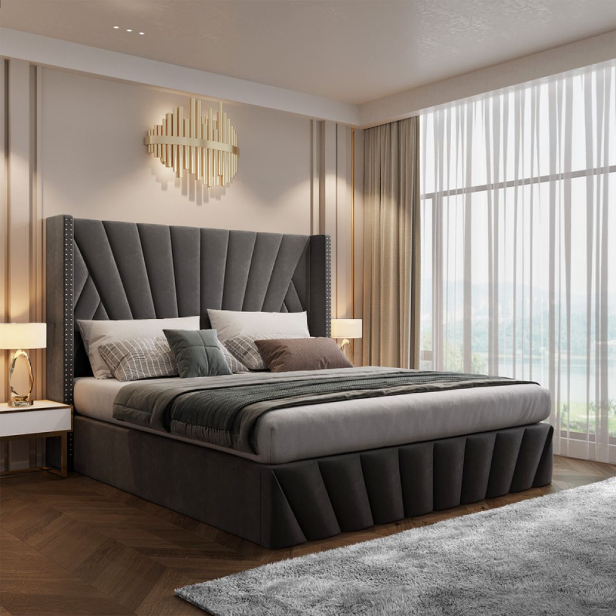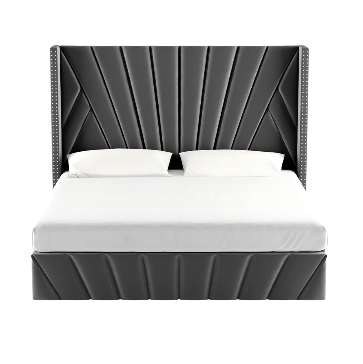 Material: ţesătură Velvet/MDF/placaj/metal Rezistenţa ţesăturii la frecare conform testului Martindale: 25 000 - 30 000 de cicluri de frecare Culoare: gri închis Dimensiuni (lxAxh): 201x219x140 cm, Suprafaţa de dormit (lxL): 180x200 cm Înălţimea până la grătar: 33 cm Portanţa pe locul de dormit: 110 kg Cu frontală înaltă Înălţimea lateralei: 35 cm Înălţime frontală spate: 140 cm frontală matlasată Cu spaţiu de depozitare Livrat cu grătar batant cu lamele Spaţiu între lamele: 5,5 cm Pistoane pe gaz Livrat fără saltea Opţiunea de a cumpăra o saltea suplimentară din oferta noastră Înălţimea recomandată a saltelei: 20 cm Încastrarea saltelei: 2 cm Design modern Livrat dezasamblat