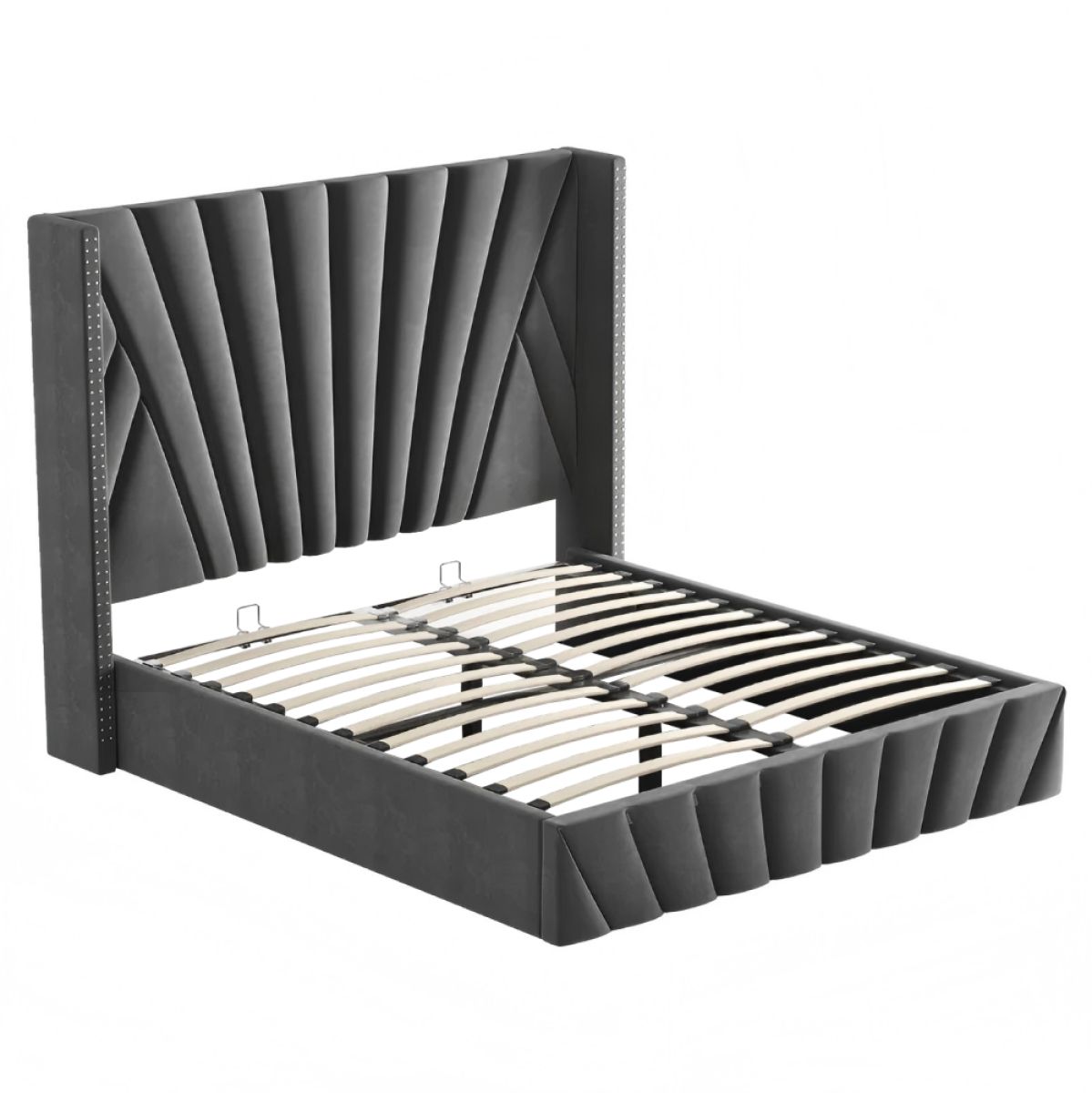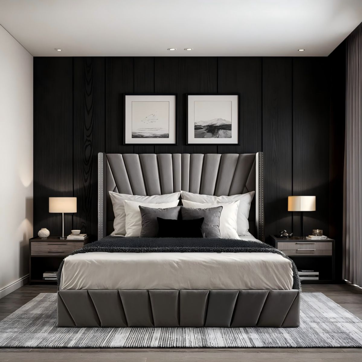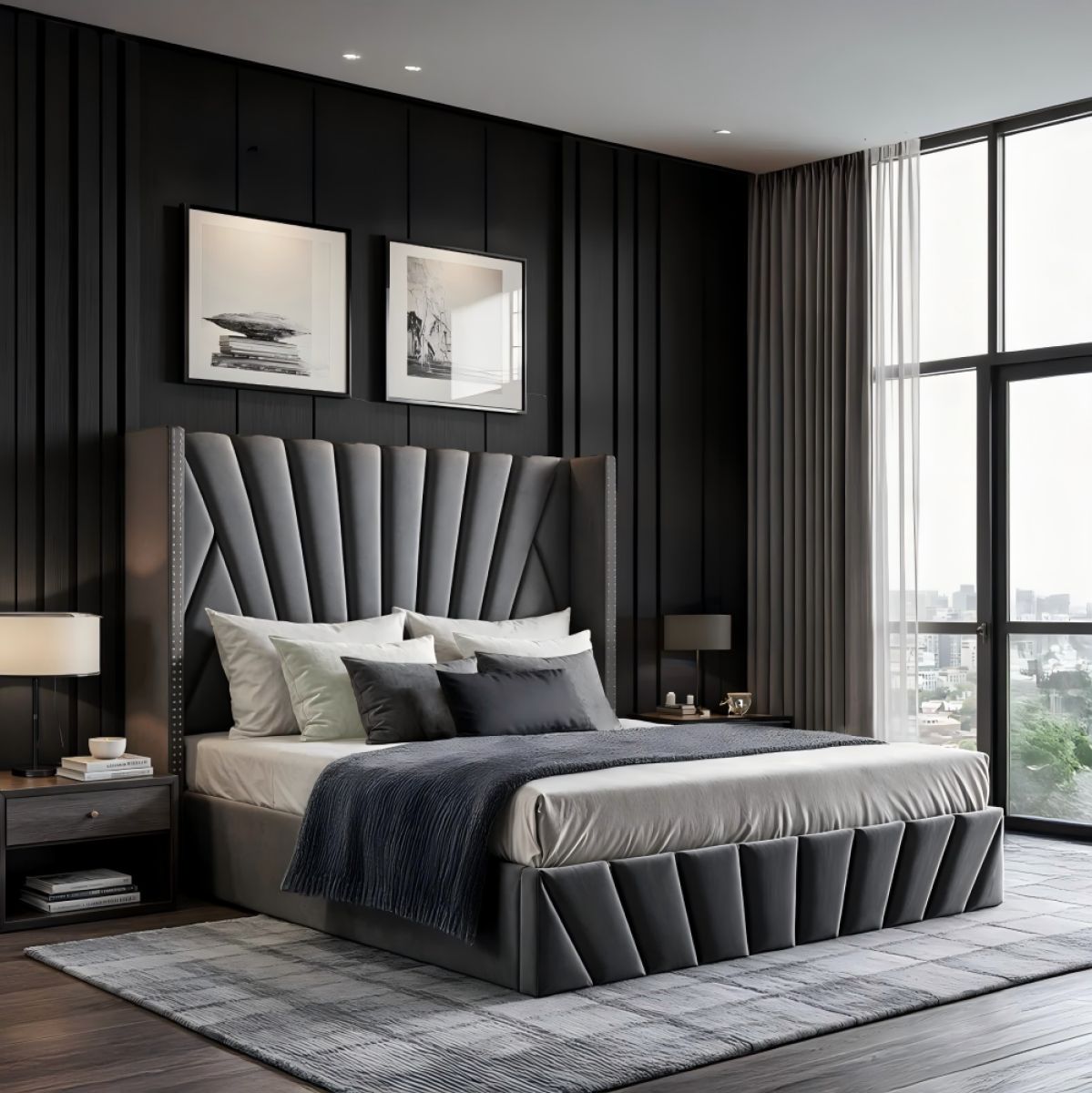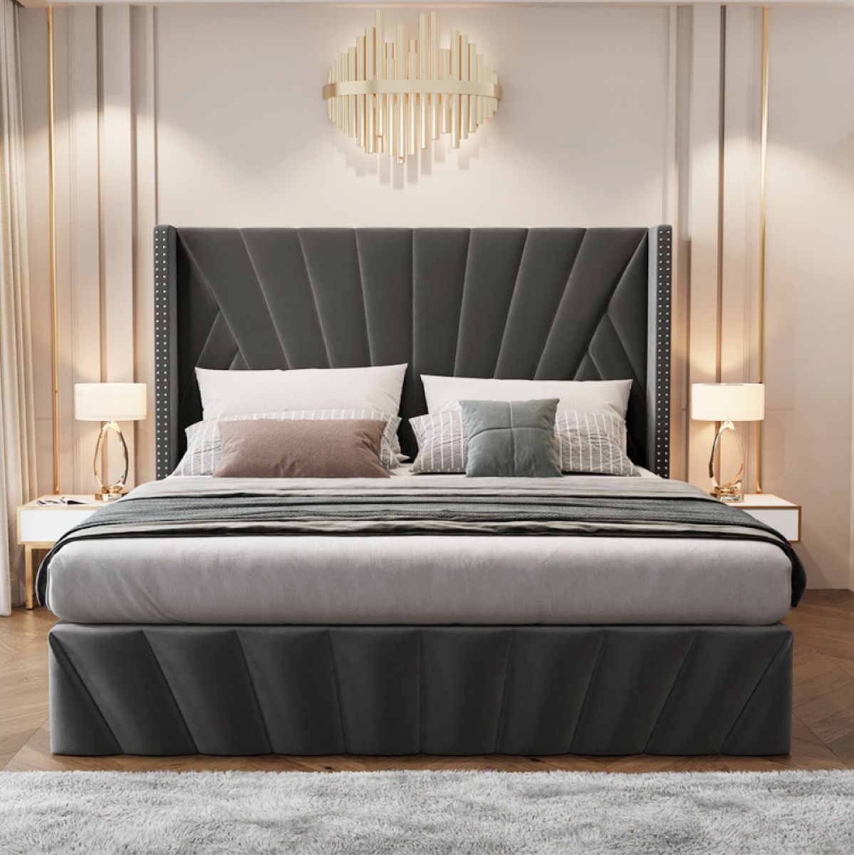 Material: ţesătură Velvet/MDF/placaj/metal Rezistenţa ţesăturii la frecare conform testului Martindale: 25 000 - 30 000 de cicluri de frecare Culoare: gri închis Dimensiuni (lxAxh): 201x219x140 cm, Suprafaţa de dormit (lxL): 180x200 cm Înălţimea până la grătar: 33 cm Portanţa pe locul de dormit: 110 kg Cu frontală înaltă Înălţimea lateralei: 35 cm Înălţime frontală spate: 140 cm frontală matlasată Cu spaţiu de depozitare Livrat cu grătar batant cu lamele Spaţiu între lamele: 5,5 cm Pistoane pe gaz Livrat fără saltea Opţiunea de a cumpăra o saltea suplimentară din oferta noastră Înălţimea recomandată a saltelei: 20 cm Încastrarea saltelei: 2 cm Design modern Livrat dezasamblat