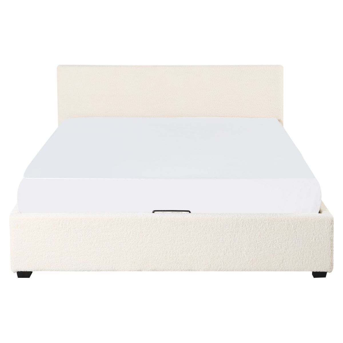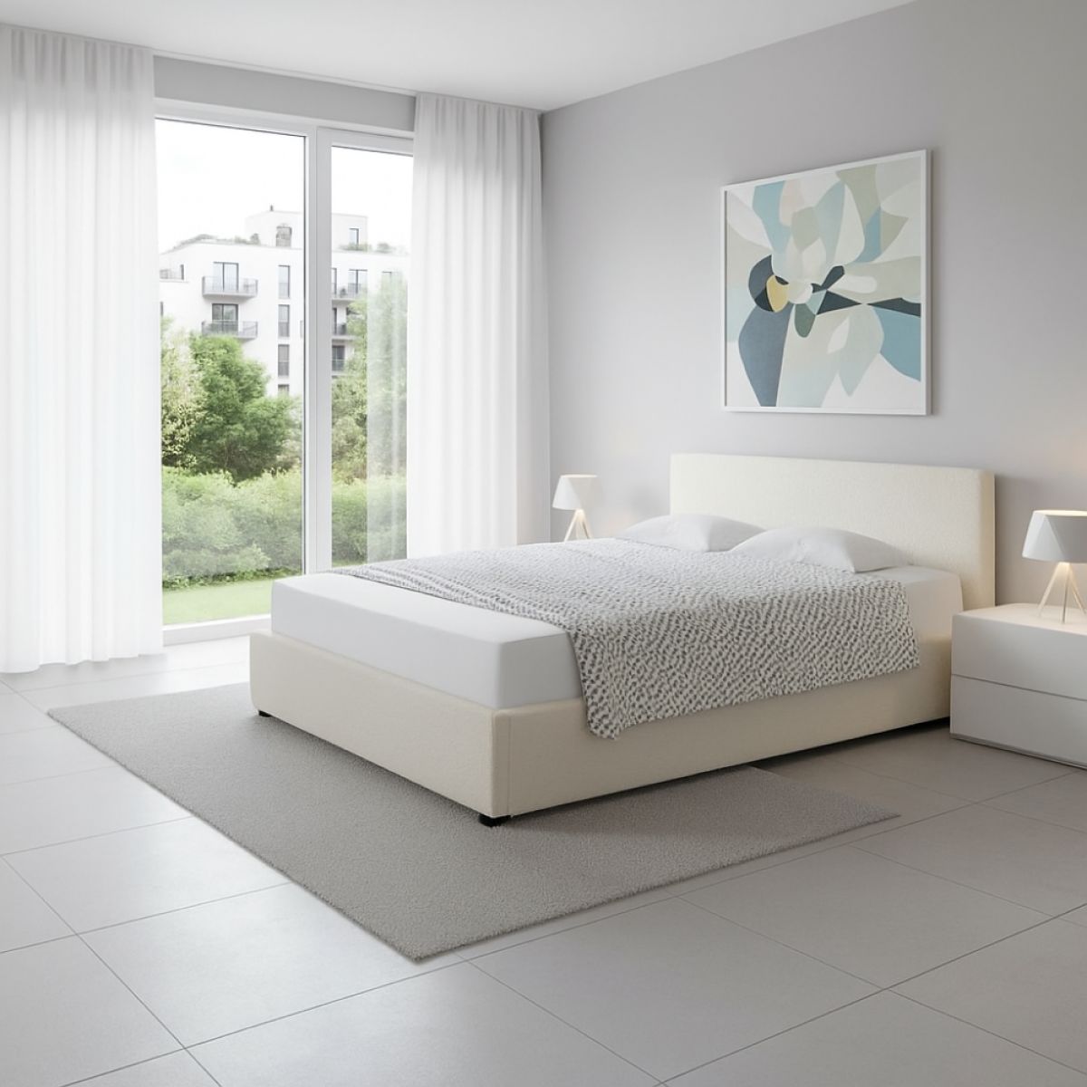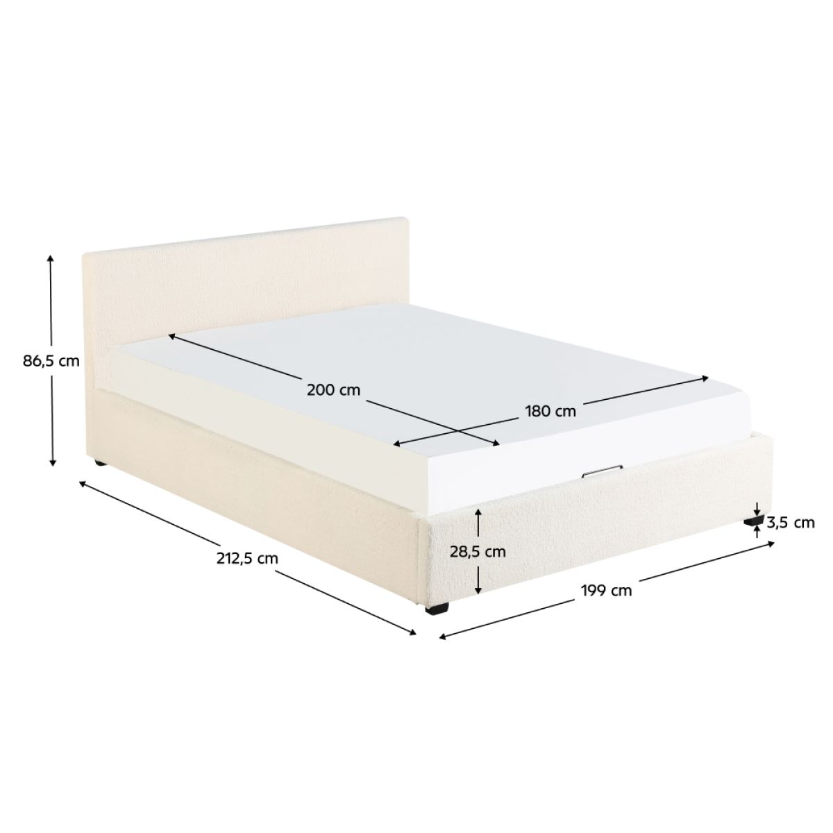 Material: ţesătură Bouclé/MDF melaminat Rezistenţa ţesăturii la frecare conform testului Martindale: 70 000 - 100 000 de cicluri de frecare Culoare: albă Dimensiuni (lxAxh): 199x212,5x86,5 cm Suprafaţă de dormit (lxL): 180x200 cm Înălţimea până la somieră: 28 cm Portanţa pe locul de dormit: 250 kg Cu frontală înaltă Înălţimea frontalei din faţă: 32 cm Înălţime frontală spate: 86,5 cm Pe picioare Materialul picioarelor: lemn Culoarea picioarelor: neagră Înălţimea picioarelor: 3,5 cm Livrat cu somieră cu lamele Spaţiu între lamele: 5 cm Pistoane pe gaz Livrat fără saltea Opţiunea de a cumpăra o saltea suplimentară din oferta noastră Înălţimea recomandată a saltelei: max. 20 cm Încastrarea saltelei: 3,5 cm Design modern Livrat dezasamblat