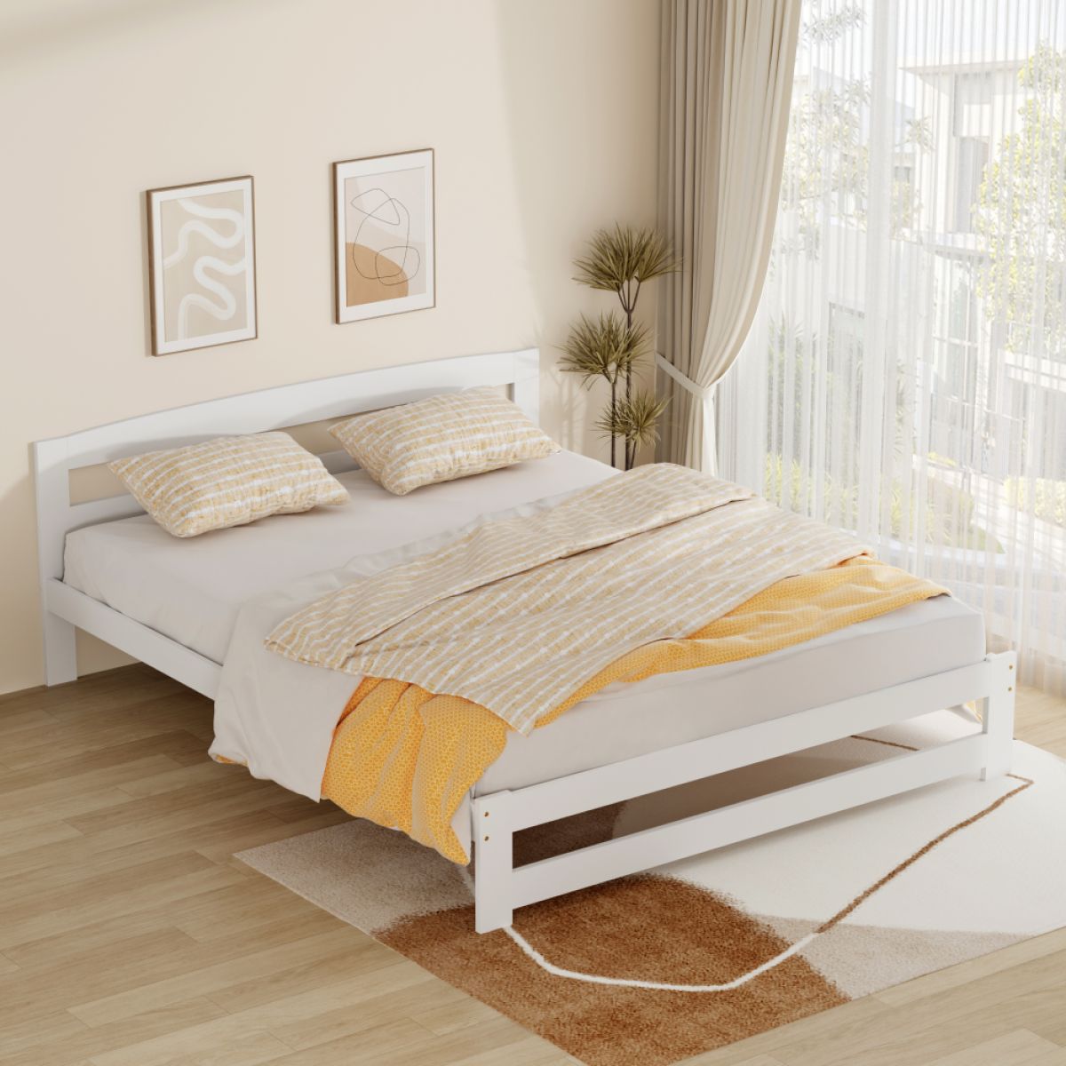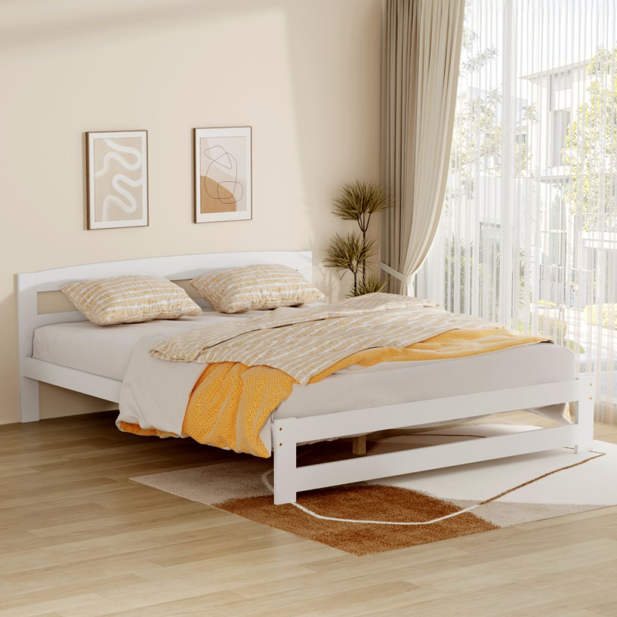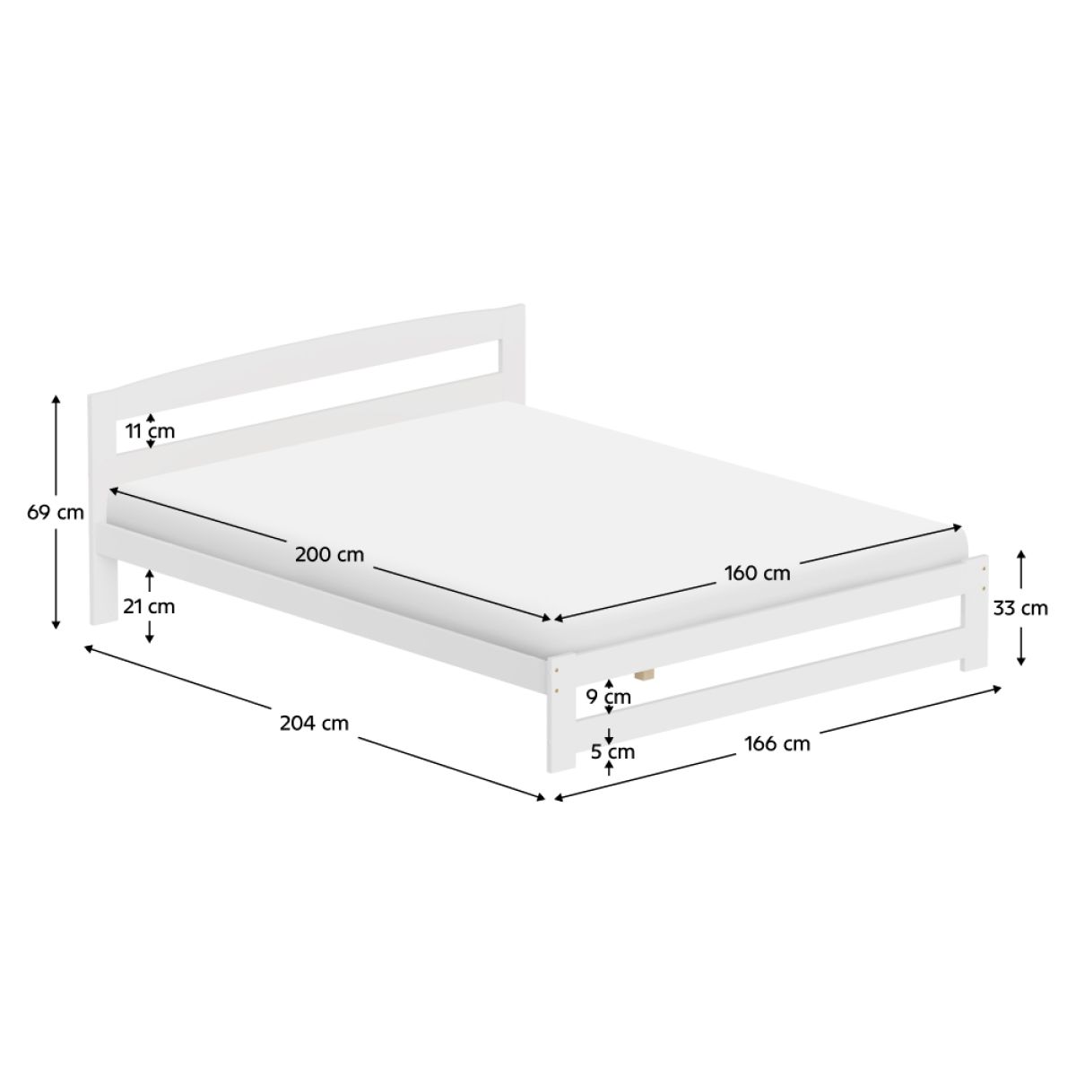 Material: lemn de pin Culoare: alb Dimensiuni (lxAxh): 166x204x69 cm Suprafaţa pentru dormit (lxL): 160x200 cm Grosime material: 2 cm Portanţa pe locul de dormit: 90 kg Înălţime până la somieră: 28 cm Picioare din metal Înălţimea compartimentului inferior de la podea: 21 cm Livrat cu somieră roluibilă din placaj laminat. Livrat fără saltea. Opţiunea de a cumpăra o saltea cu arcuri din oferta noastră. Înălţimea maximă recomandată a saltelei: 7 cm Încastrarea saltelei: 3 cm Design simplu Practic Livrat asamblat