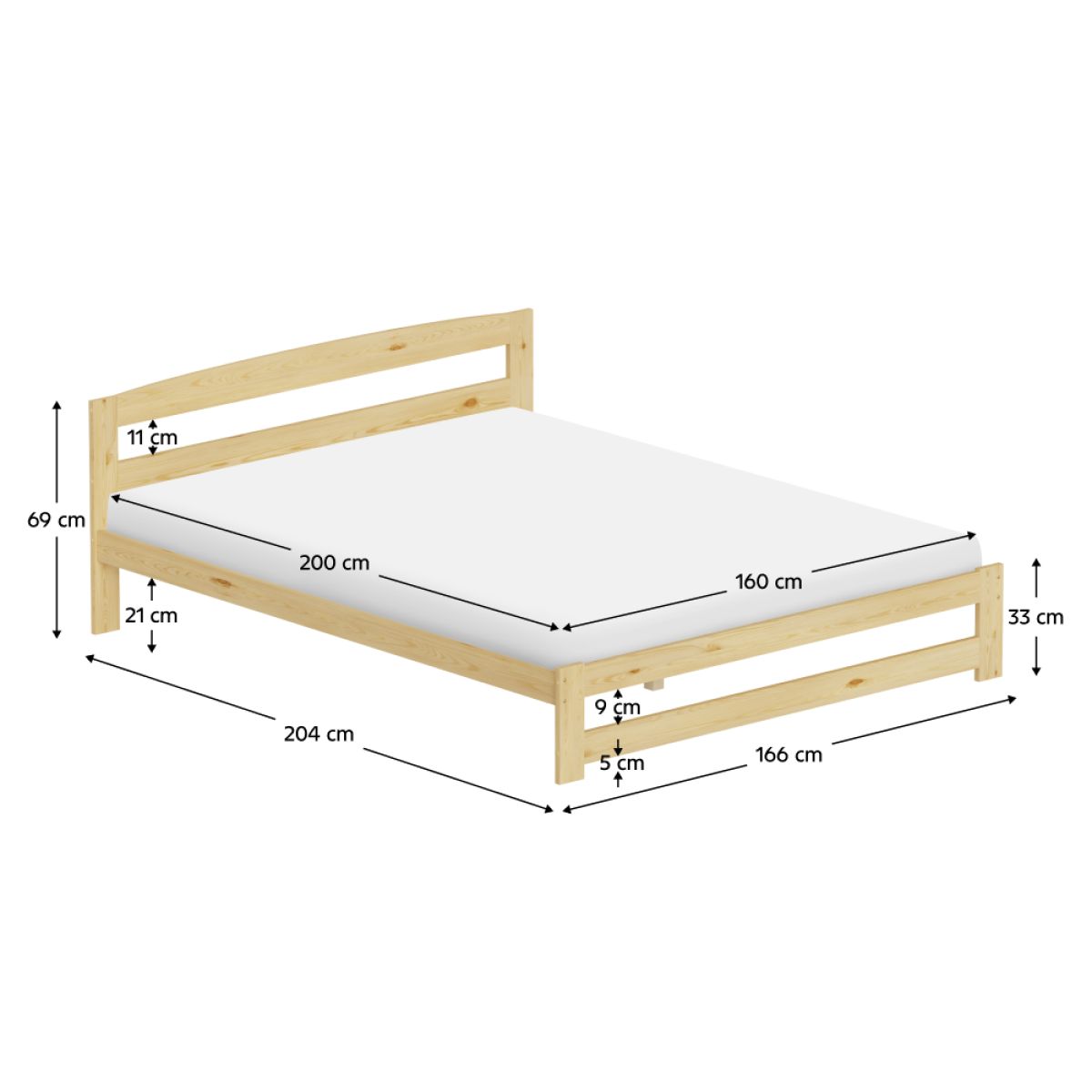 Material: lemn de pin Culoare: naturală Dimensiuni (lxAxh): 166x204x69 cm Suprafaţa pentru dormit (lxL): 160x200 cm Grosime material: 2 cm Portanţa pe locul de dormit: 90 kg Înălţime până la somieră: 28 cm Picioare din metal Înălţimea compartimentului inferior de la podea: 21 cm Livrat cu somieră roluibilă din placaj laminat. Livrat fără saltea. Opţiunea de a cumpăra o saltea cu arcuri din oferta noastră. Înălţimea maximă recomandată a saltelei: 7 cm Încastrarea saltelei: 3 cm Design simplu Practic Livrat asamblat