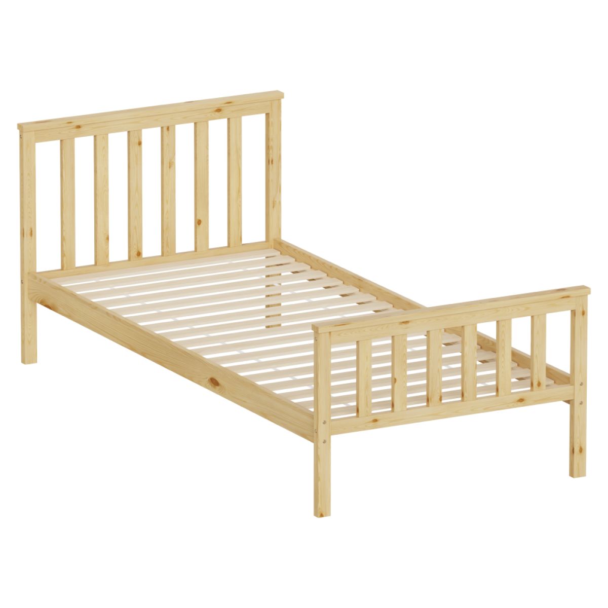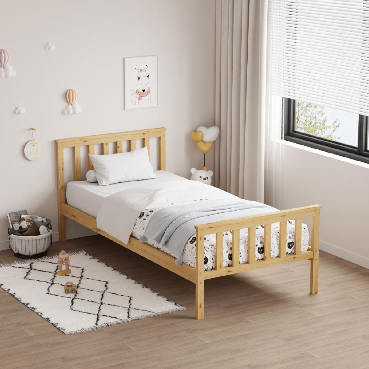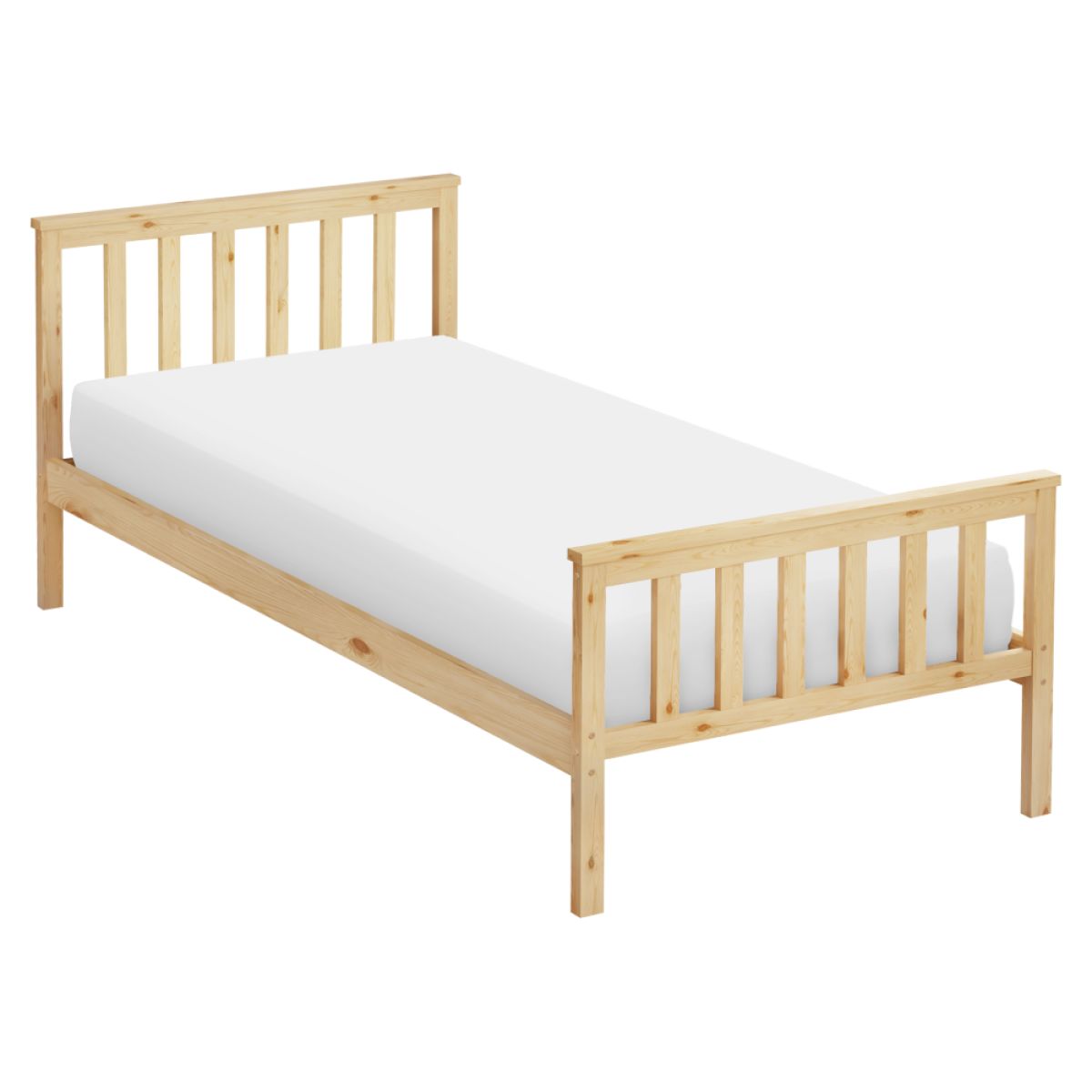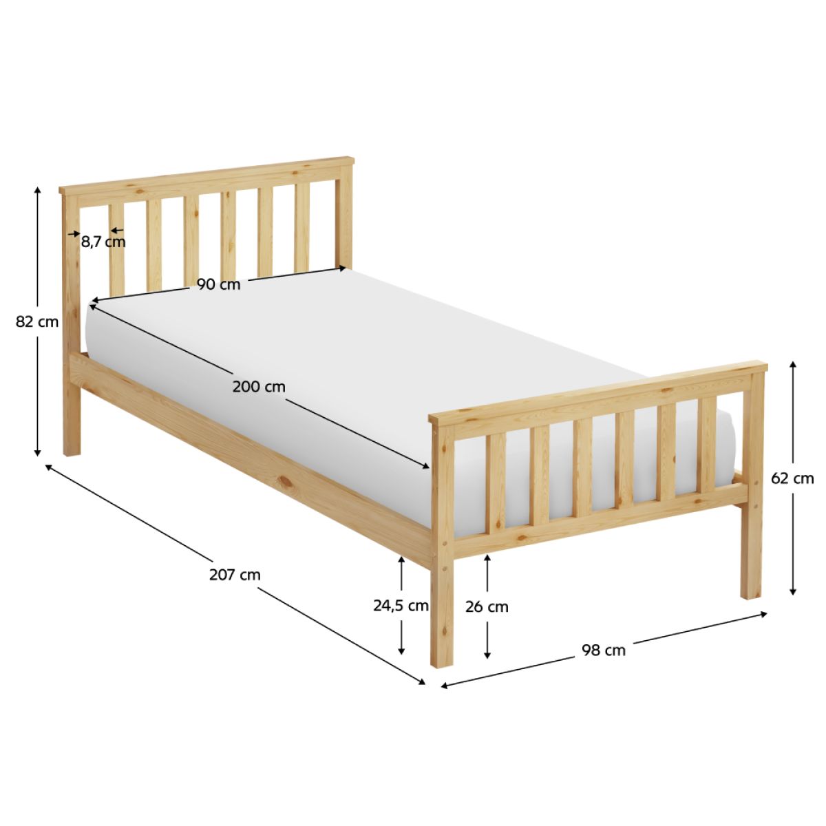 Material: lemn de pin Culoare: naturală Dimensiuni (lxAxh): 98x207x82 cm Suprafaţa pentru dormit (lxL): 90x200 cm Grosime material: 2 cm Portanţa pe locul de dormit: 90 kg Înălţime până la somieră: 26 cm Pe picioare Livrat cu somieră roluibilă din placaj Livrat fără saltea Opţiunea de a cumpăra o saltea din oferta noastră Înălţimea recomandată a saltelei: 7 cm Încastrarea saltelei: 3 cm Design simplu Practic Livrat asamblat