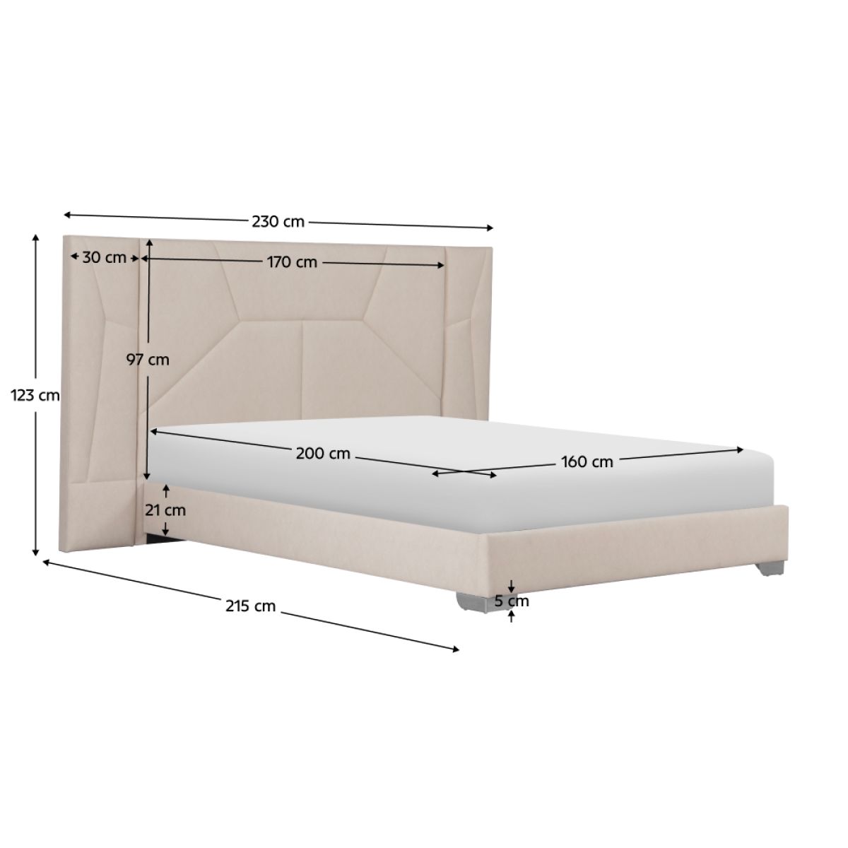 Material: ţesătură Velvet/MDF/placaj Rezistenţa ţesăturii la frecare conform testului Martindale: 25 000 de cicluri de frecare Culoare: bej Dimensiuni (lxAxh): 230x215x123 cm Suprafaţa pentru dormit (lxL): 160x200 cm Înălţimea somierei de la sol: 21,5 cm Înălţimea lateralei: 21 cm Cu tăblie frontală înaltă Frontală matlasată Înălţimea frontalei din spate: 123 cm Grosimea frontalei din spate: 6 cm Grosimea frontalei din faţă: 5 cm Pe picioare Material picioare: plastic Culoare picioare: argintiu Înălţime picioare: 5 cm Livrat cu iluminare LED Număr de culori de iluminare LED: 16 Cu telecomandă Furnizat cu somieră cu lamele Distanţă între lamele: 5,5 cm Livrat fără saltea Opţiunea de a cumpăra o saltea suplimentară din oferta noastră Înălţimea recomandată a saltelei: 15 - 25 cm Încastrarea saltelei: 4,5 cm Design elegant Portanţă pat: 150 kg Livrat dezasamblat