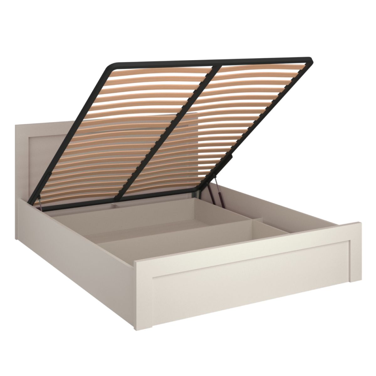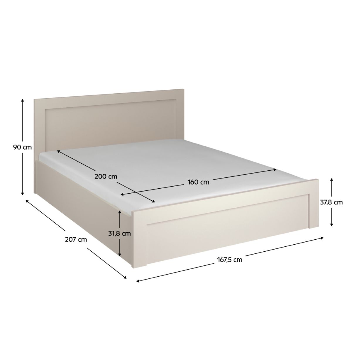 Material: DTD laminat Culoare: caşmir Dimensiuni (lxAxh): 167,5x207x90 cm Grosime material DTD: 1,6-3,2 cm Suprafaţa pentru dormit (lxL): 160x200 cm Portanţă pe persoană: 90 kg Înălţime până la somieră: 20 cm Livrat cu o somieră batantă Pistoane cu gaz Livrat fără saltea Posibilitatea de a achiziţiona o saltea din oferta noastră Încastrare saltea: 12 cm Înălţimea minimă recomandată a saltelei: 13 cm Cu spaţiu de depozitare Design modern Livrat dezasamblat