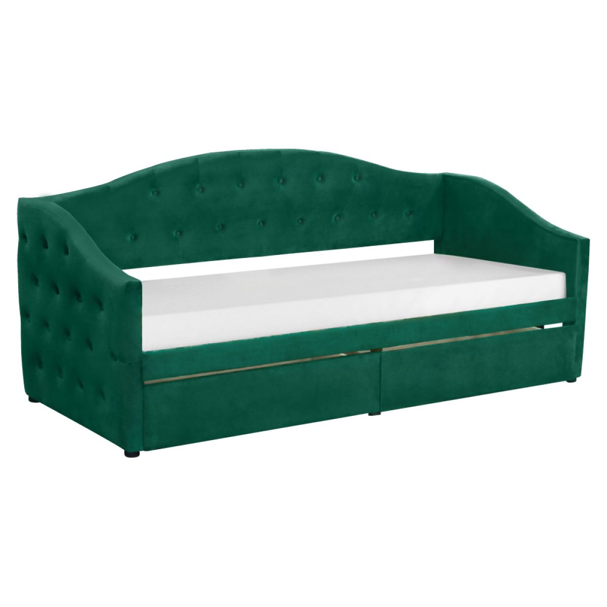 Material: ţesătură catifea/DTD/MDF/furnir laminat Rezistenţa la abraziune a ţesăturii conform testului Martindale: 70 000 de cicluri de frecare Culoare: verde Dimensiuni (Lxlxh): 217x94x96 cm Suprafaţa pentru dormit (Lxl): 90x200 cm Tapiţată Spaţiu de depozitare Două sertare Dimensiunea sertarului interior (Lxlxh): 37x91,4x14,8 cm Portanţa sertarului: 5 cm Portanţa pe loc de dormit: 150 kg Livrat cu 2 grătare cu lamele Înălţimea grătarului de la sol: 33,1 cm Livrat fără saltea Vă recomandăm să cumpăraţi o saltea din oferta noastră Laturi şi cap de pat decorative cusute Pe picioare Livrat dezasamblat