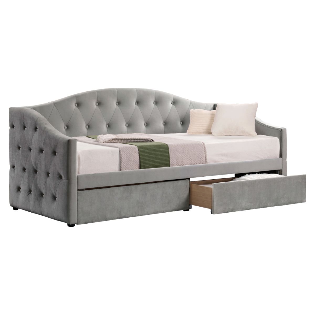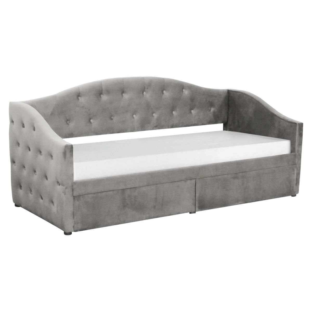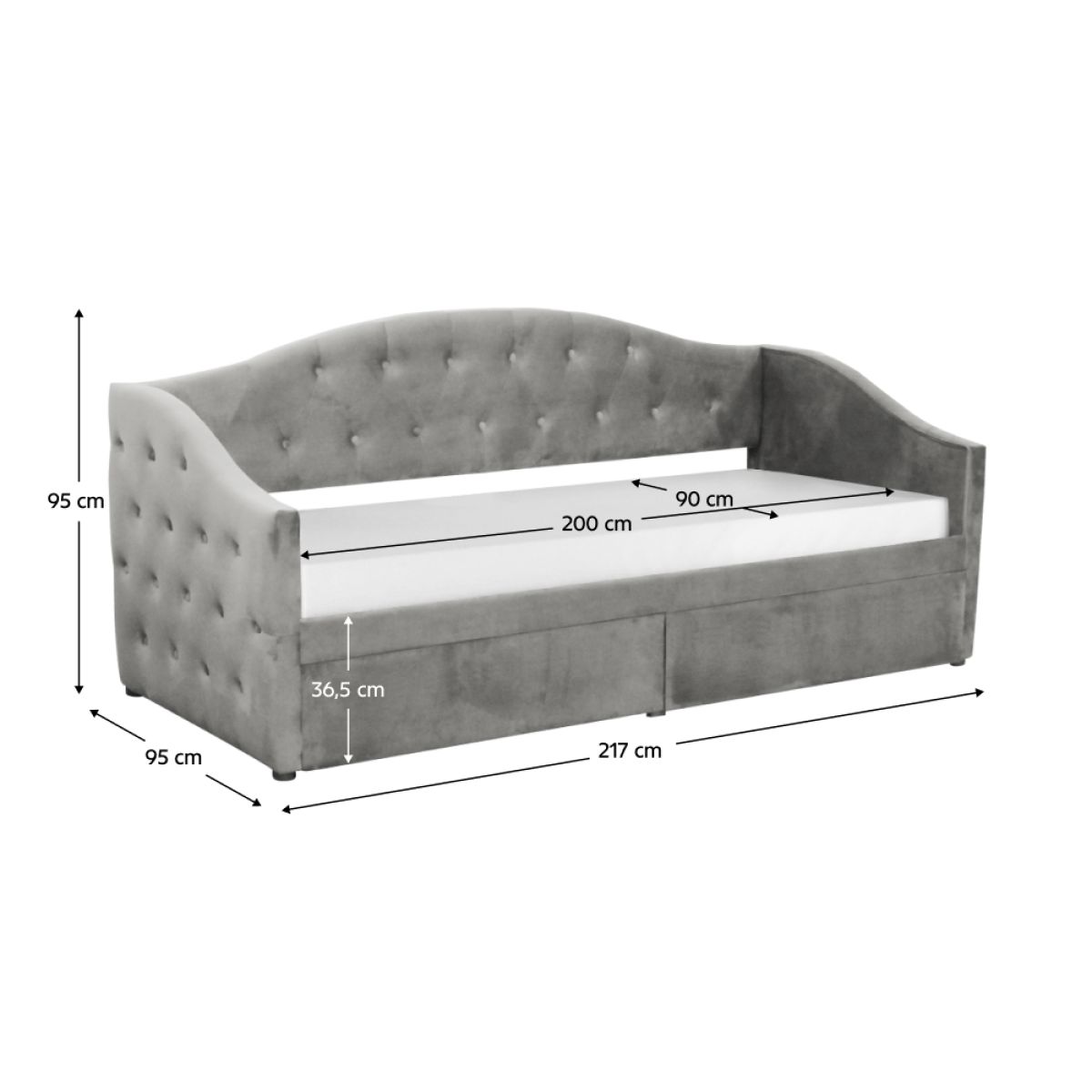 Material: ţesătură catifea/DTD/MDF/furnir laminat Rezistenţa la abraziune a ţesăturii conform testului Martindale: 70.000 de cicluri de frecare Culoare: gri Dimensiuni (Lxlxh): 217x94x96 cm Suprafaţa pentru dormit (Lxl): 90x200 cm Tapiţată Spaţiu de depozitare Două sertare Dimensiunea sertarului interior (Lxlxh): 37x91,4x14,8 cm Portanţa sertarului: 5 cm Portanţa pe loc de dormit: 150 kg Livrat cu 2 grătare cu lamele Înălţimea grătarului de la sol: 33,1 cm Livrat fără saltea Vă recomandăm să cumpăraţi o saltea din oferta noastră Laturi şi cap de pat decorative cusute Pe picioare Livrat dezasamblat
