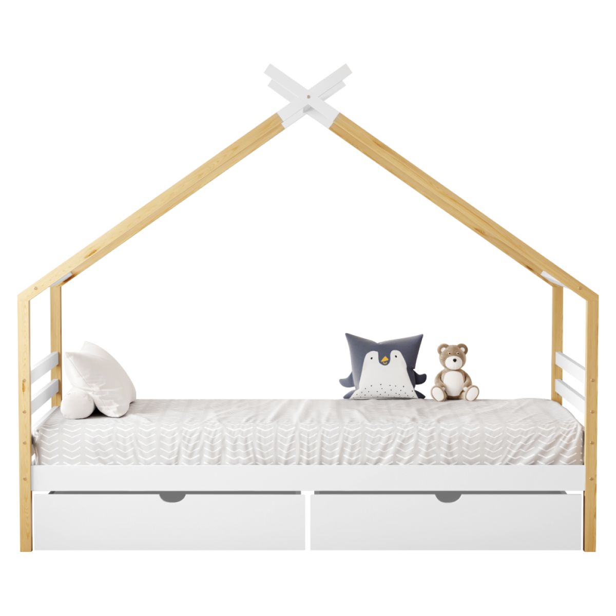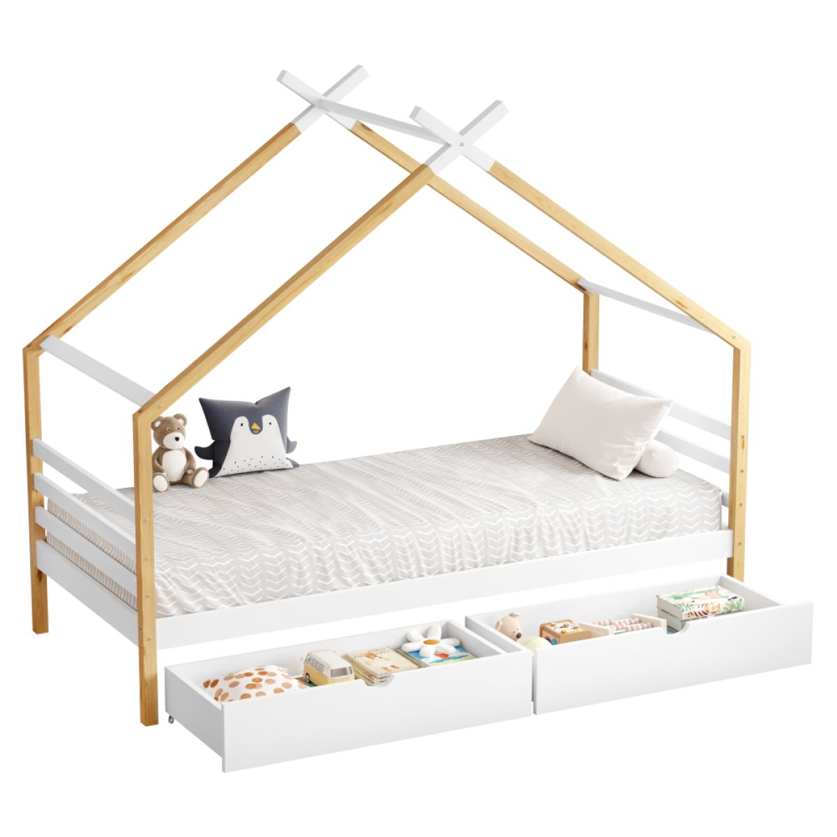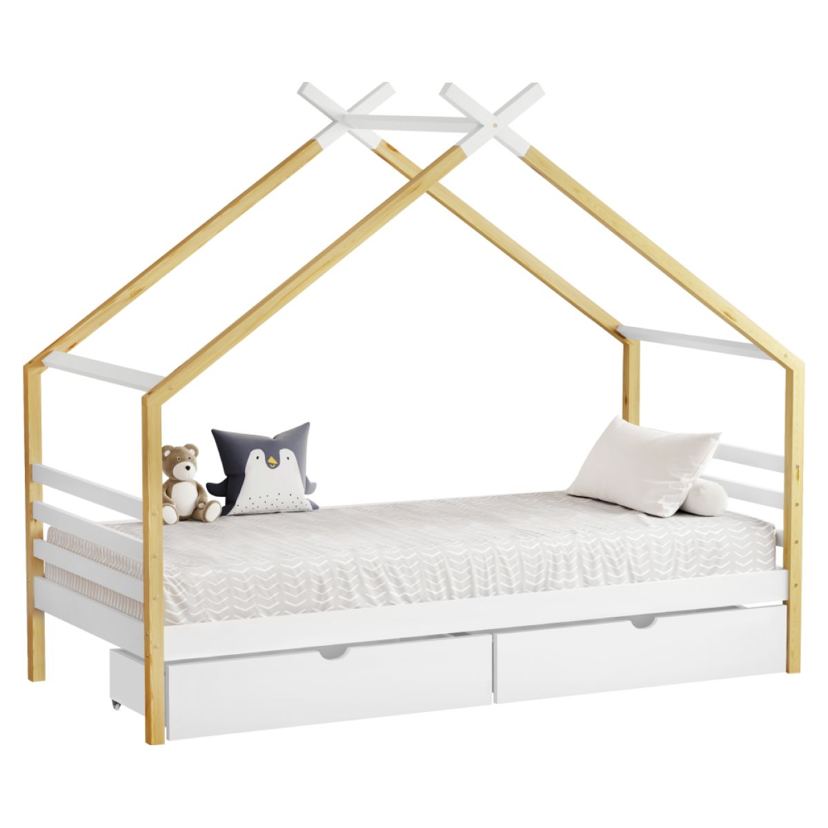 Material: lemn de pin Culoare: alb/maro Dimensiuni (lxAxh): 206x96x172,5 cm, Suprafaţa pentru dormit (lxL): 90x200 cm Înălţime până la somieră: 23 cm Portanţă: 90 kg Spaţiu de depozitare Două sertare Dimensiunea sertarului interior (lxAxh): 97x47x20 cm Portanţă sertar: 30 kg Pat sub formă de căsuţă. Livrat cu somieră roluibilă din placaj. Livrat fără saltea. Opţiunea de a cumpăra o saltea cu arcuri din oferta noastră. Înălţimea maximă recomandată a saltelei: 7 cm Încastrarea saltelei: 3 cm Livrat dezasamblat