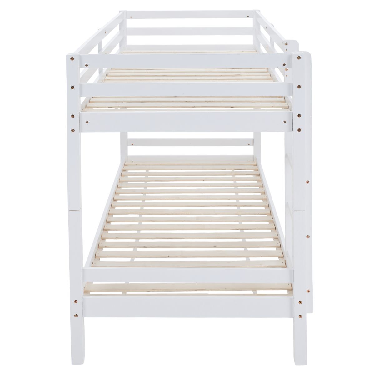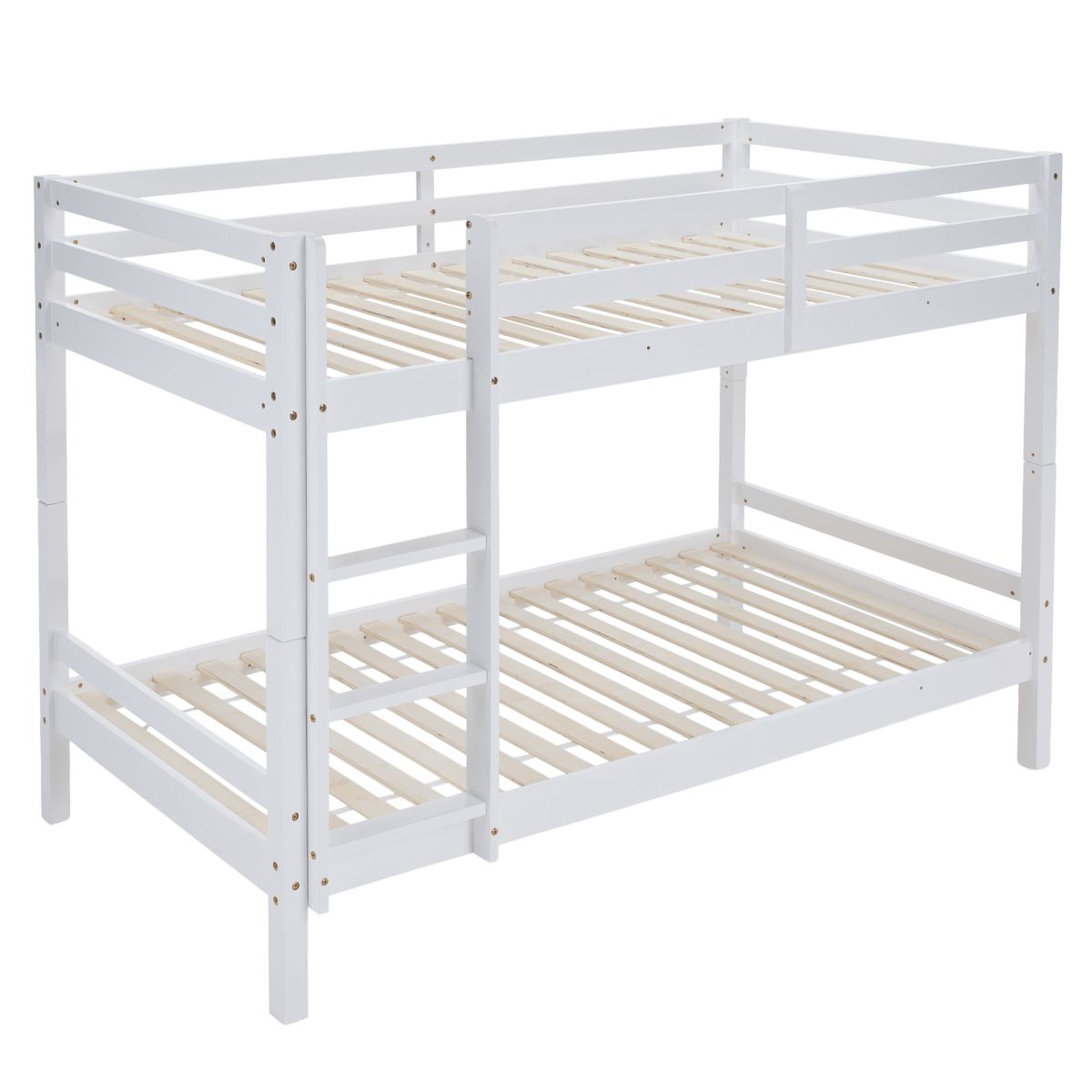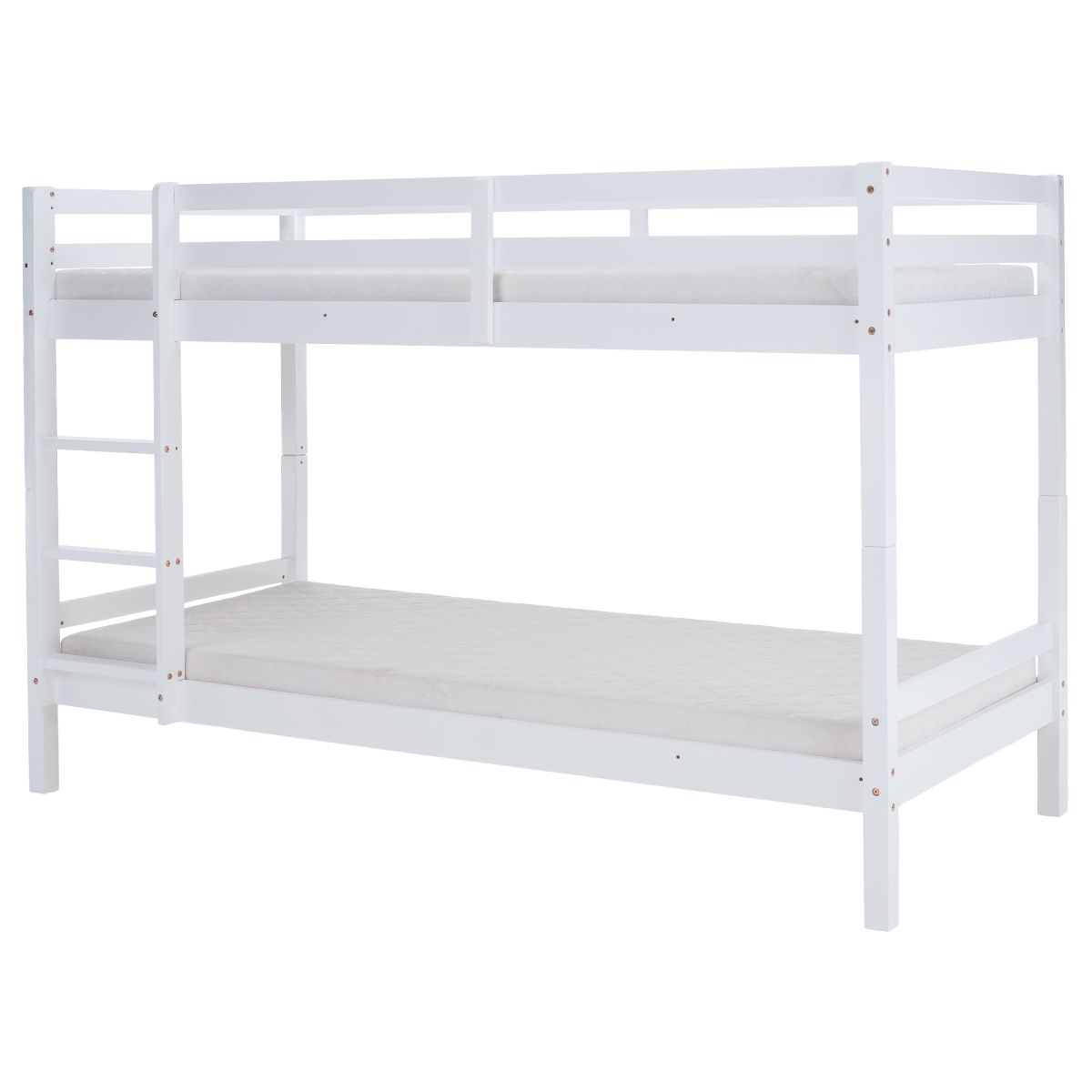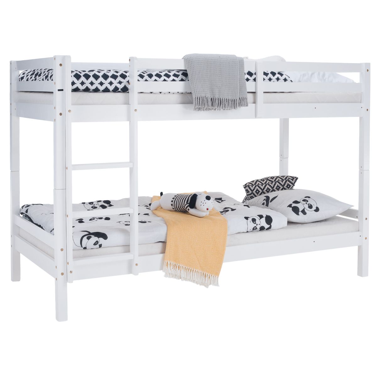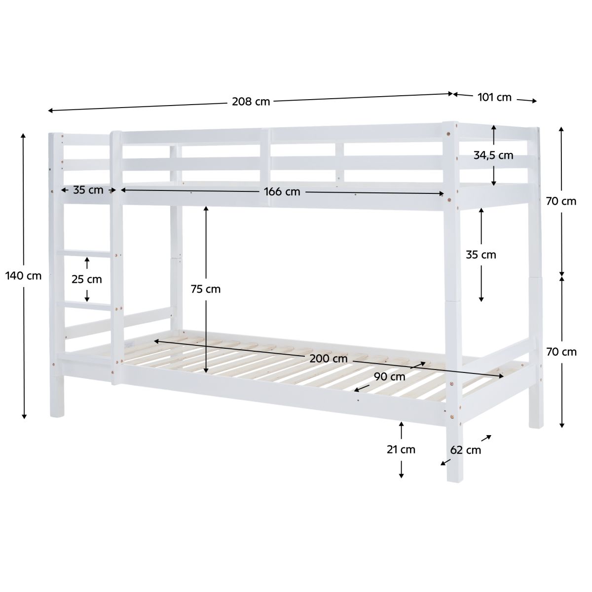 Material: lemn de pin Culoare: alb Dimensiuni (lxAxh): 208x97x140 cm Suprafaţa pentru dormit (lxA): 90x200 cm Înălţimea dintre patul inferior şi cel superior: 75 cm Grosime material: 2 cm Portanţă pentru patul superior: 90 kg Portanţă pentru patul inferior: 95 kg Înălţimea recomandată a saltelei pentru patul inferior: 20 cm Înălţimea recomandată a saltelei pentru patul superior: max. 14 cm Pe picioare Înălţime pentru patul inferior: 21 cm Înălţime pentru patul superior: 35 cm Grosimea materialului piciorului: 5x5 cm Marginile patului sunt rotunjite Livrat cu scară Opţiunea de a fixa scara pe partea dreaptă sau stângă Pat superior cu barieră împotriva căderii Extensibil la două paturi Se livrează cu grătar roluibil Livrate fără saltea Posibilitate de achiziţionare a saltelei cu arcuri din oferta noastră Vopselele şi lacurile utilizate respectă toate standardele şi normele de siguranţă stabilite. Livrat dezasamblat