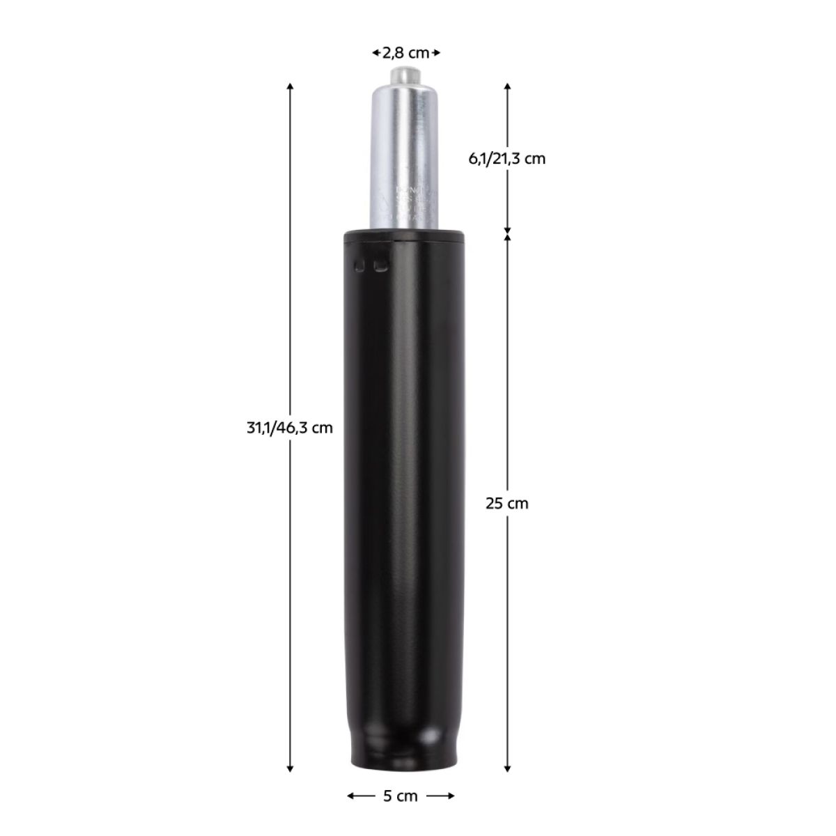 Material: metal Culoare: neagră Diametru piston: 5 cm Diametrul tijei pistonului: 2,8 cm Lungime totală a pistonului: 46,3 cm Lungimea corpului pistonului: 25 cm Extensie: 15,2 cm Forţă piston: 300 N Portanţă: max. 150 kg Greutate: 0,9 kg Piston cu gaz de schimb Pentru fotolii de birou Pentru scaune de birou Pentru scaune pivotante