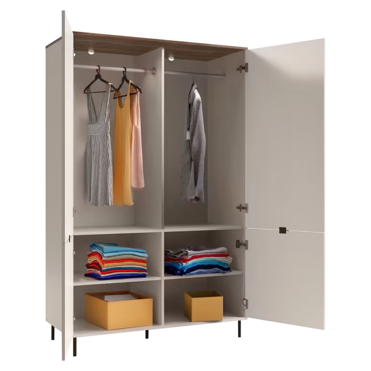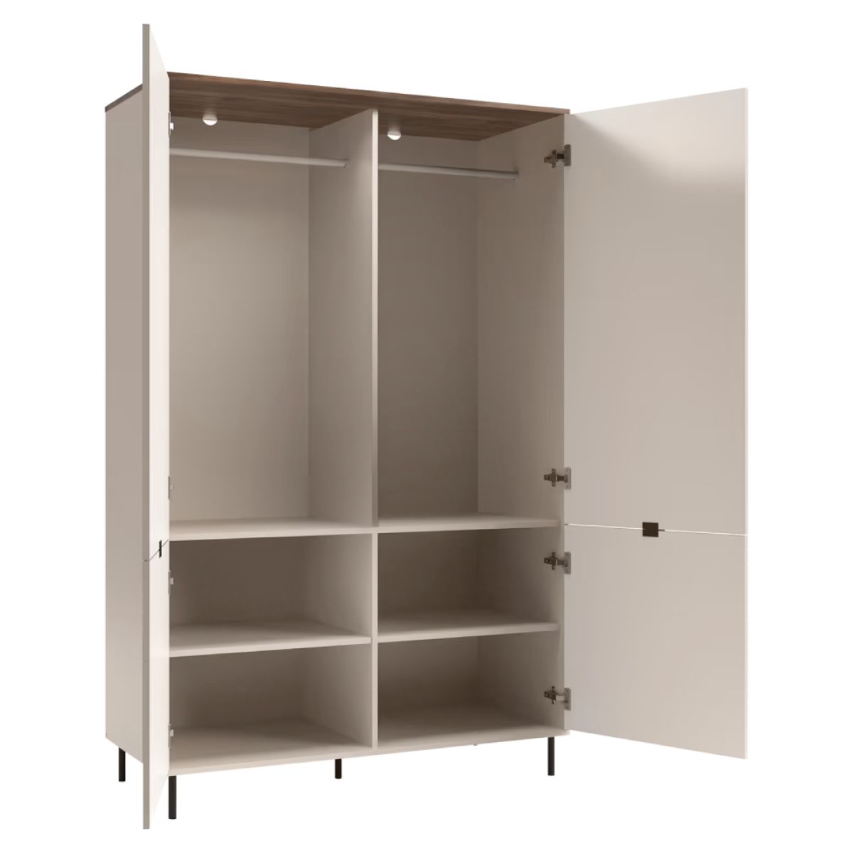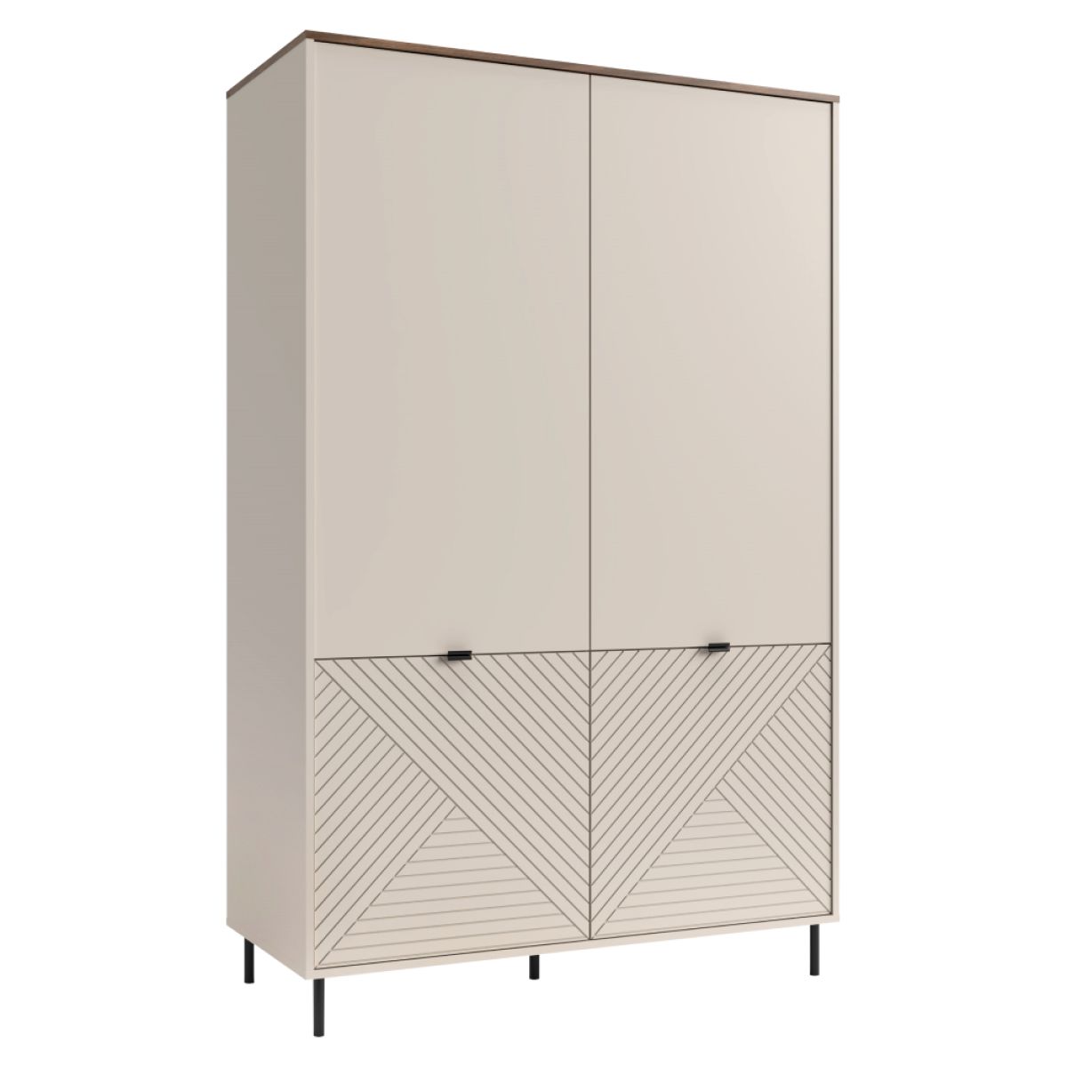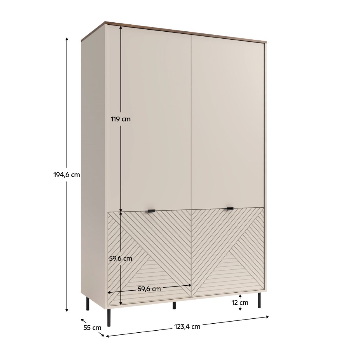 Material: DTD laminat/MDF înfoliat/margini ABS Culoare: caşmir/stejar castello Dimensiuni (lxAxh): 123,2x55x194,6 cm Grosimea materialului: 1,6 cm Cu patru uşi 2x bară pentru umeraşe Cu poliţe Cu mânere Materialul mânerelor: metal Culoare mânere: neagră Pe picioare Materialul picioarelor: metal Culoarea picioarelor: neagră Înălţimea picioarelor: 12 cm Portanţă placă superioară: 10 kg Portanţă barei de umeraşe: 5 kg Portanţa poliţei: 6 kg Uşi decorative Design modern Recomandăm fixarea mobilierului de perete Livrat dezasamblat