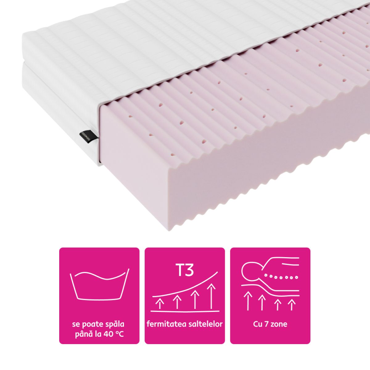 Material: Spumă PUR/husă Dimensiuni (lxL): 120x200 cm Înălţimea saltelei: 14 cm Portanţă pe persoană: 100 kg Fermitatea saltelei: medium dură H3 cu două feţe Husă certificată OEKO-TEX STANDARD Husă matlasată Husă din microfibră OVATA Profilare în 7 zone Cu fermoar pe tot perimetrul Detaşabilă Se poare spăla la temperaturi de până la 40 °C Antibacteriană Antialergică Antiacariană Miezul perforat al saltelei asigură ventilaţie suficientă Recomandat pentru grătare cu spaţii de max. 6 cm