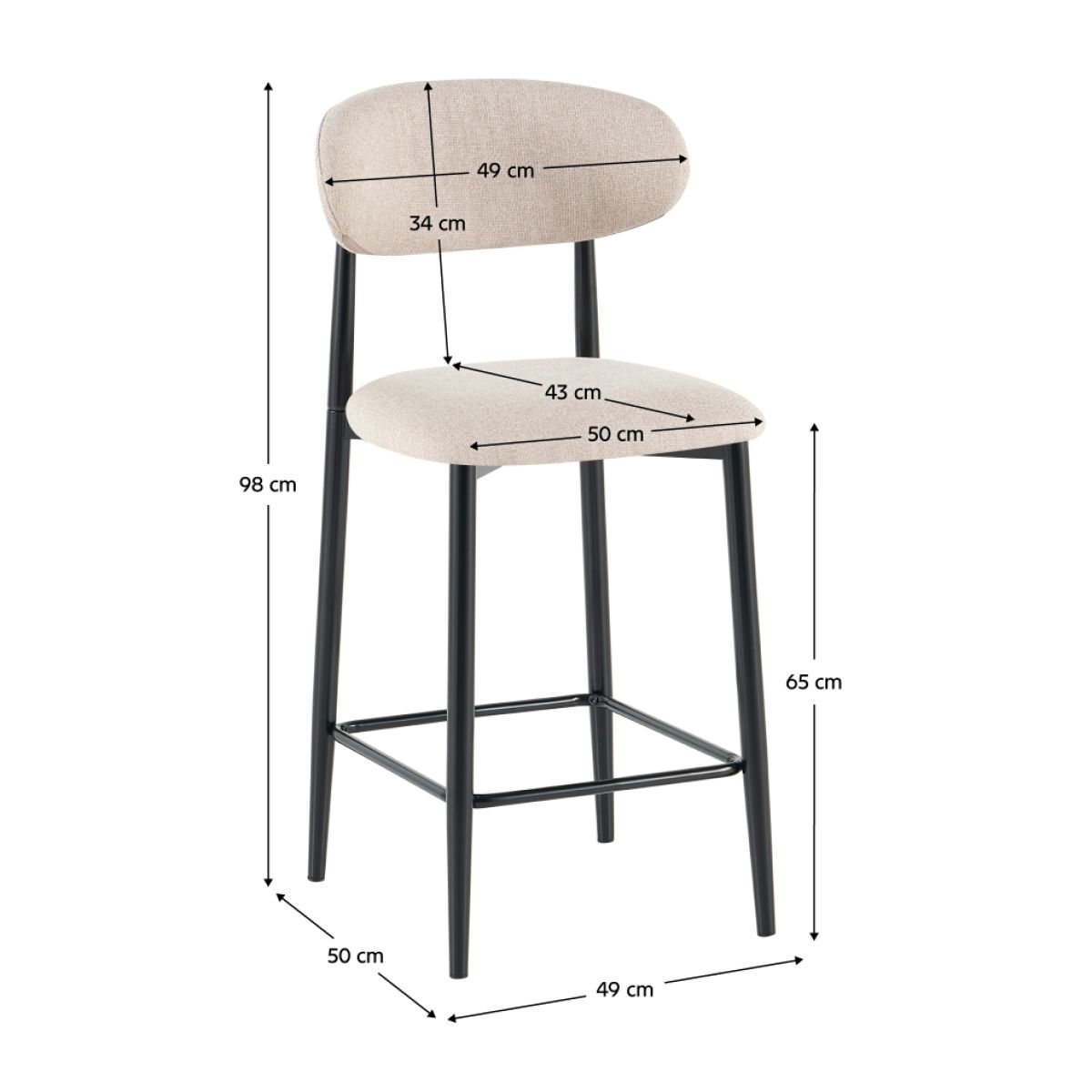Material: ţesătură/metal Rezistenţa ţesăturii la frecare conform testului Martindale: 80 000 de cicluri de frecare Culoare: bej/neagră Dimensiuni (lxAxh): 49x50x98 cm Înălţimea părţii de şezut: 65 cm Adâncimea părţii de şezut: 43 cm Lăţimea părţii de şezut: 50 cm Lăţime spătar: 49 cm Înălţime spătar: 34 cm De bar De design Portanţă: 100 kg Livrat dezasamblat