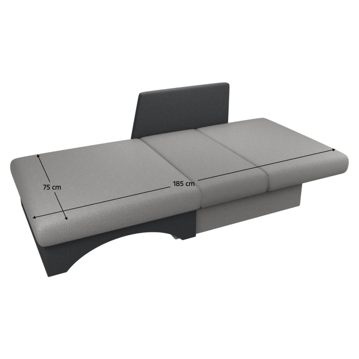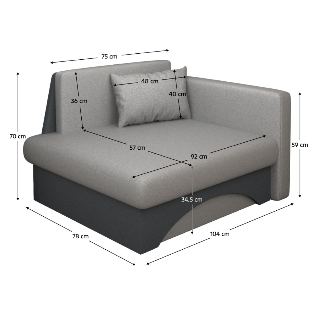 Material: ţesătură Malmo 90/96 Rezistenţa ţesăturii la frecare conform testului Martindale: 30 000 de cicluri Culoare: gri/gri închis Dimensiuni (lxAxh): 104x78x70 cm Suprafaţa pentru dormit: 75x185 cm Înălţimea părţii de şezut: 34,5 cm Adâncimea părţii de şezut: 57 cm Lăţimea părţii de şezut: 92 cm Înălţimea cotierei de la sol: 59 cm Dimensiunile spătarului (lxh): 75x36 cm Portanţă pe persoană: 90 kg Livrat cu pernă Dimensiuni pernă (lxh): 48x40cm Extensibilă Compartiment de depozitare Design adevărat Umplutură: spumă pur T28 Livrat asamblat