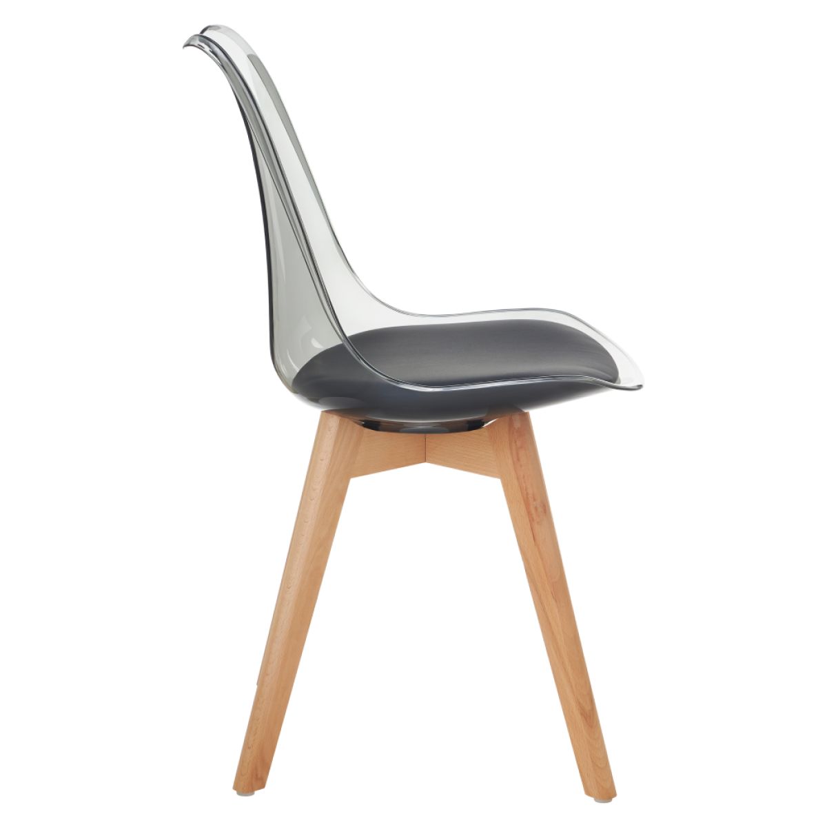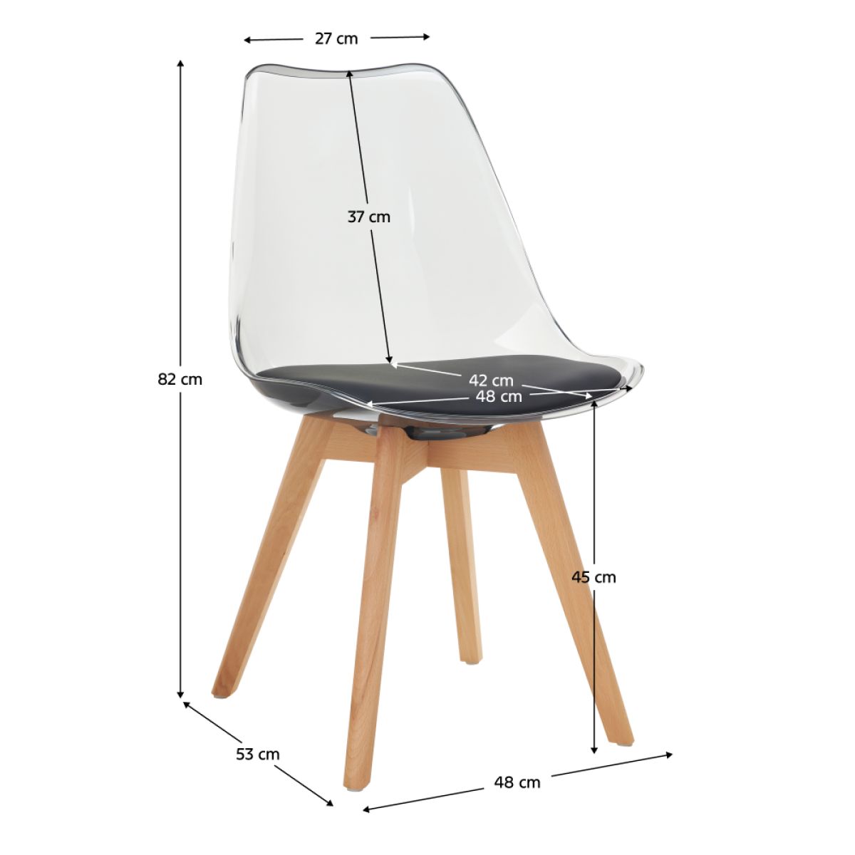 Material: acrilat/piele ecologică/metal/lemn de fag Rezistenţa ţesăturii la frecare conform testului Martindale: 100 000 abraziuni Culoare: negru transparent/negru/fag Dimensiuni (Lxlxh): 48x53x82 cm Înălţime scaun: 45 cm Adâncime parte de şezut: 42 cm Scaun extra moale Finisaj acrilic Portanţă: 100 kg Livrat dezasamblat