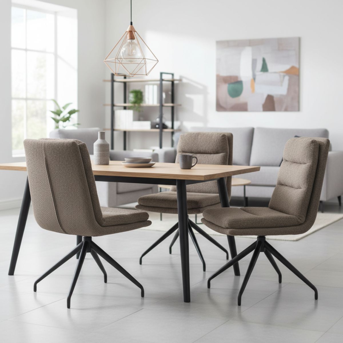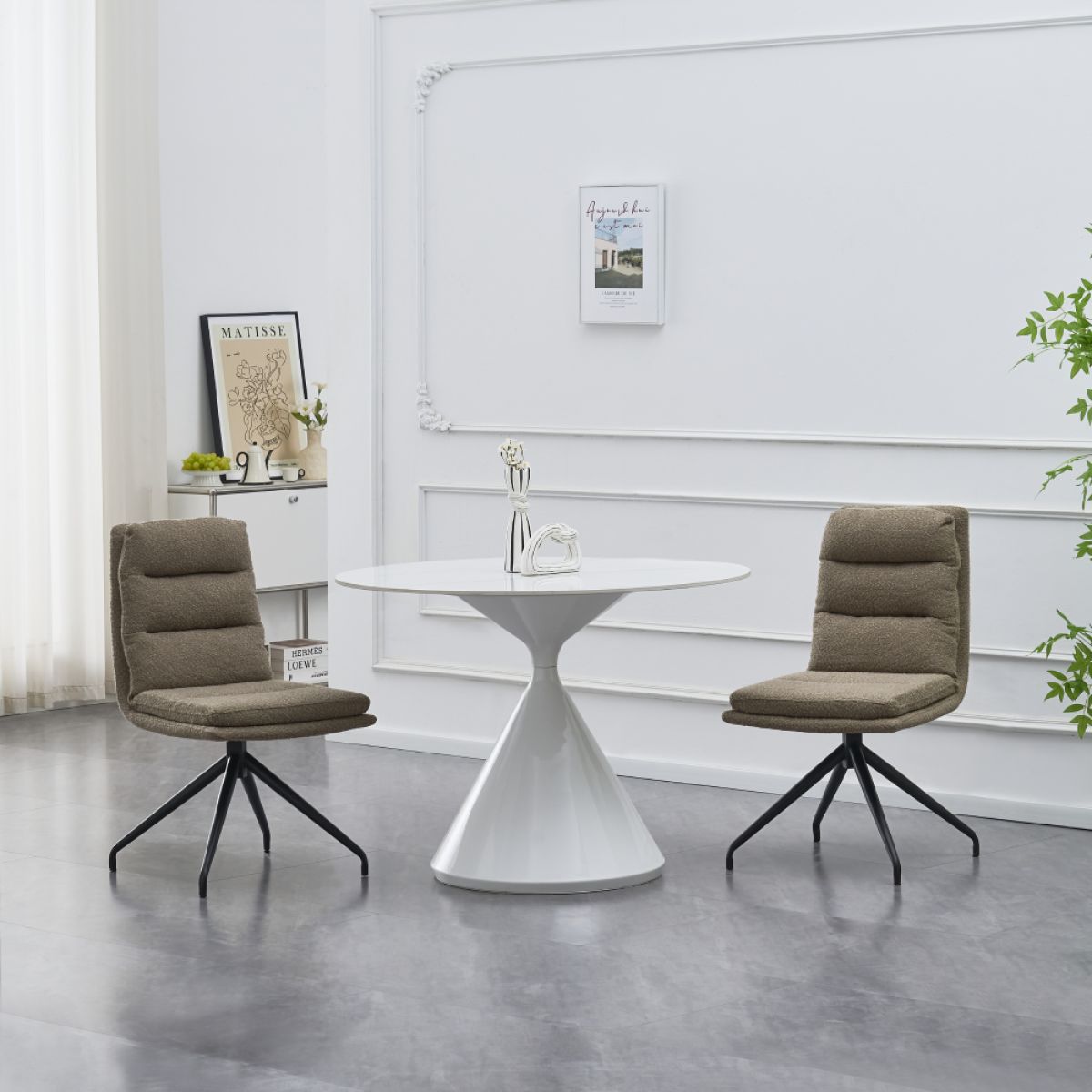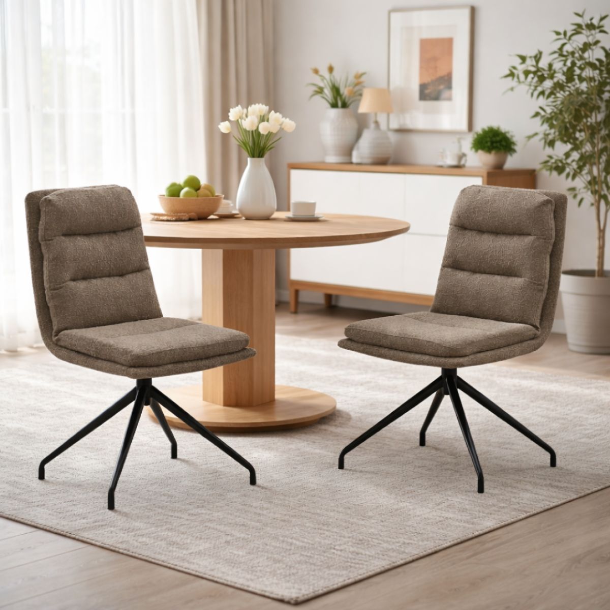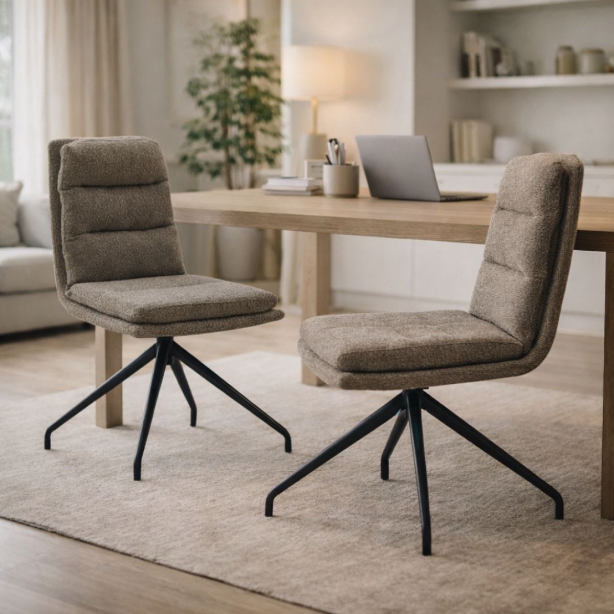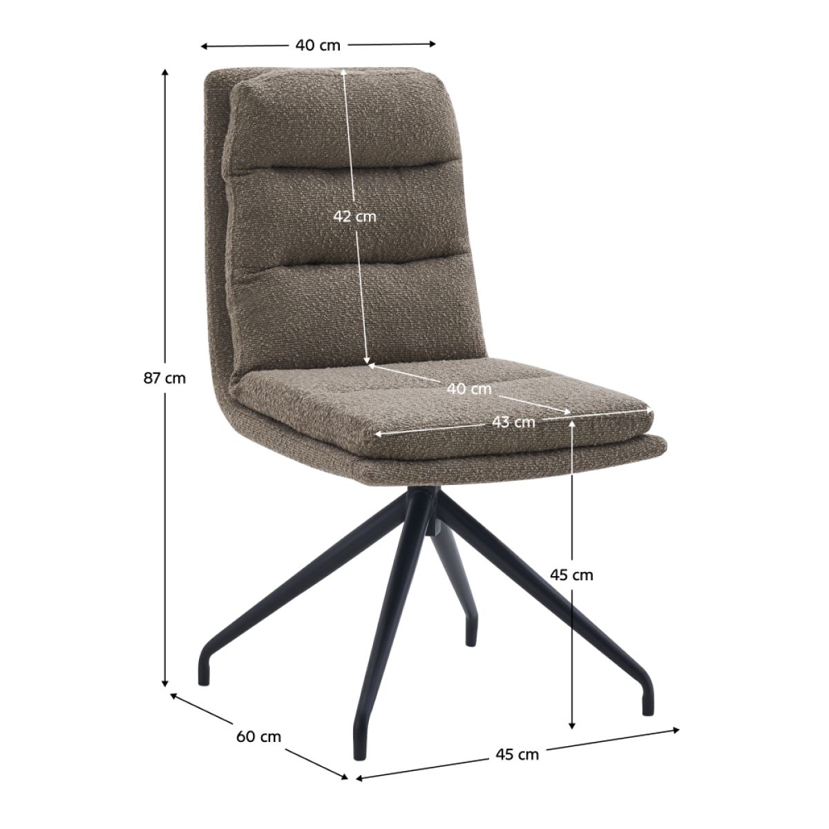 Material: ţesătură Bouclé/metal Rezistenţa ţesăturii la frecare conform testului Martindale: 80 000 de cicluri de frecare Culoare: bej/neagră Dimensiuni (lxAxh): 45x60x87 cm Înălţime părţii de şezut: 45 cm Adâncimea părţii de şezut: 40 cm Lăţime şezutului: 43 cm Lăţime spătar: 40 cm Înălţime spătar: 42 cm Portanţă: 100 kg Cusături decorative De sufragerie Scaun pivotant Design modern Livrat dezasamblat