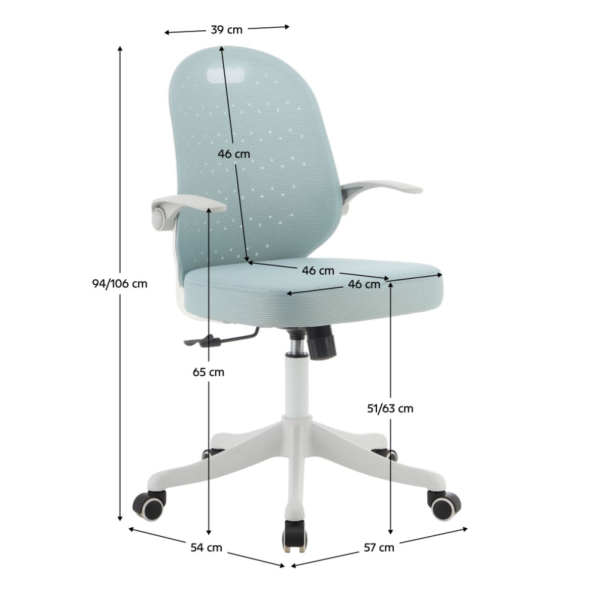 Material: plasă/plastic Rezistenţa plasei conform testului Martindale: 90 000 de cicluri de frecare Culoare: neomint/alb/gri Dimensiuni (lxAxh): 57x54x94-106 cm Înălţimea părţii de şezut: 51-63 cm Adâncimea părţii de şezut: 46 cm Lăţimea părţii de şezut: 46 cm Înălţime spătar: 46 cm Lăţime spătar: 39 cm Greutate: 6,75 kg Portanţa: 100 kg Scaun rotativ Înălţime reglabilă a scaunului Cotiere rabatabile Suport pentru picioare Rotile universale Rotile potrivite atât pentru pardoselile dure, cât şi pentru cele moi, Livrat dezasamblat
