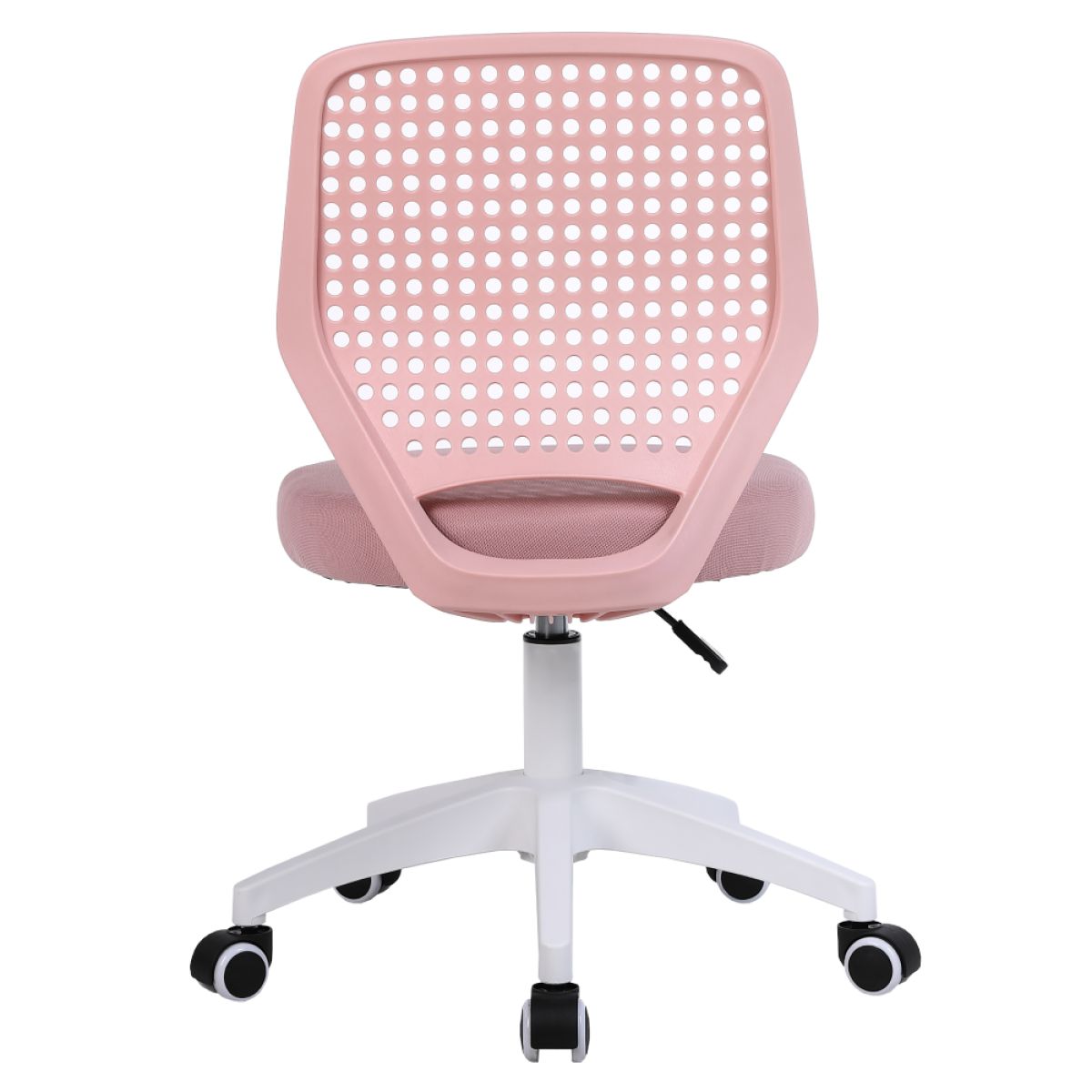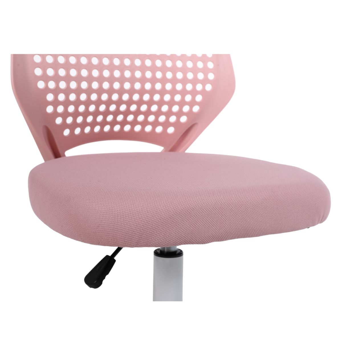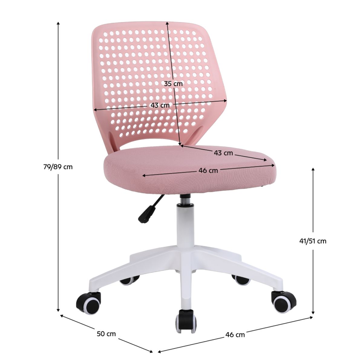 Material: plasă /plastic Rezistenţa ţesăturii la frecare conform testului Martindale: 15 000 de cicluri de frecare Culoare: roz/albă Dimensiuni (lxAxh): Înălţimea părţii de şezut: 46x50x79/89 cm 41-51 cm Lăţimea părţii de şezut: 46 cm Adâncimea părţii de şezut: 43 cm Înălţime spătar: 43 cm Lăţime spătar: 35 cm Portanţă: 100 cm Pivotant Roţi universale pivotante Potrivite pentru pardoseli dure şi moi Bază cu cinci braţe Livrat dezasamblat