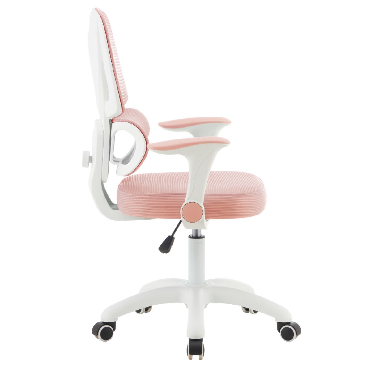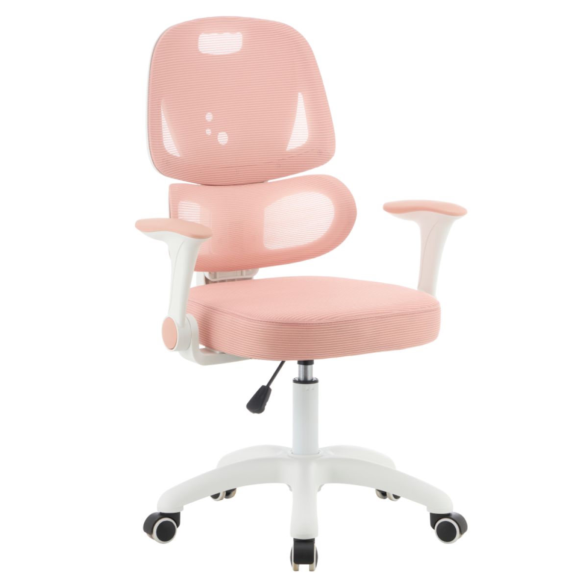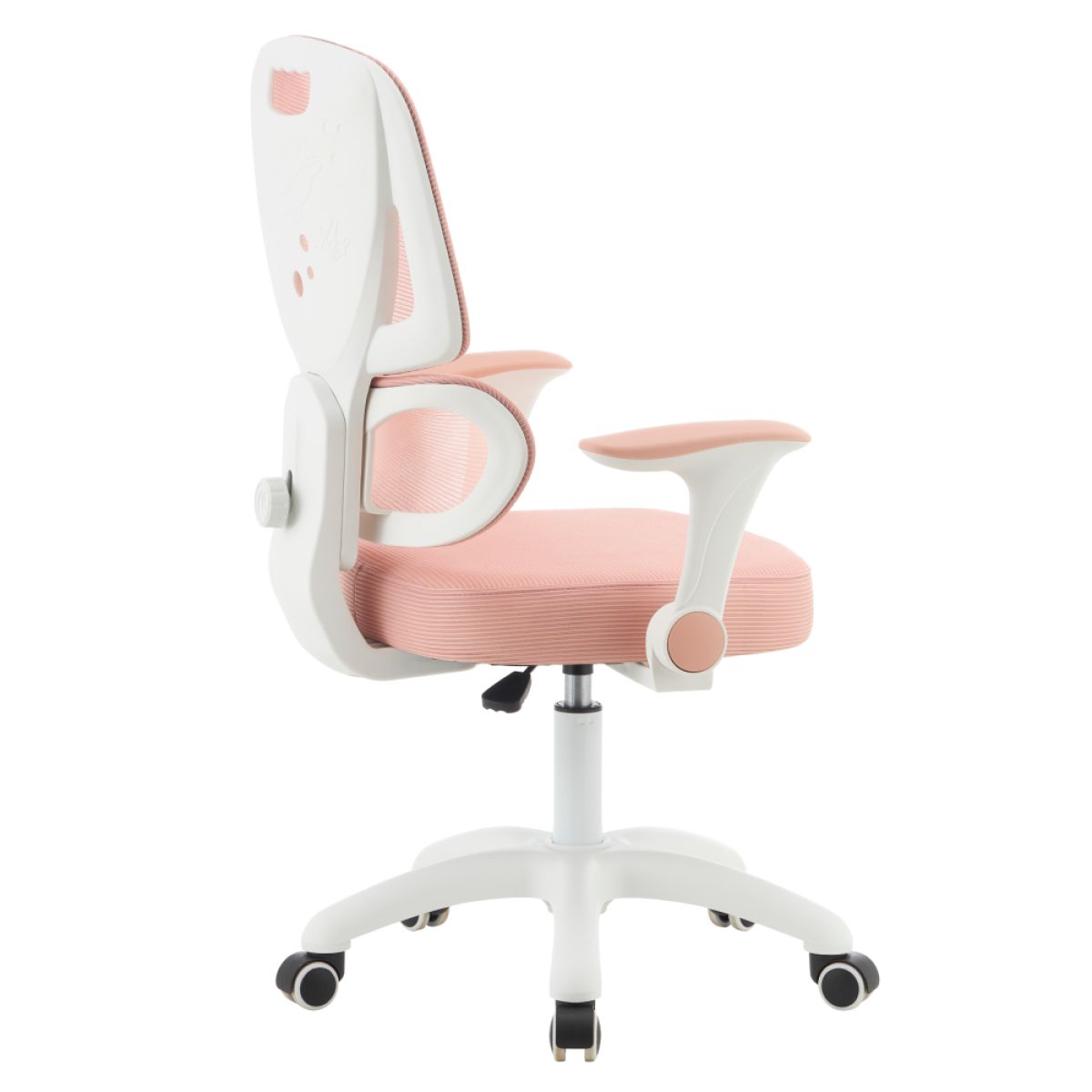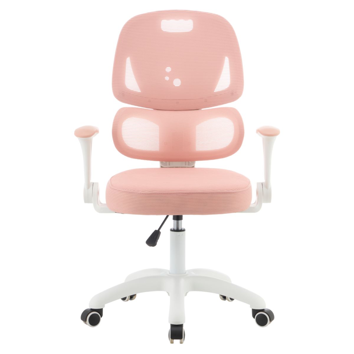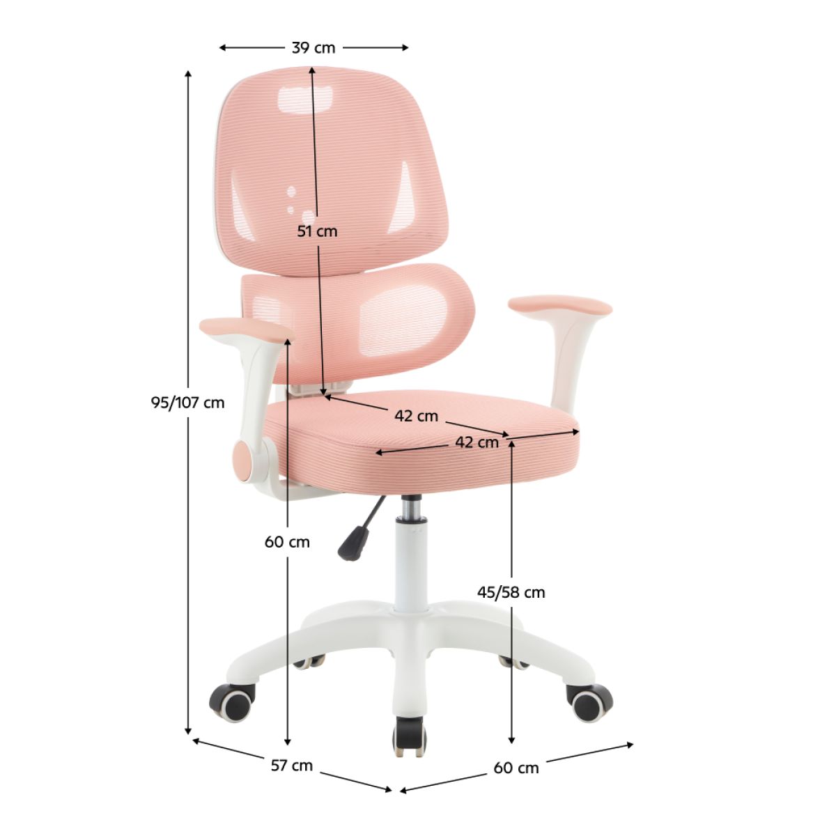 Material: plasă/plastic Rezistenţa plasei conform testului Martindale: 90 000 de cicluri de frecare Culoare: roz/albă Dimensiuni (lxAxh): 60x57x95-107 cm Înălţimea părţii de şezut: 45-58 cm Adâncimea părţii de şezut: 42 cm Lăţimea părţii de şezut: 42 cm Înălţime spătar: 51 cm Lăţime spătar: 39 cm Greutate: 8,26 kg Portanţă: 100 kg Scaun rotativ Suport lombar ergonomic Înălţime reglabilă a şezutului Înălţime reglabilă a spătarului Cotiere rabatabile Roţi universale Roţile sunt potrivite atât pentru podele moi, cât şi dure Caracteristici ergonomice practice Livrat dezasamblat