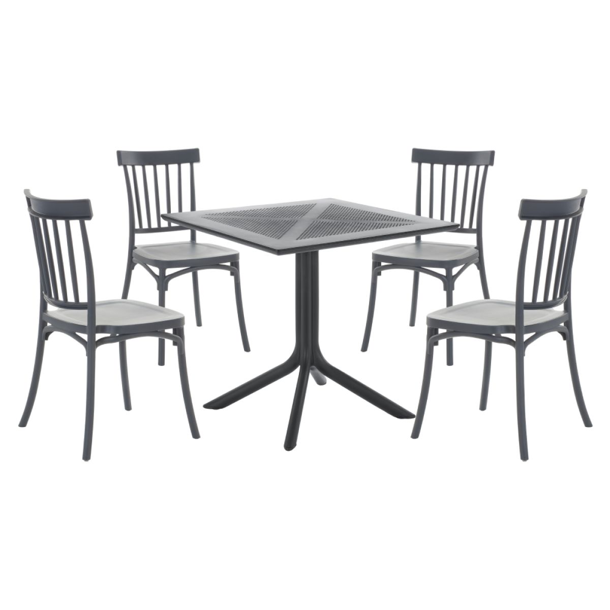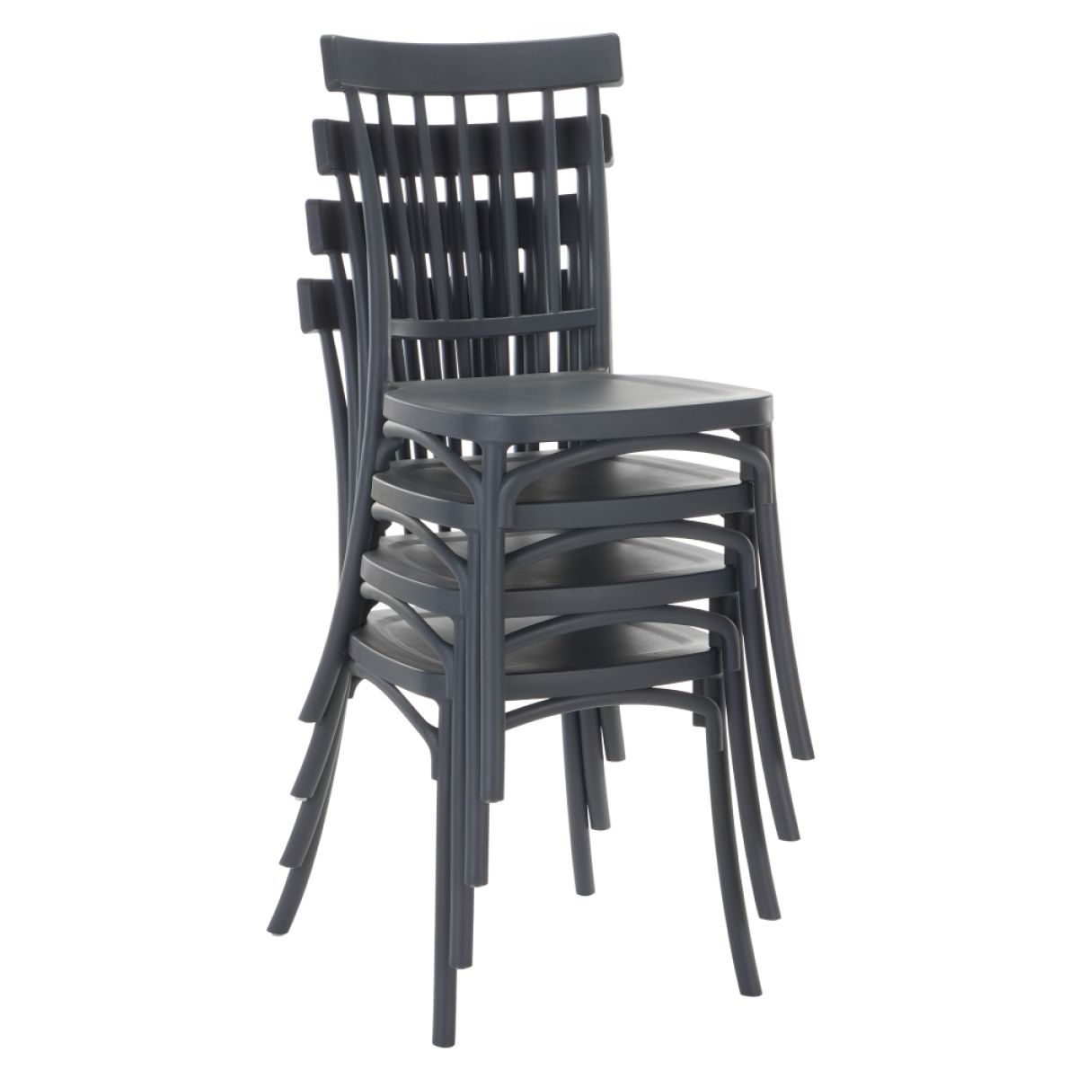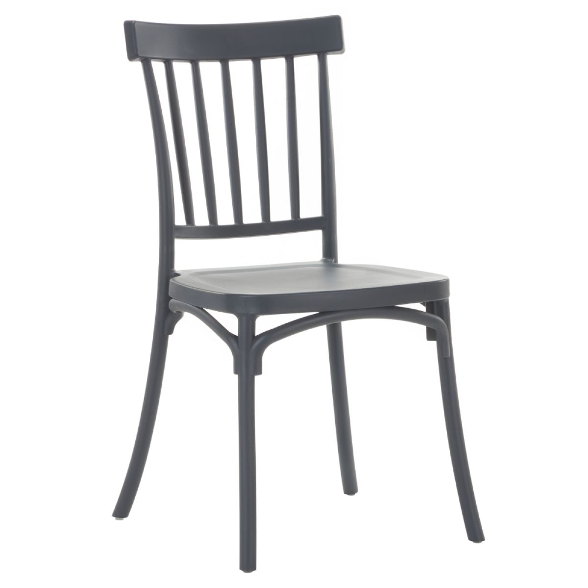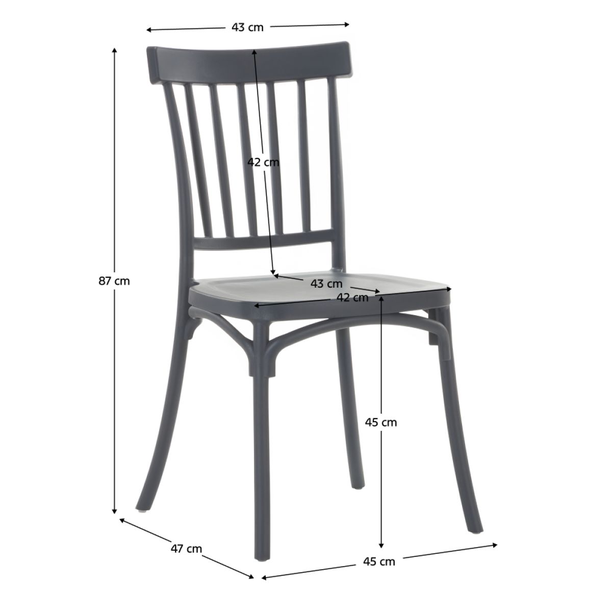 Material: plastic Culoare: gri închis Dimensiuni (lxAxh): 45x47x87 cm Înălţimea părţii de şezut: 45 cm Adâncimea părţii de şezut: 43 cm Lăţimea părţii de şezut: 42 cm Înălţime spate: 42 cm Stivuibil Cu filtru UV Potrivit pentru interior şi exterior. Portanţă: 100 kg Livrat asamblat
