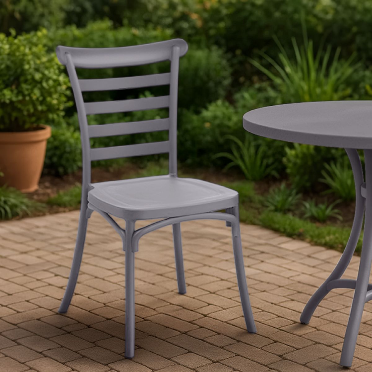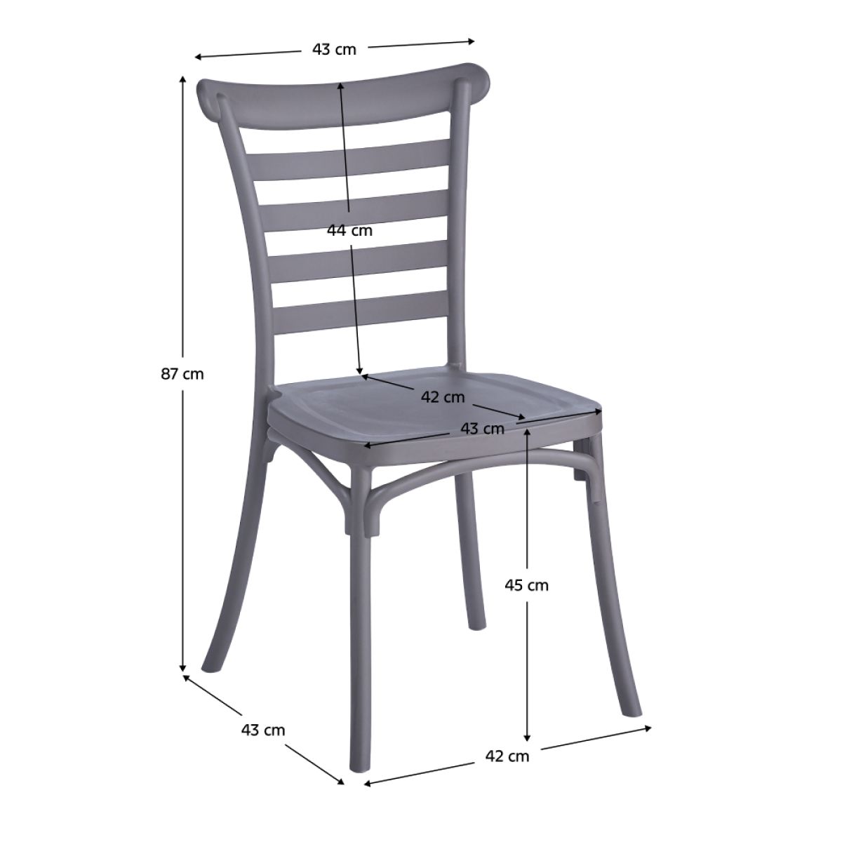 Material: plastic Culoare: gri maroniu taupe Dimensiuni (Lxlxh): 42x43x87 cm Înălţimea părţii de şezut: 45 cm Adâncimea părţii de şezut: 42 cm Lăţimea părţii de şezut: 43 cm Înălţime spătar: 44 cm Lăţime spătar: 43 cm Portanţă: 100 kg Stivuibil Potrivit pentru interior şi exterior Livrat asamblat