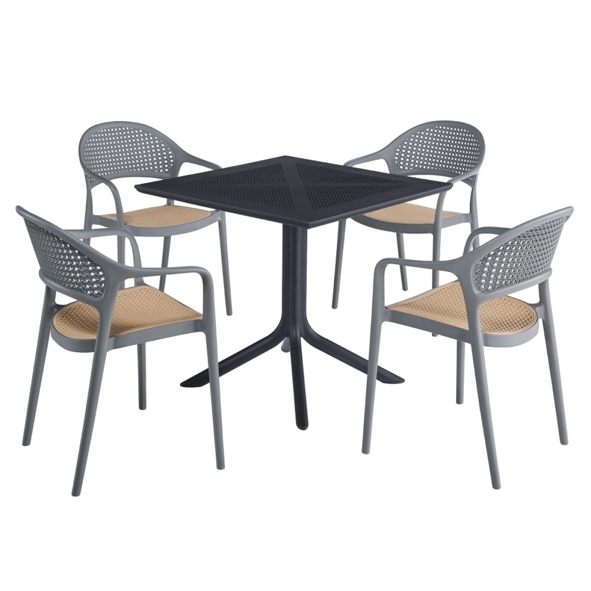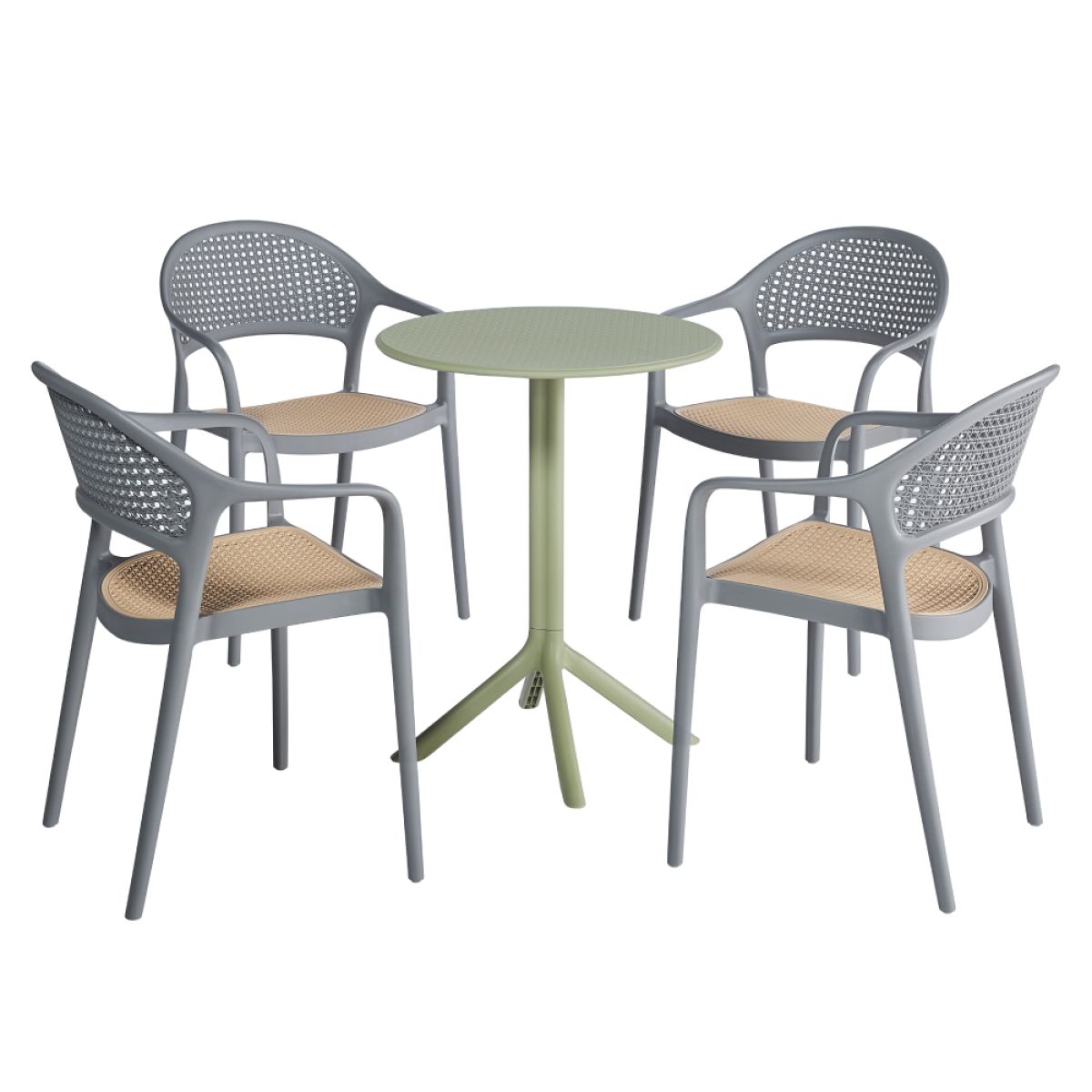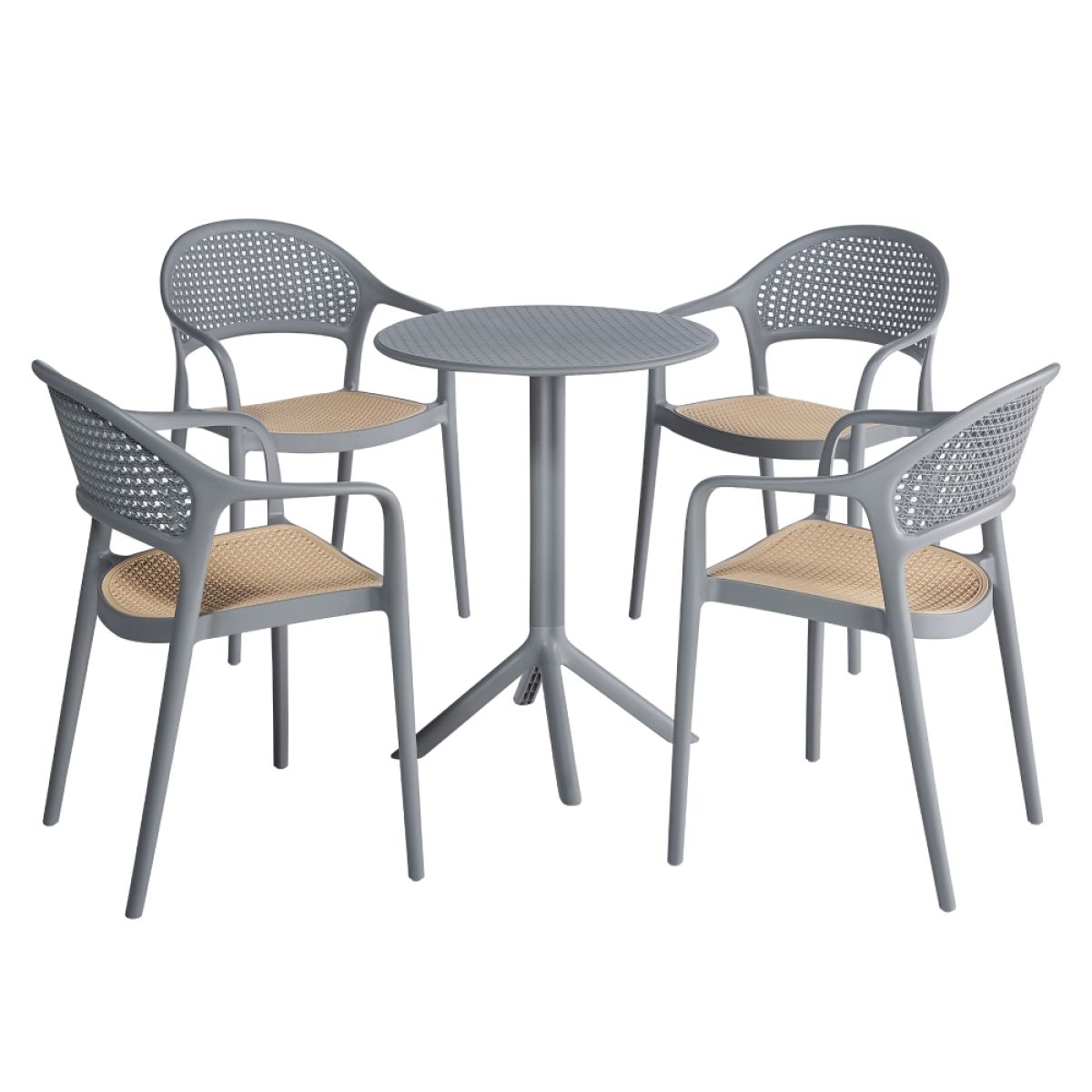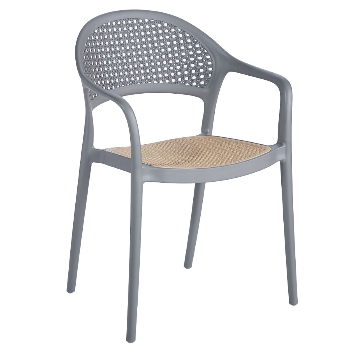 Material: plastic Culoare: gri/bej Dimensiuni (lxAxh): 57x60x81 cm, înălţimea şezutului scaunului: 45 cm Adâncimea părţii de şezut: 42 cm Lăţimea părţii de şezut: 43 cm Înălţime spătar: 32 cm, Lăţime spătar: 50 cm Portanţă: 100 kg Greutate: 5 kg Scaun de sufragerie Scaun de grădină Stivuibil, Potrivit atât pentru interior, cât şi pentru exterior, Livrat asamblat