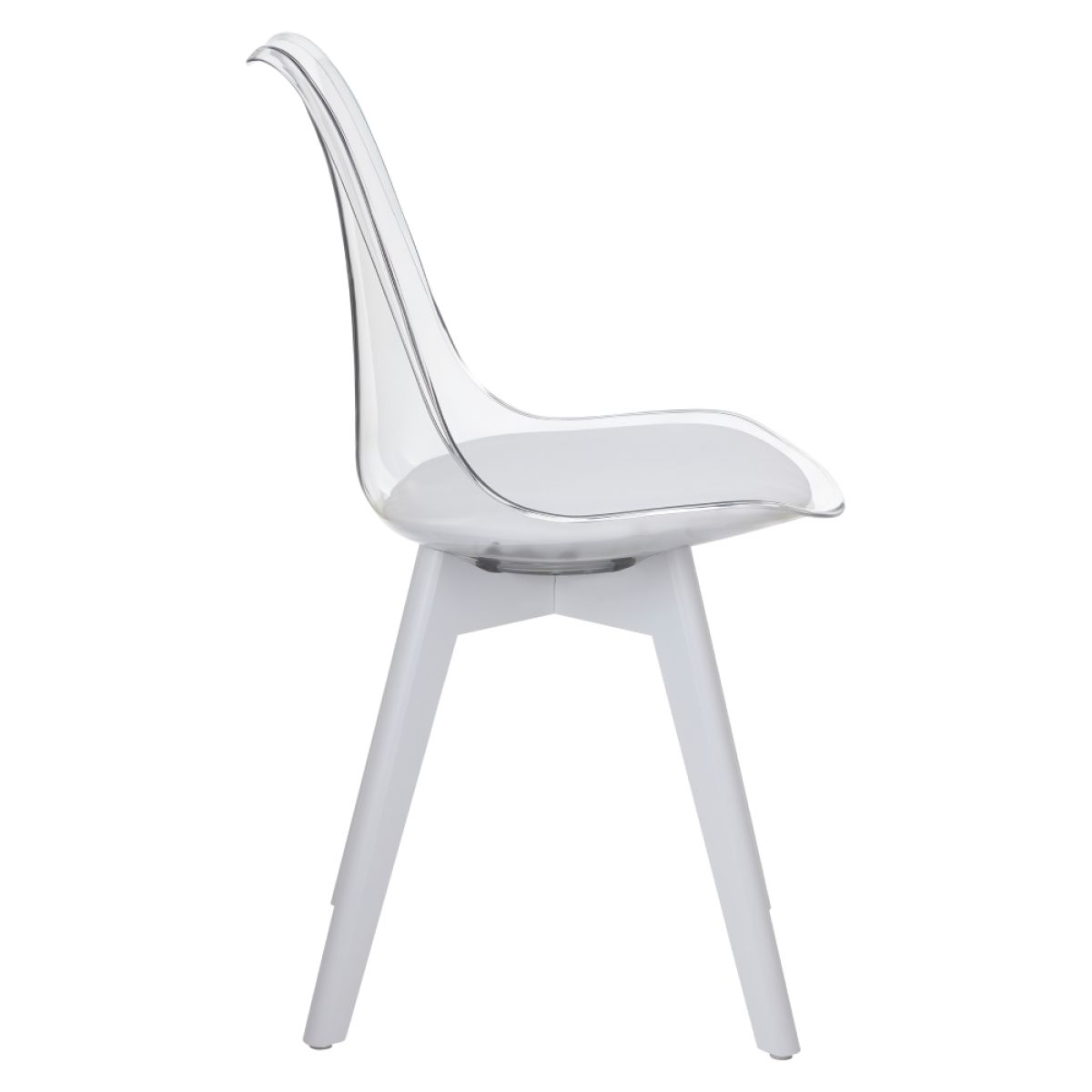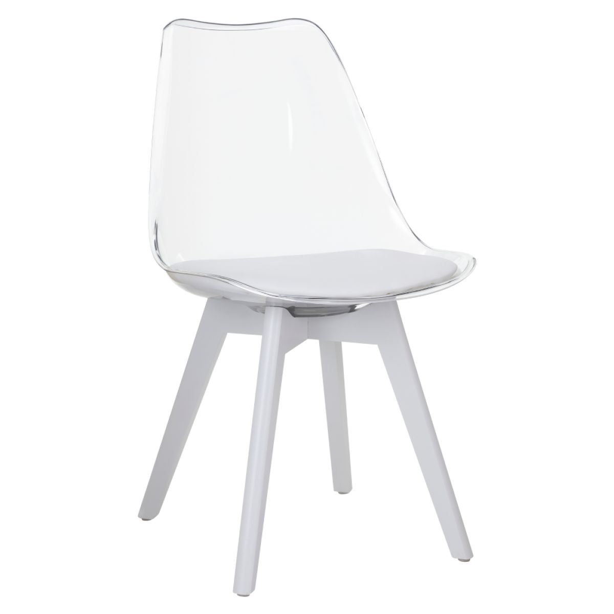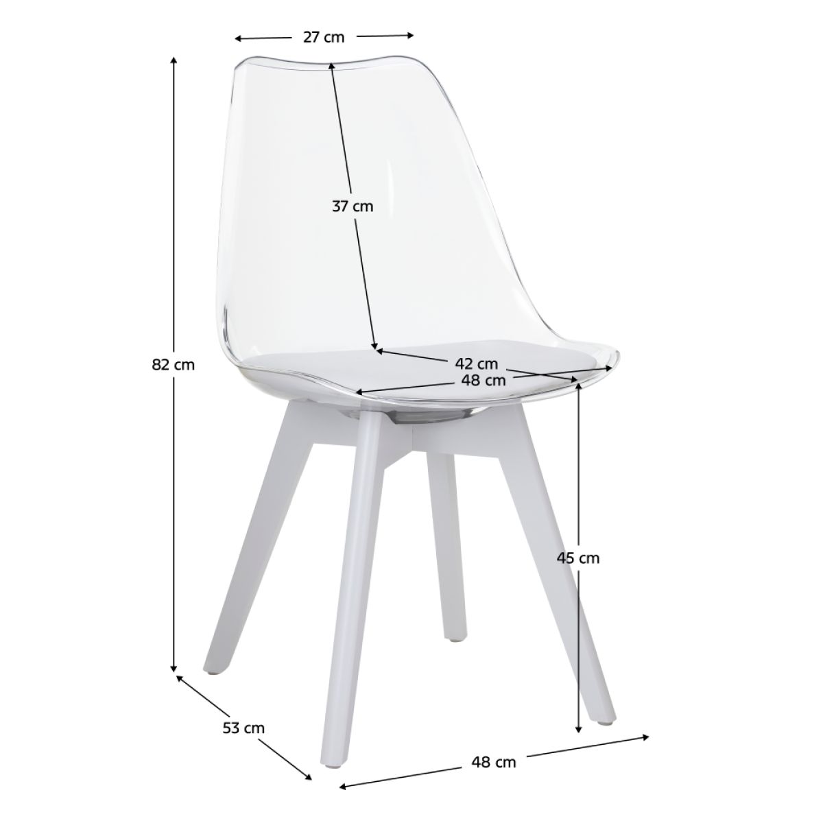 Material: acrilat/piele ecologică/metal/lemn de fag Rezistenţa ţesăturii la frecare conform testului Martindale: 100 000 abraziuni Culoare: transparent/alb/alb Dimensiuni (Lxlxh): 48x53x82 cm Înălţime scaun: 45 cm Adâncime parte de şezut: 42 cm Scaun extra moale Finisaj acrilic Portanţă: 100 kg Livrat dezasamblat
